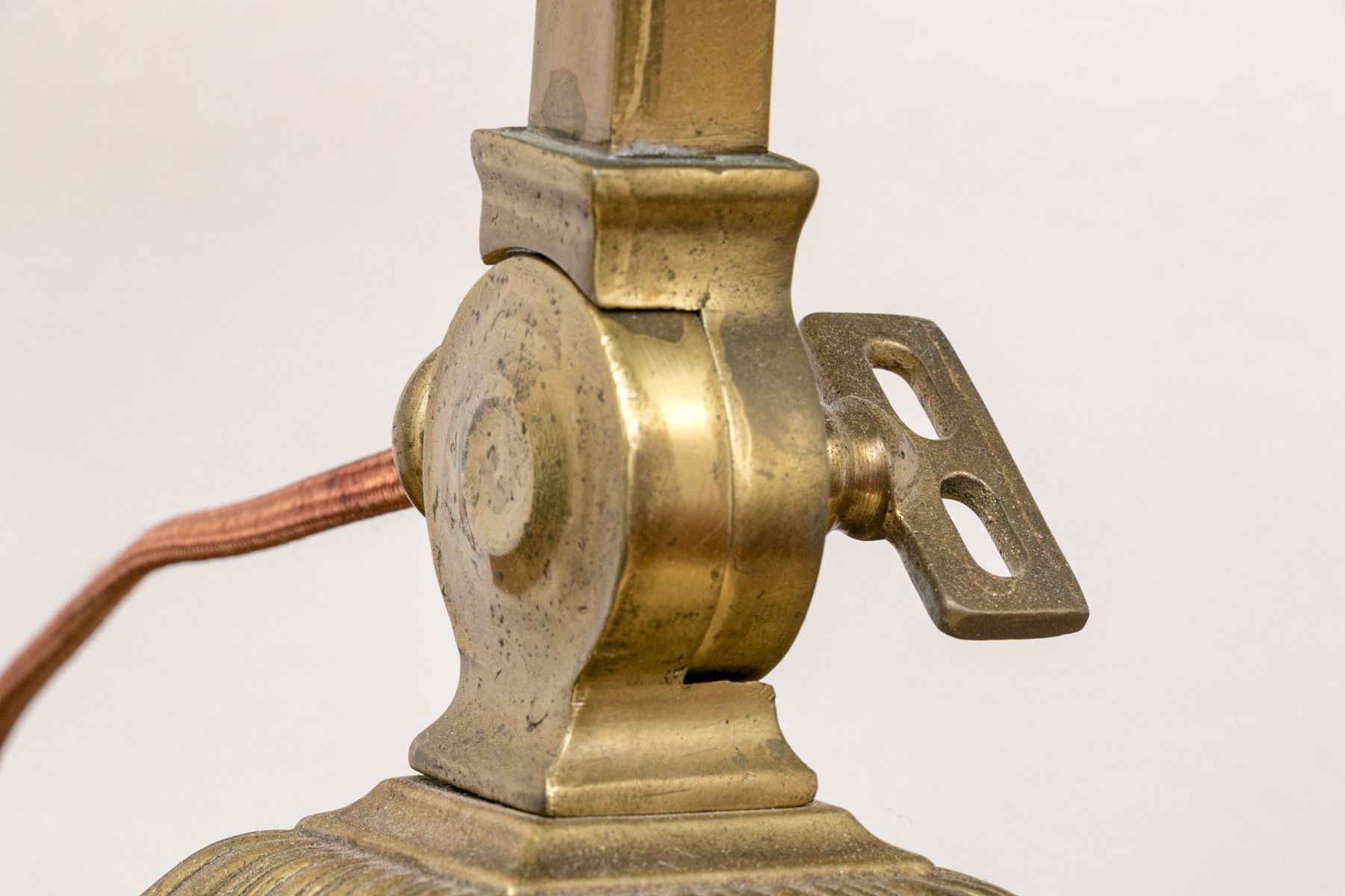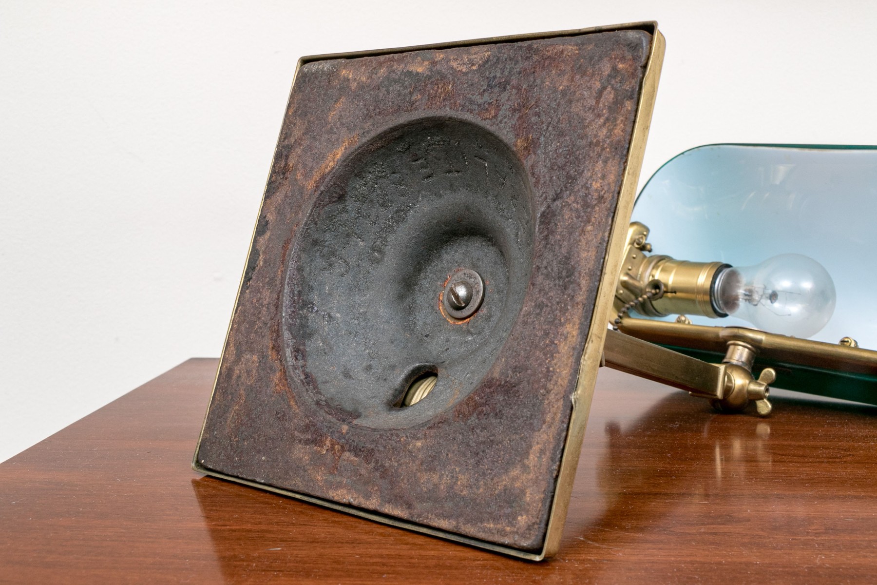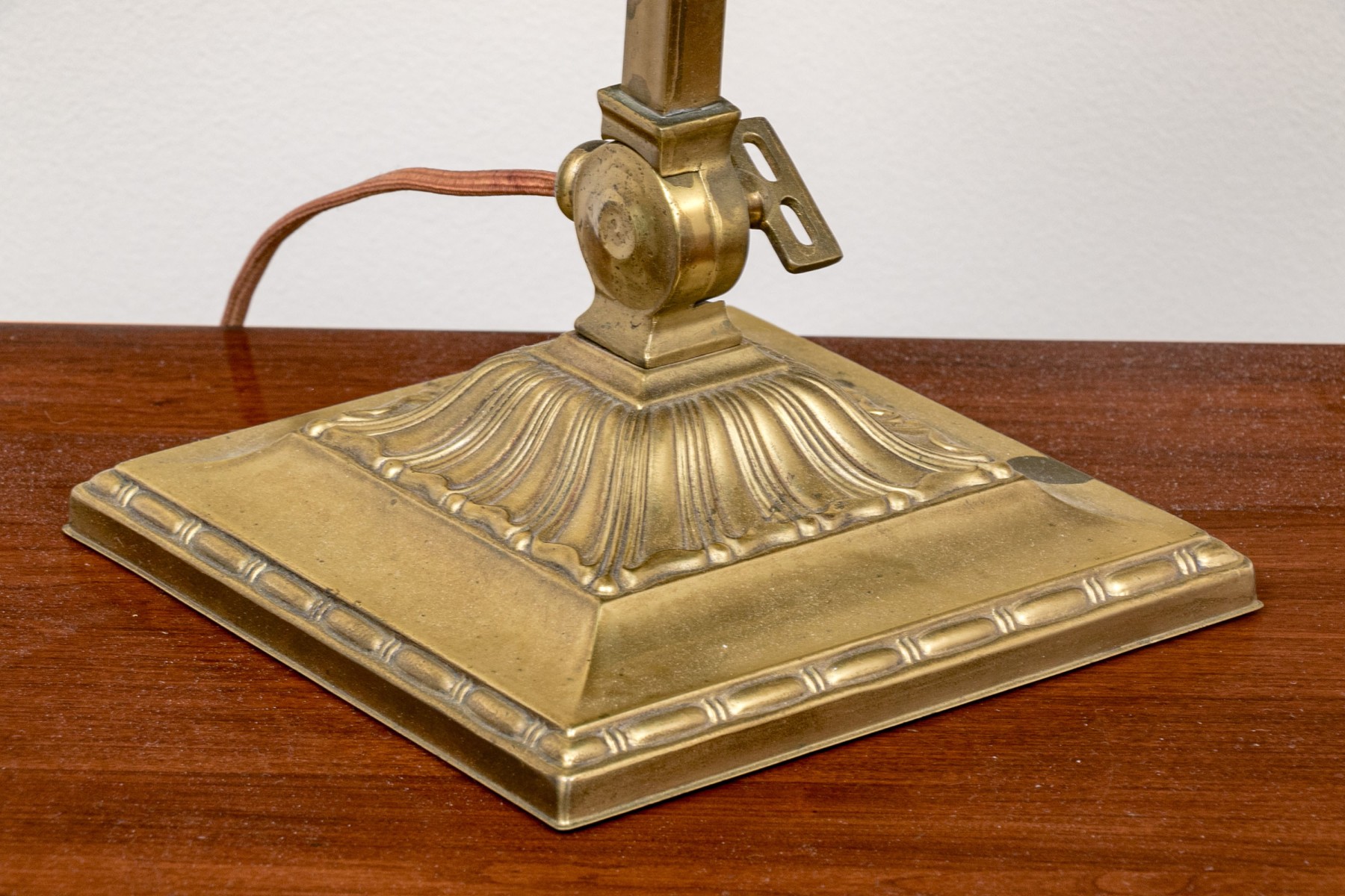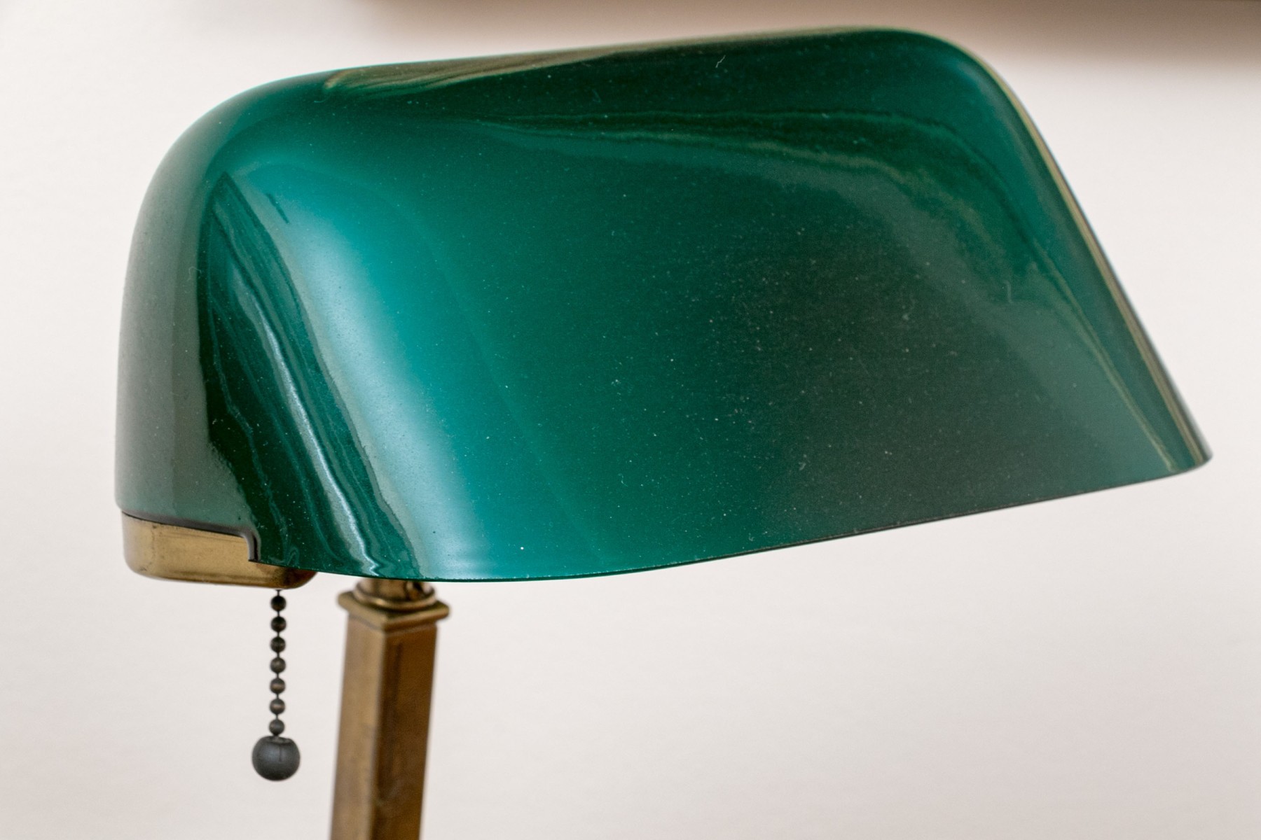 An antique Emeralite Banker's Lamp, bearing the number #8784 and retaining its original label, is equipped with an adjustable green glass shade. This classic lamp exudes vintage charm and functionality.