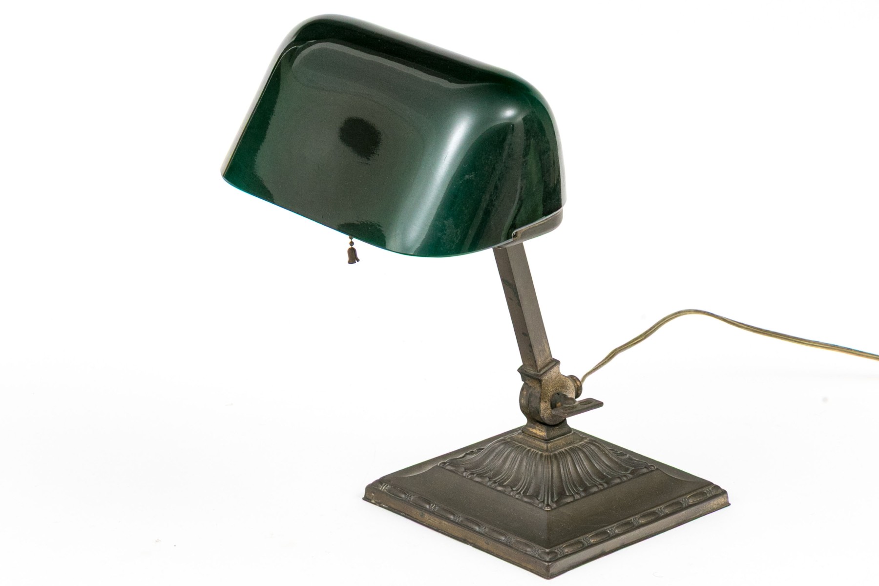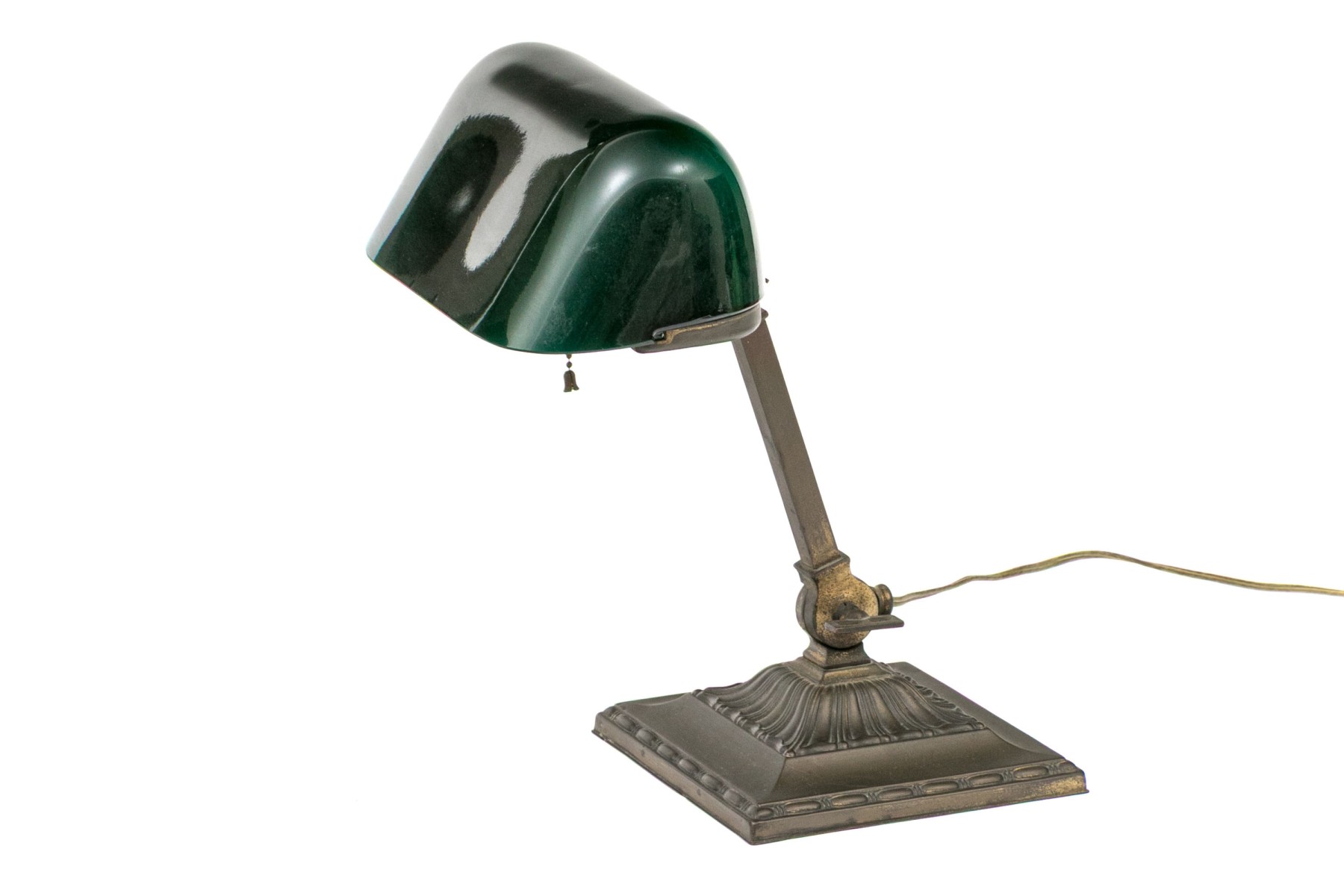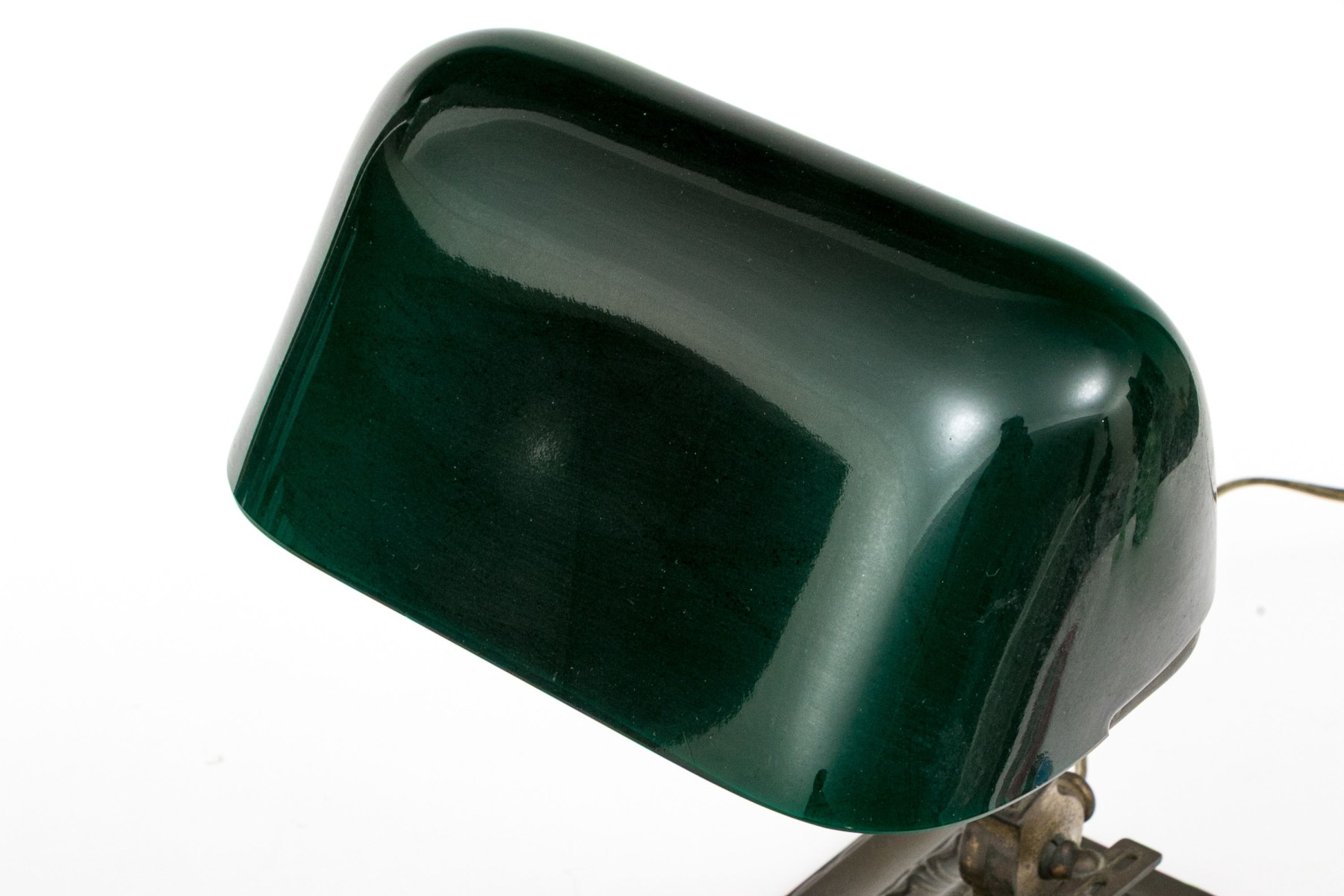 Classic green glass shade on hinged arm attached to a square form base with decorative details.