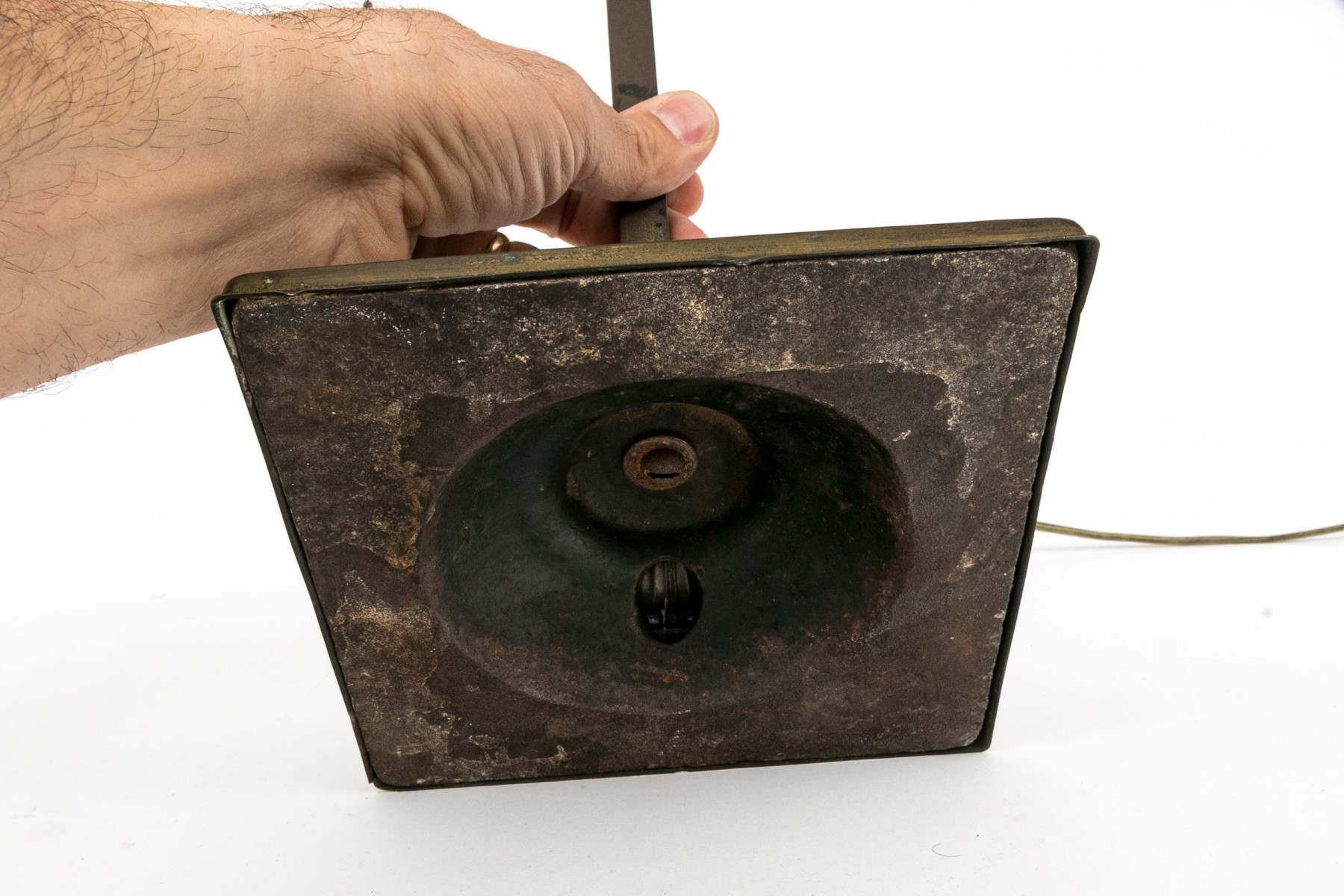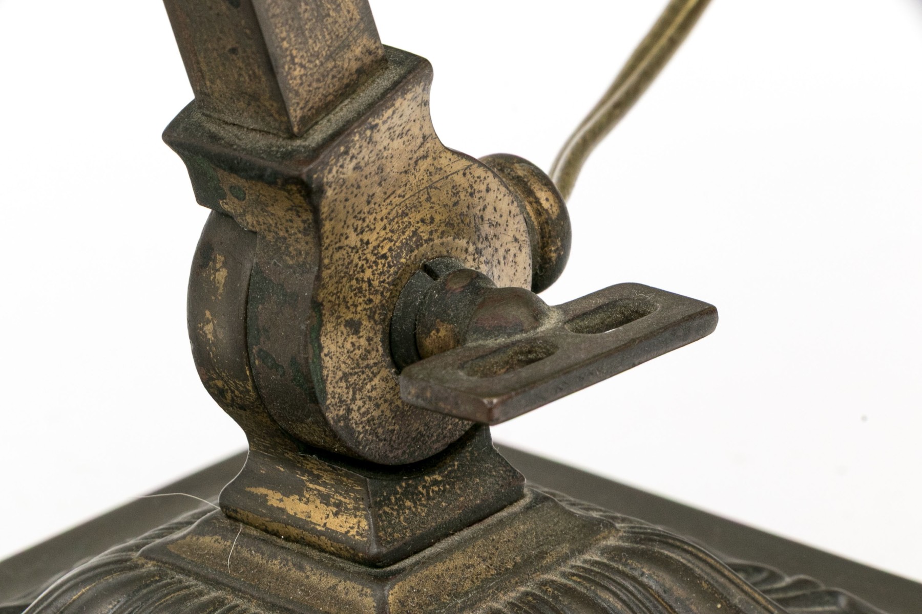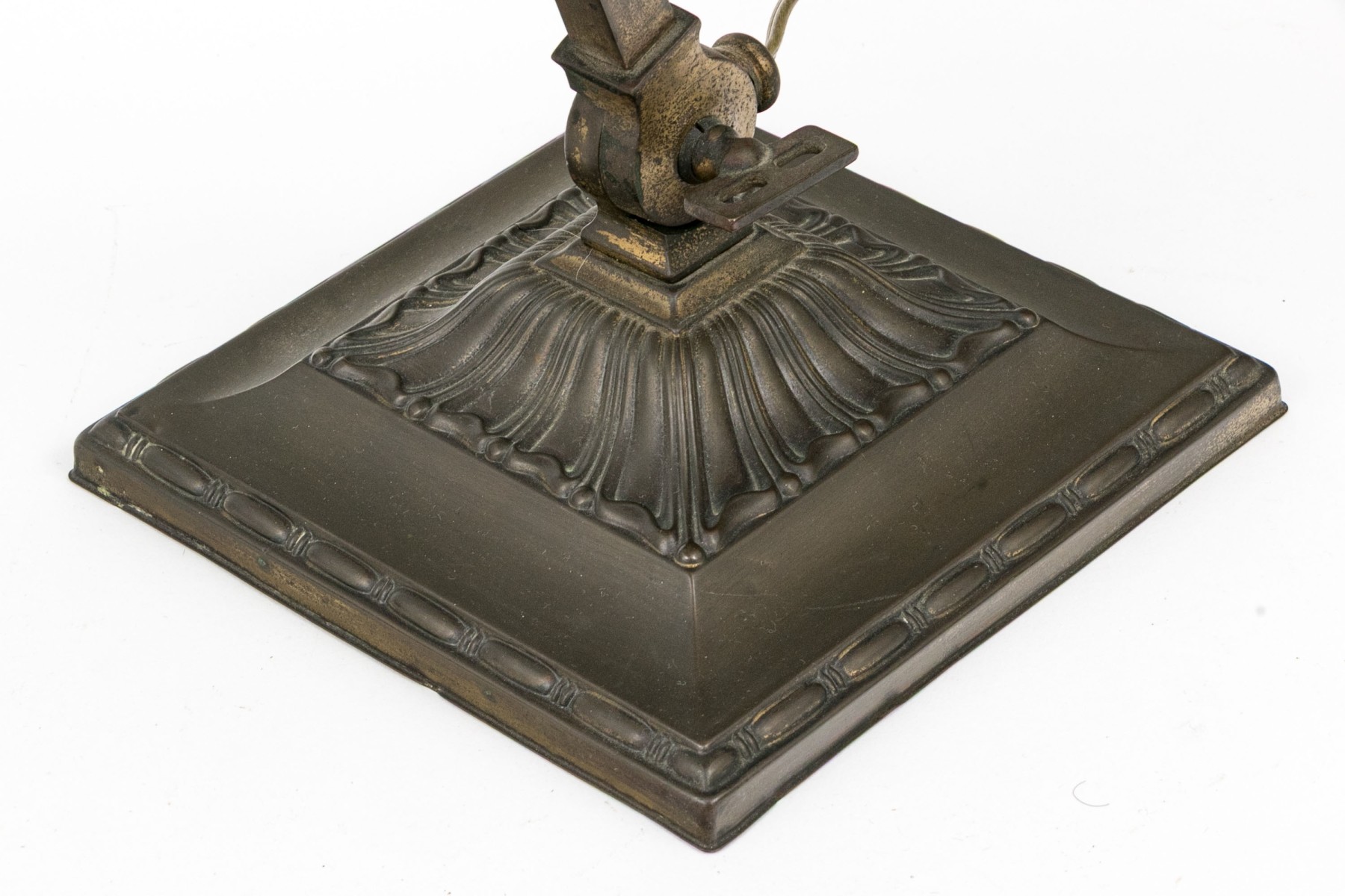 Classic green glass shade on hinged arm attached to a square form base with decorative details.