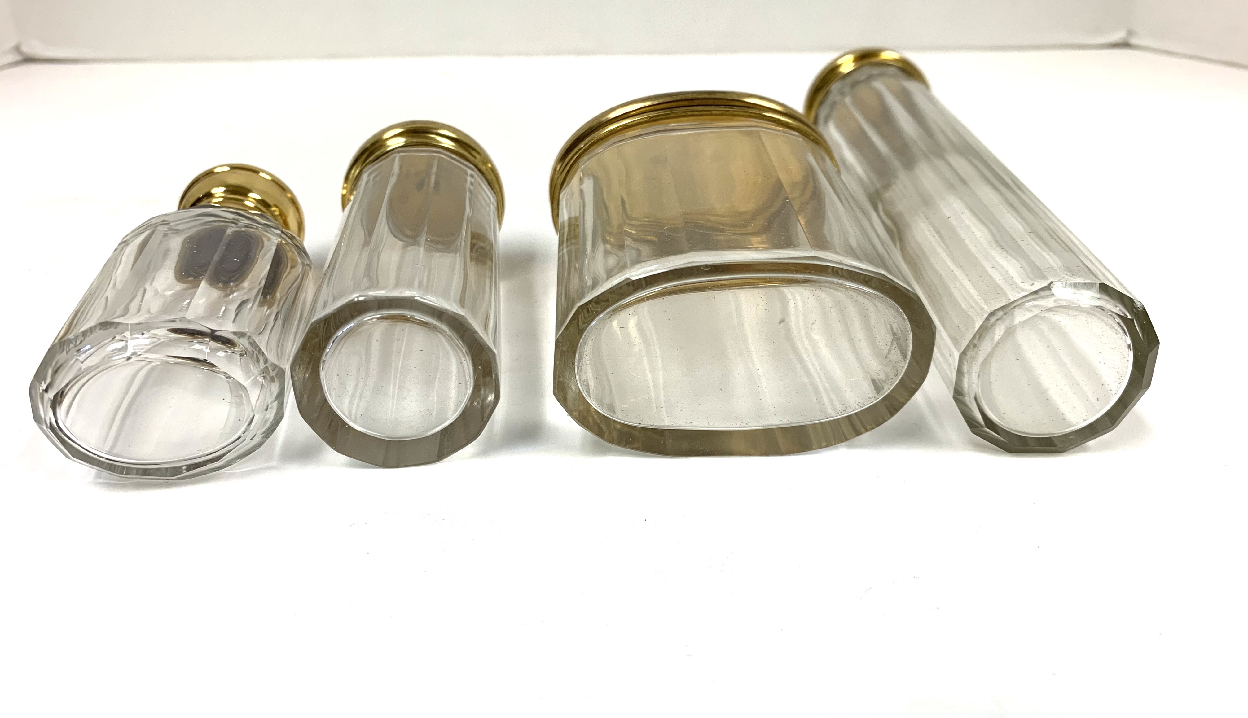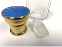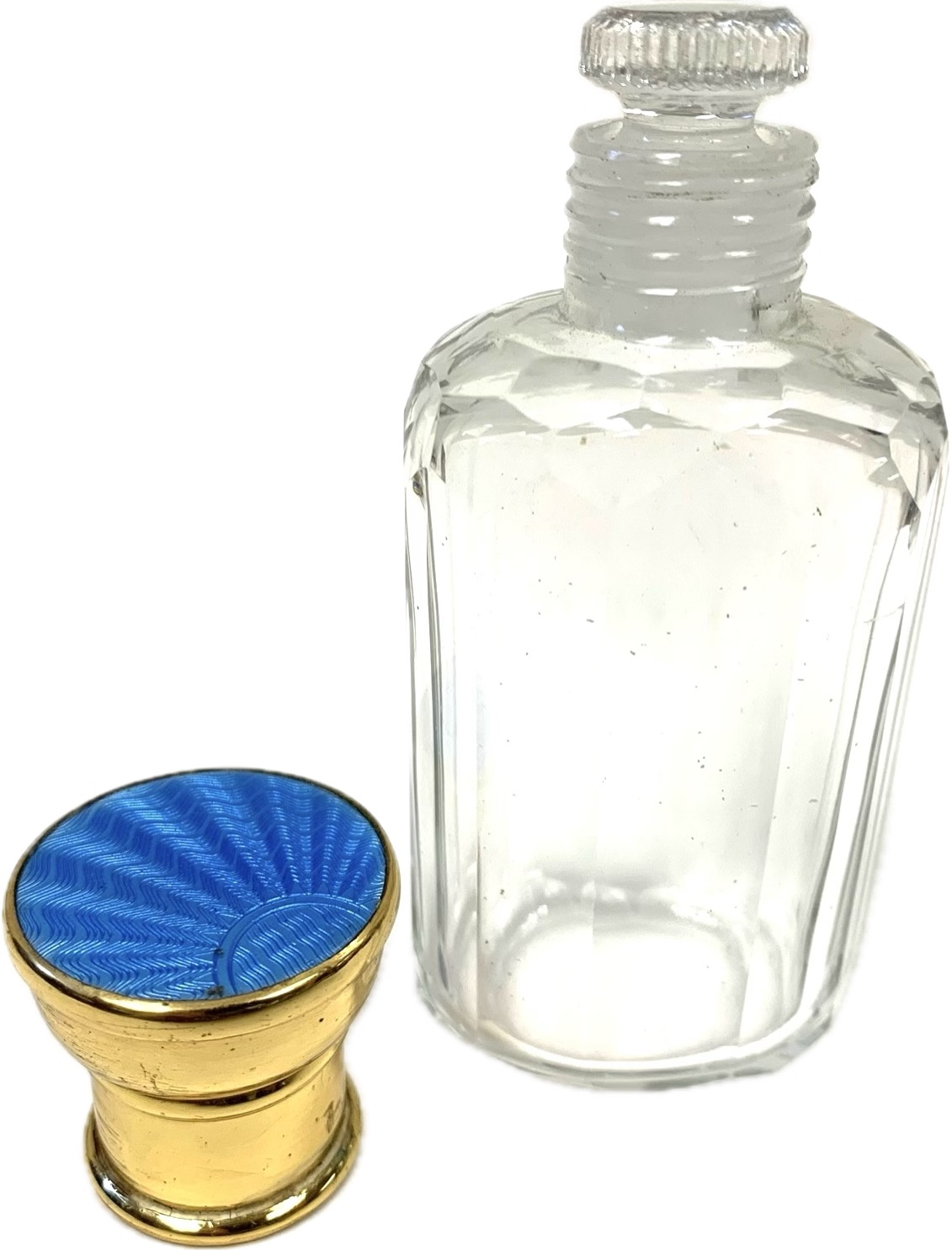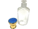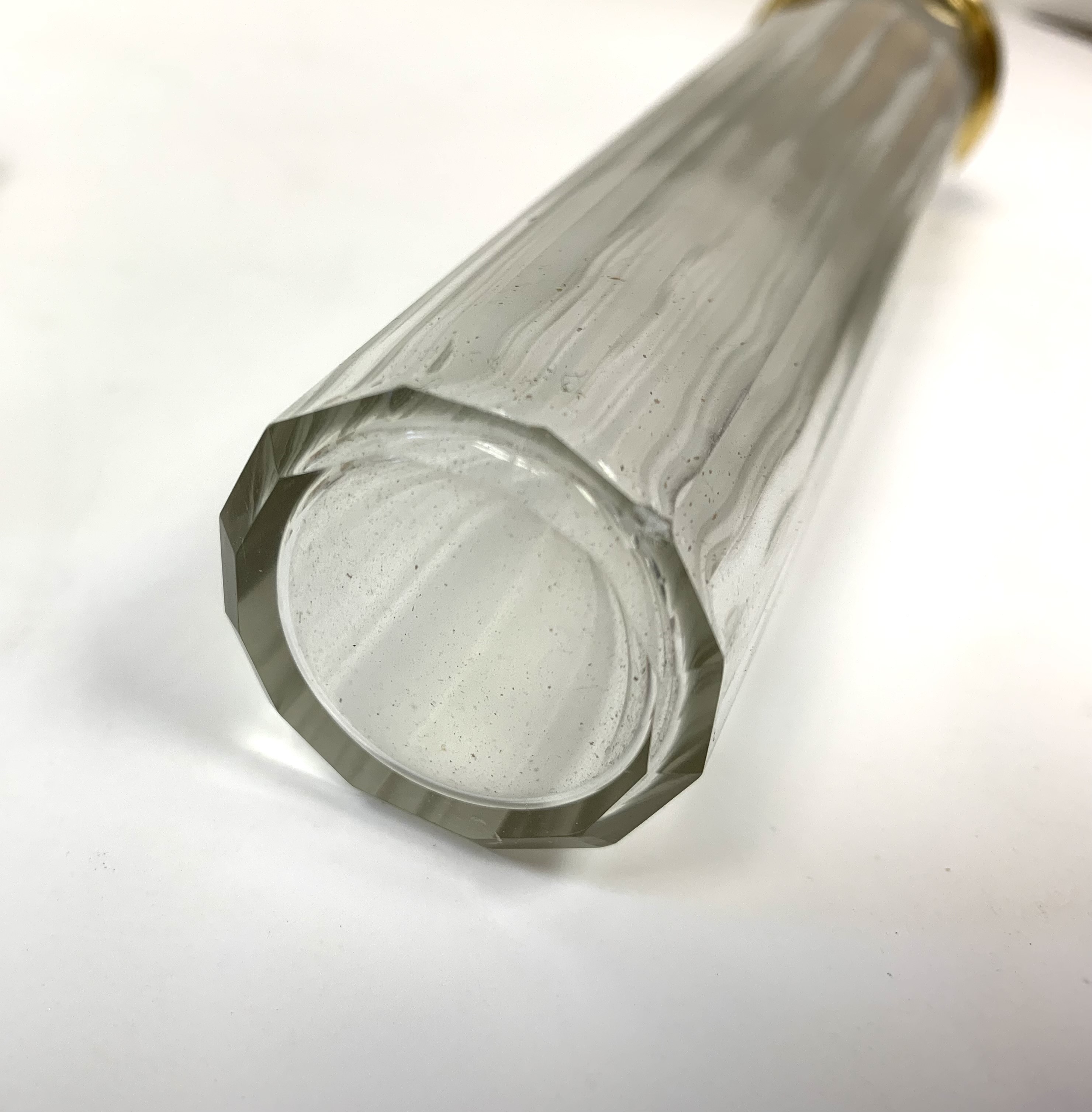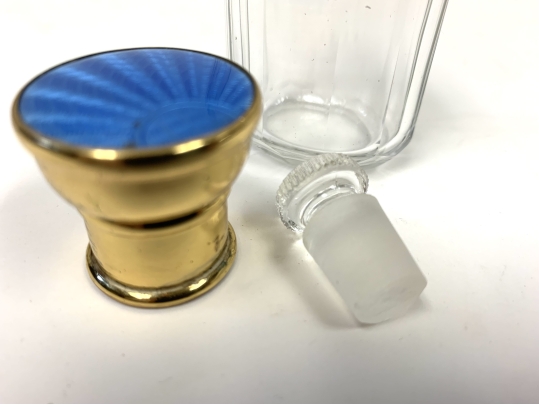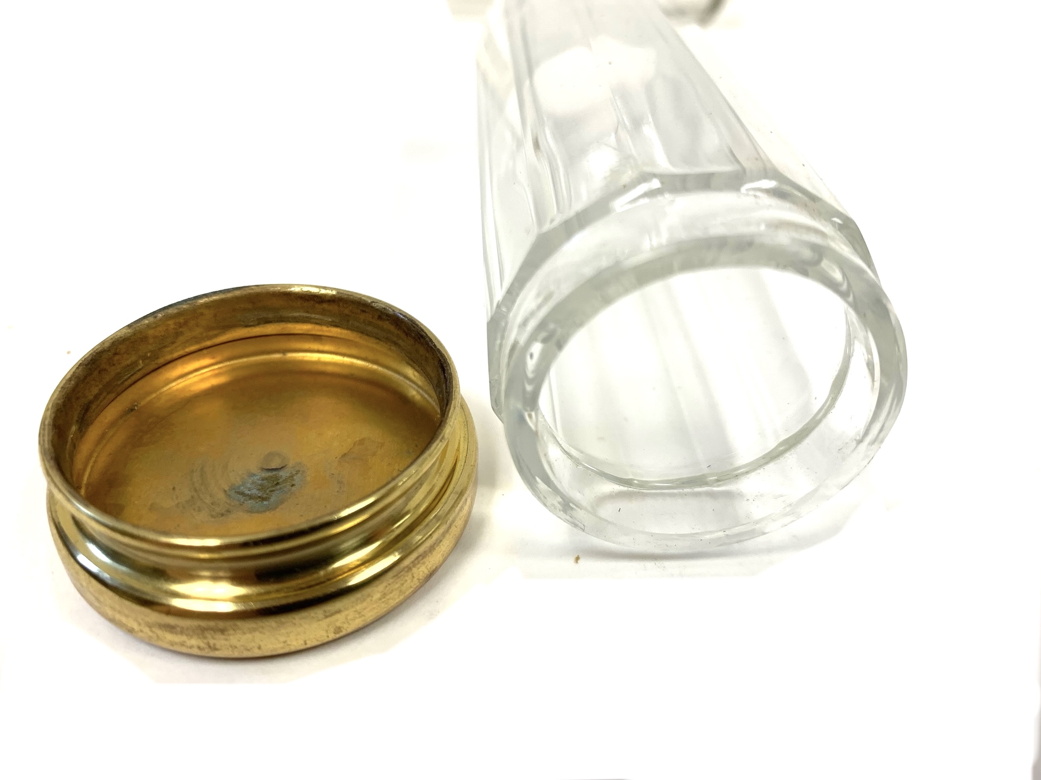 Perfume bottle with interior stopper, twist top, 4" H, 1 3/4" W (wear/discoloration to metal, no chips)
