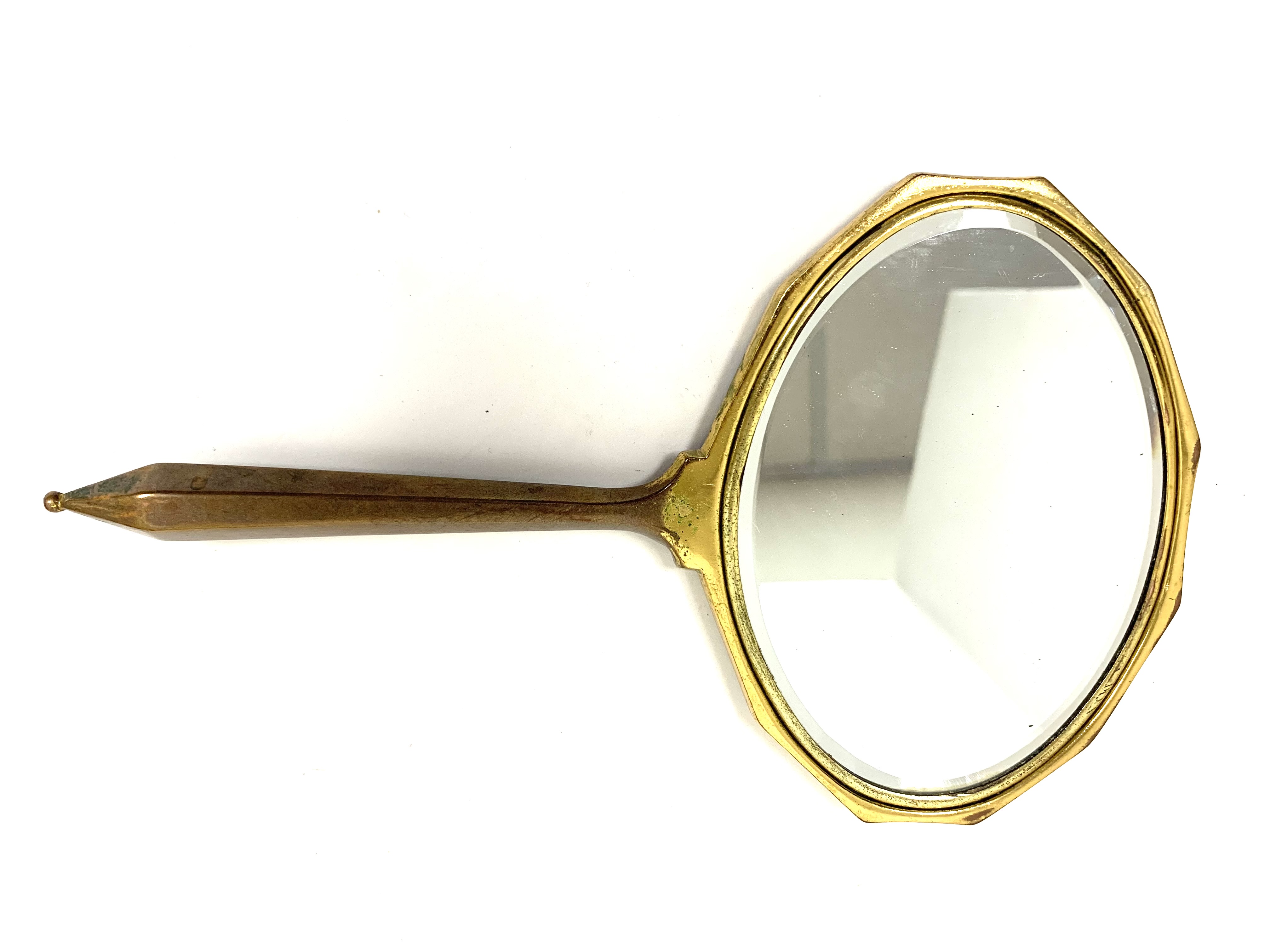 Hand mirror - 9 1/4" L x 5 1/2" W x 3/4" H (heavy worn handle, discoloration & verdigris to metal)