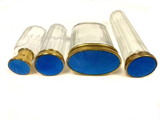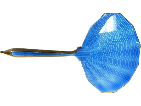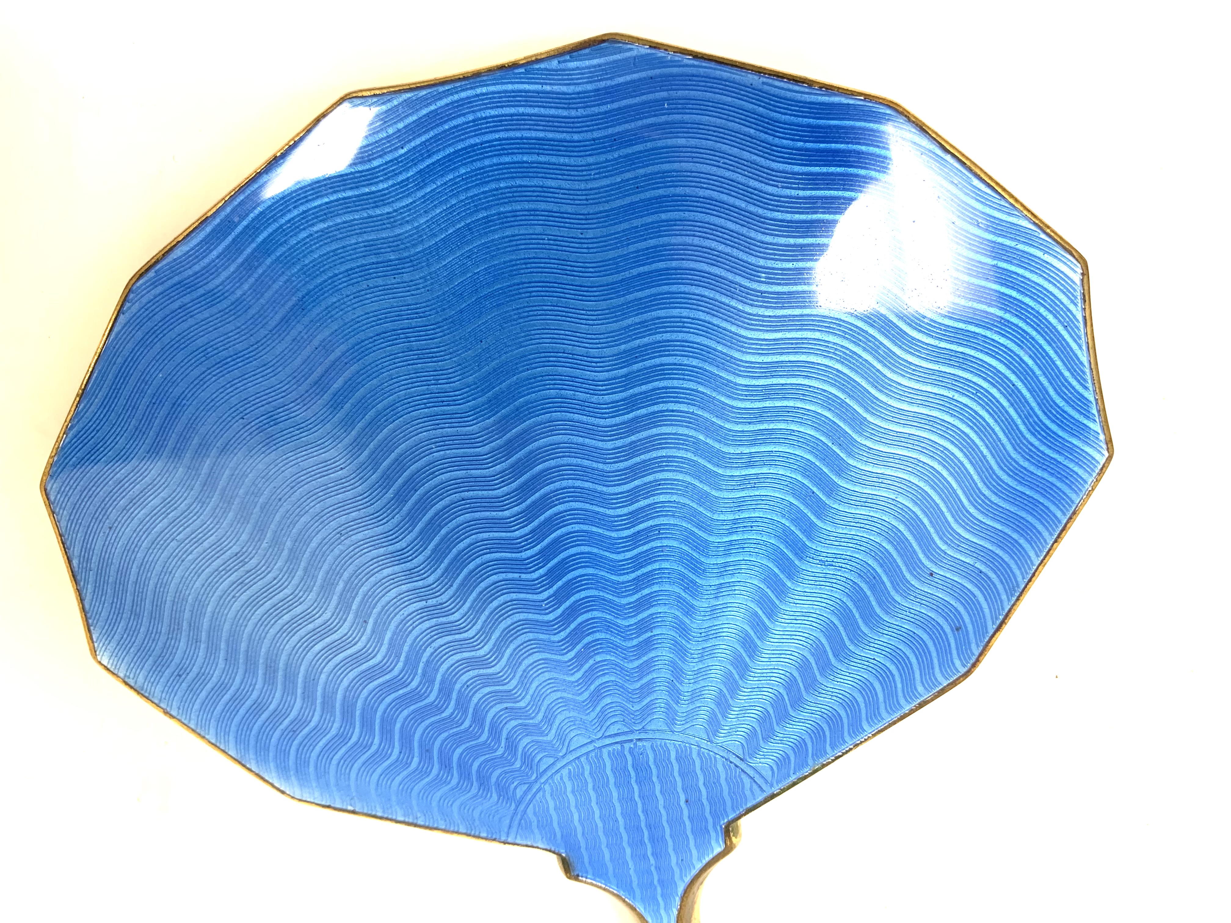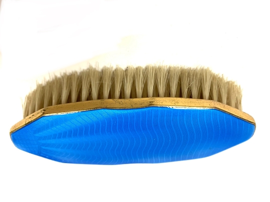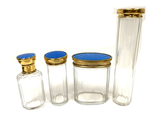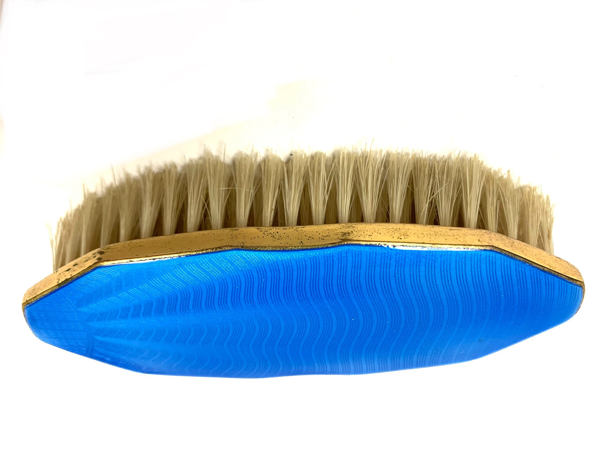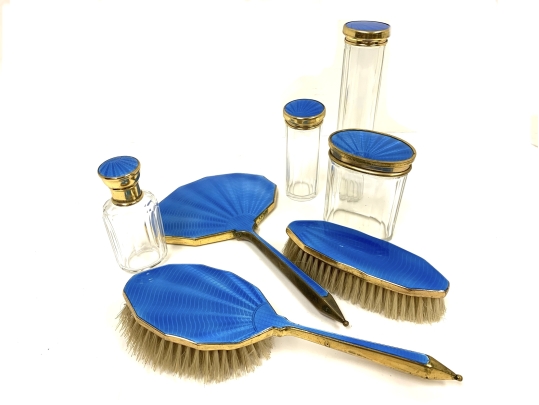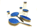 Antique guilloche enamel dresser set comprised of a hand mirror, hair brush, lint brush, 3 bottles and a lidded perfume bottle. The pieces with a vibrant blue color and goldtone metal trim. The perfume bottle comes with an inside stopper as shown.