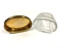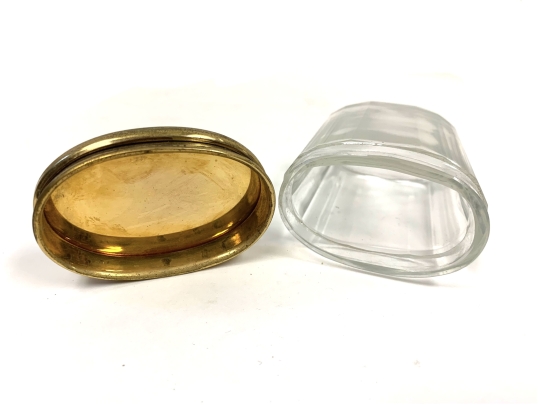 Smallest oval bottle with pull off lid - 2 7/8" W, 1 7/8" D x 3 1/2" H (miniscule flea bites to bottom)