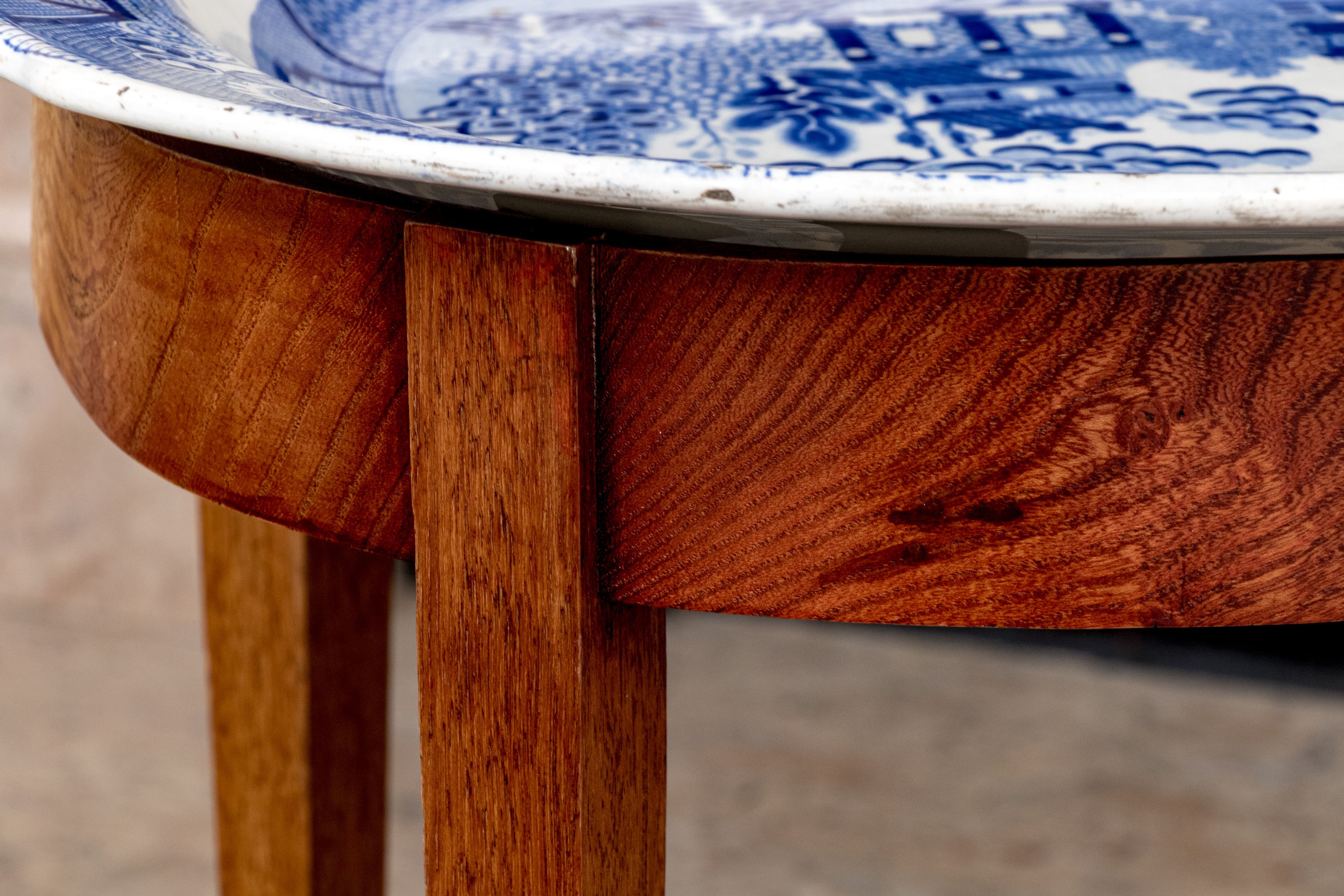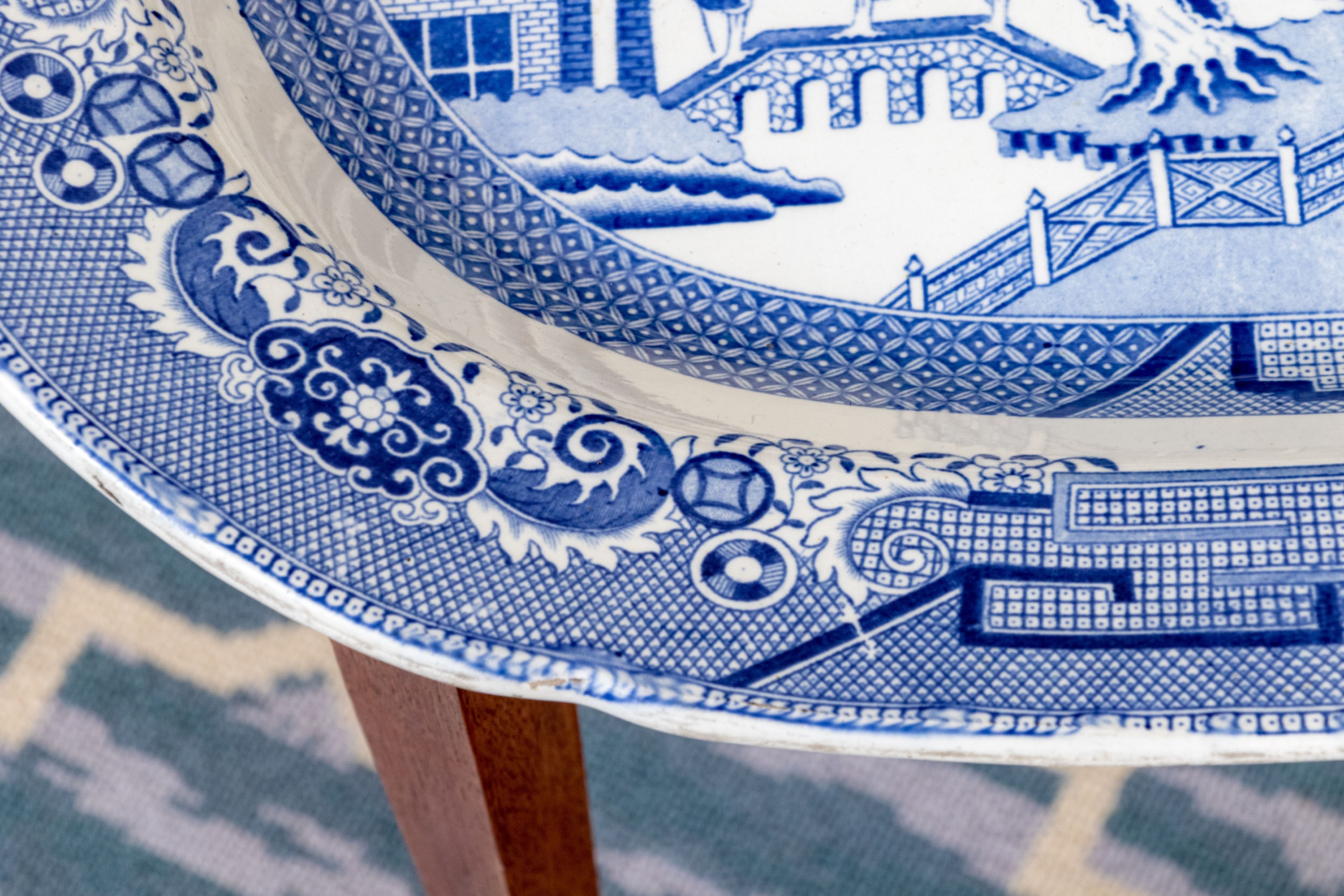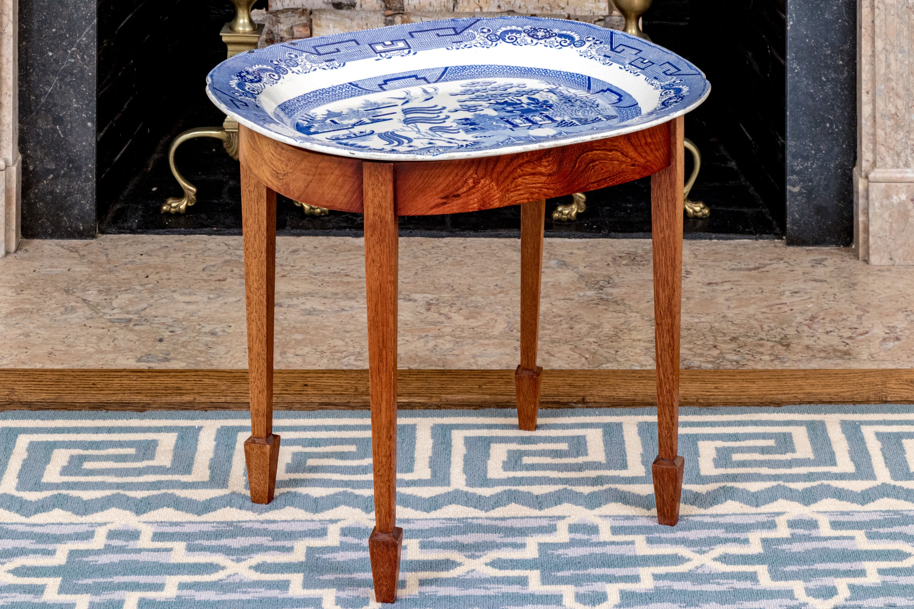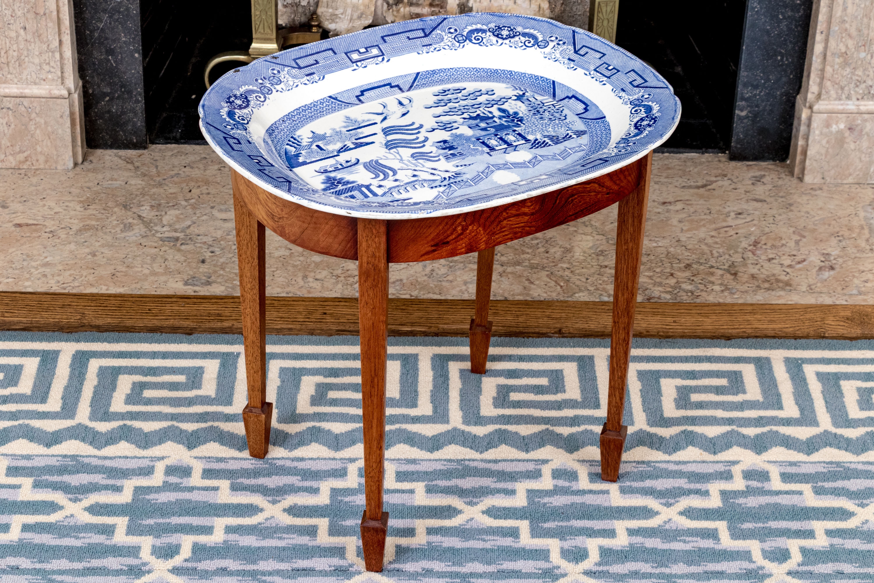 A fantastic antique English tray table featuring a large oval ceramic platter decorated with classic Blue Willow transferware showcasing a sloping cheek, wide rim, and bracketed design. The tray fits atop a stately Hepplewhite style stand in a warm brown finish, well constructed with straight tapered legs on spade feet.