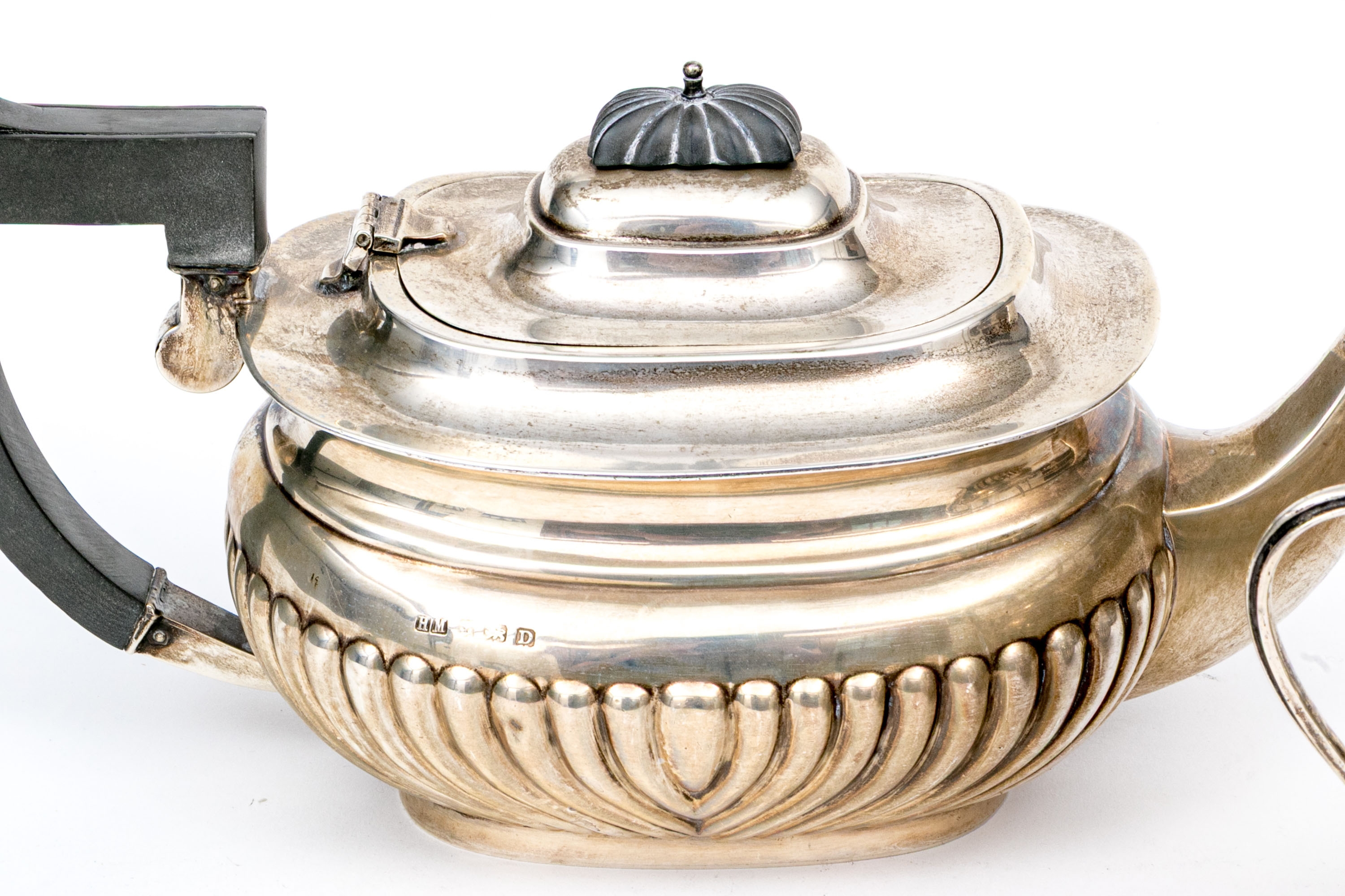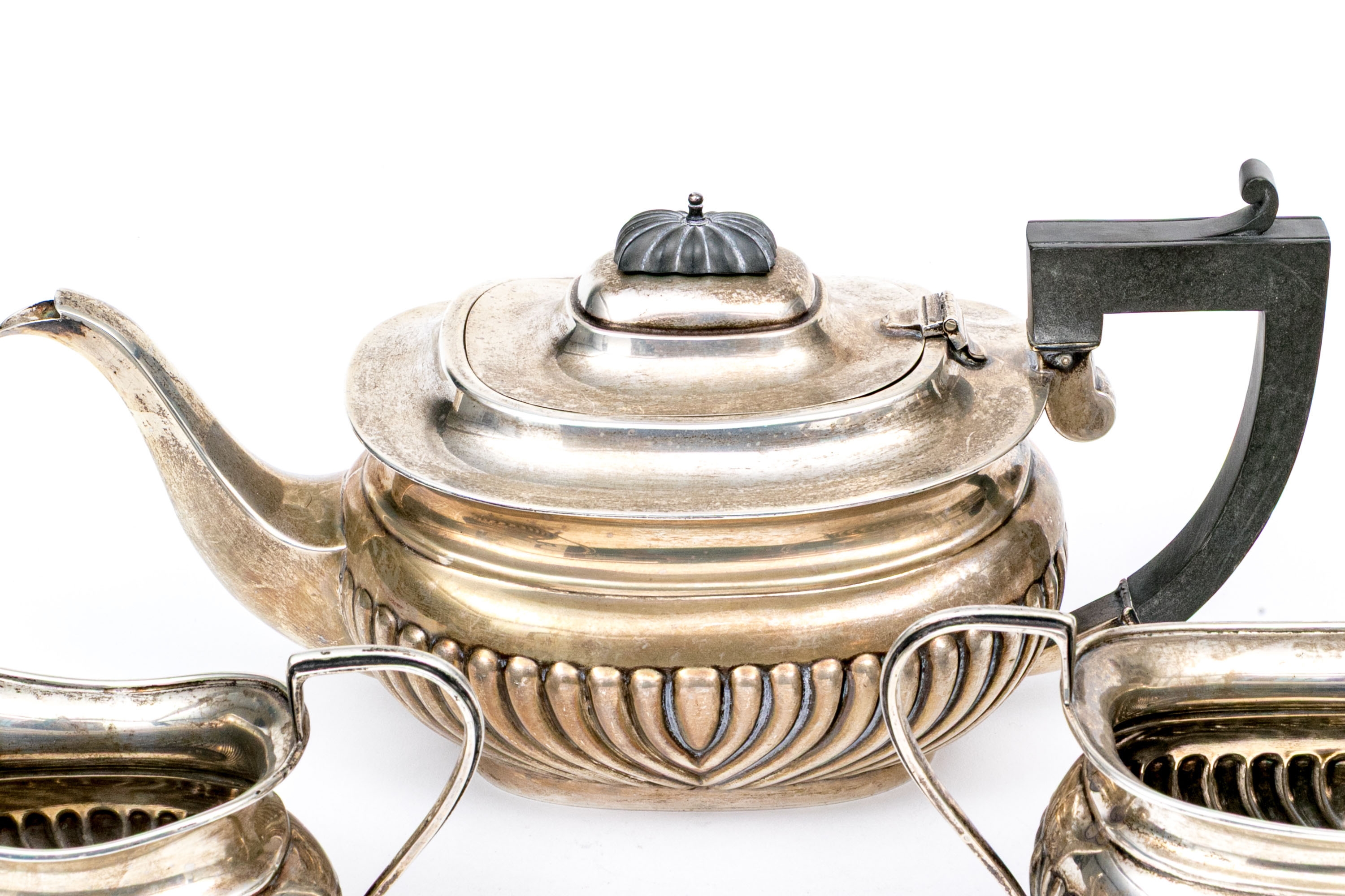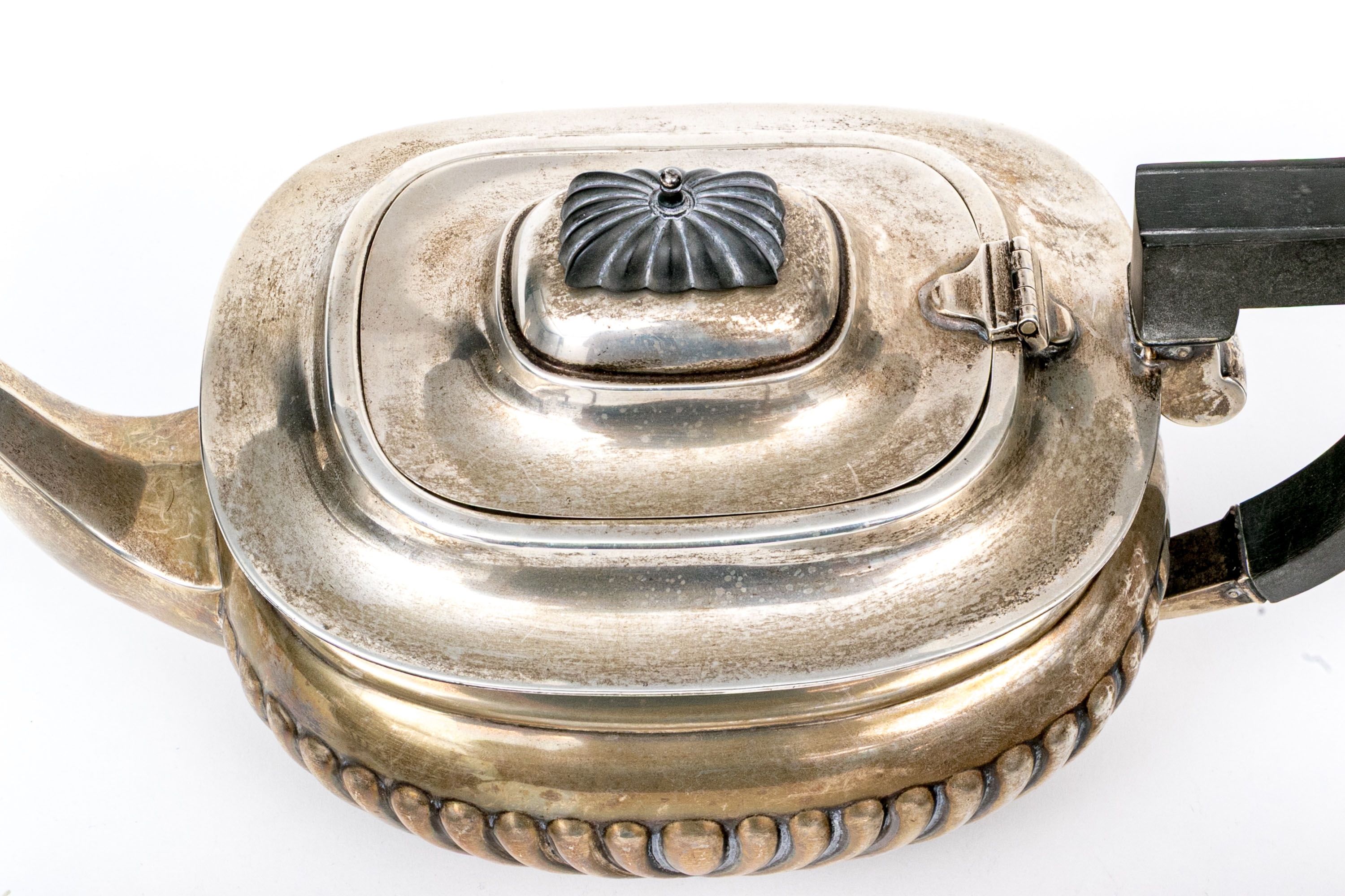 A handsome antique English Georgian style sterling silver tea service with oval forms, nicely gadrooned bottoms, and stout raised feet. The teapot features black decoration on the hinged lid finial and a shapely bracket handle.
