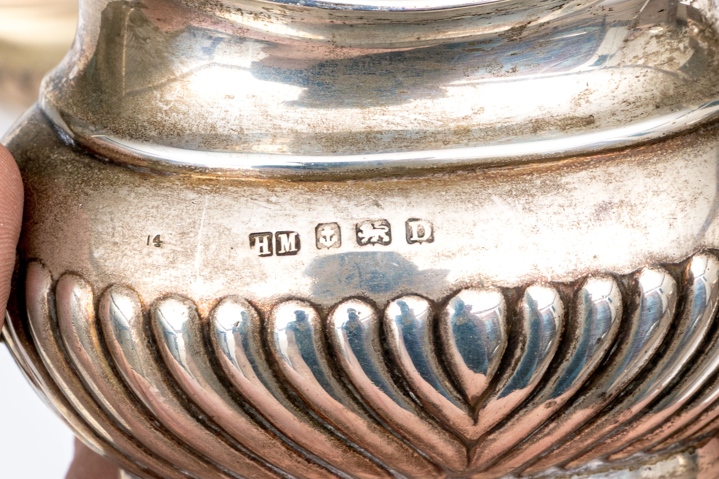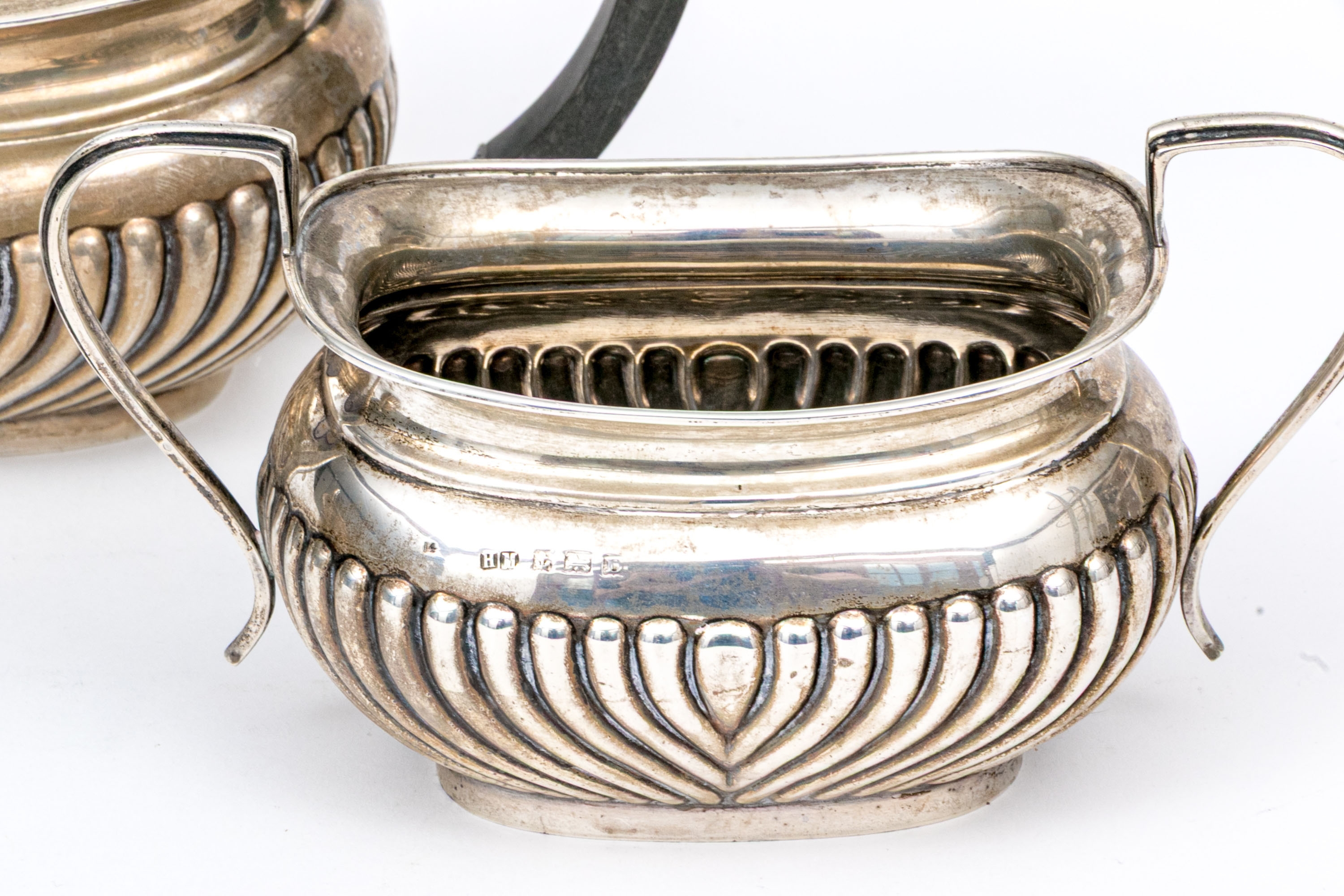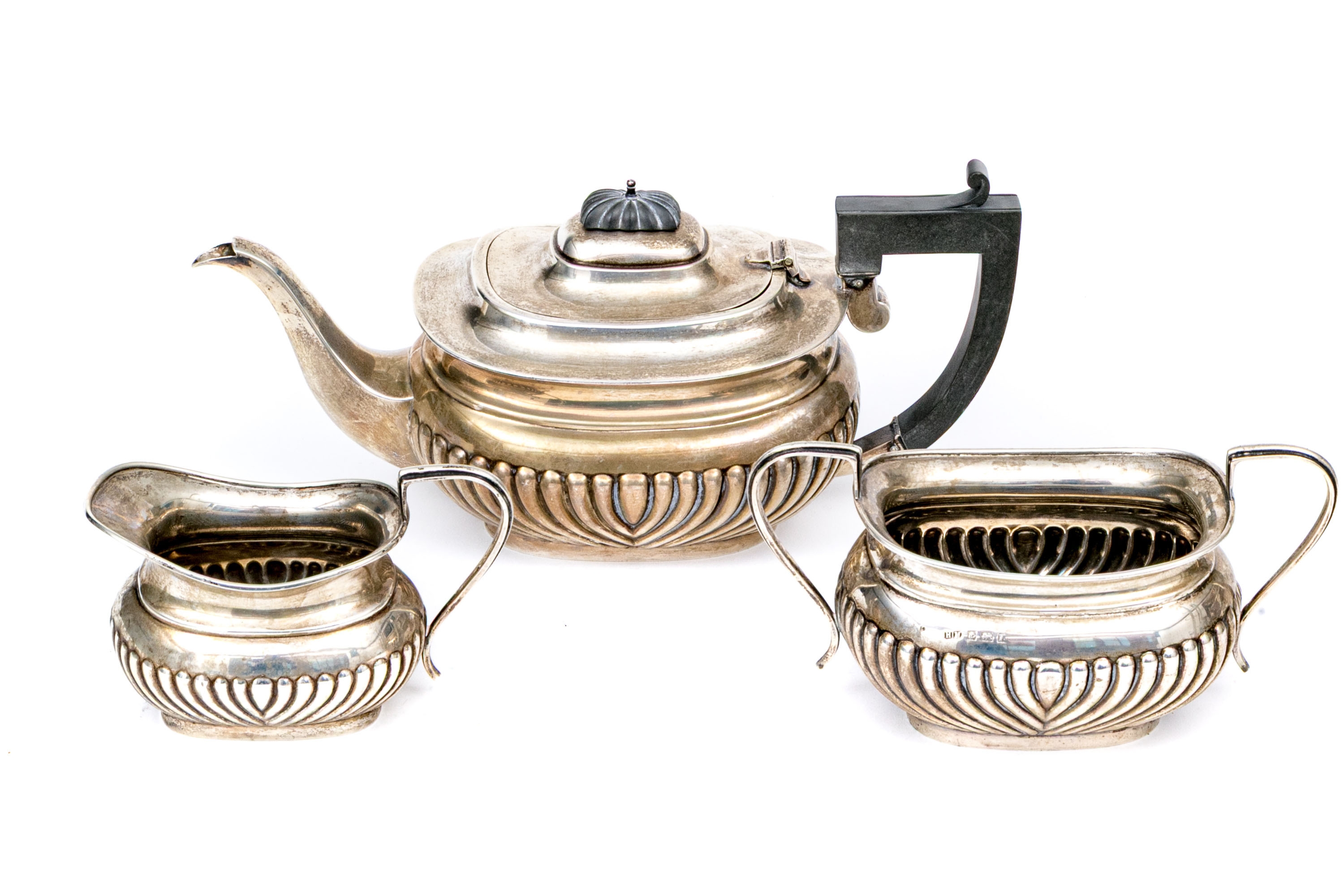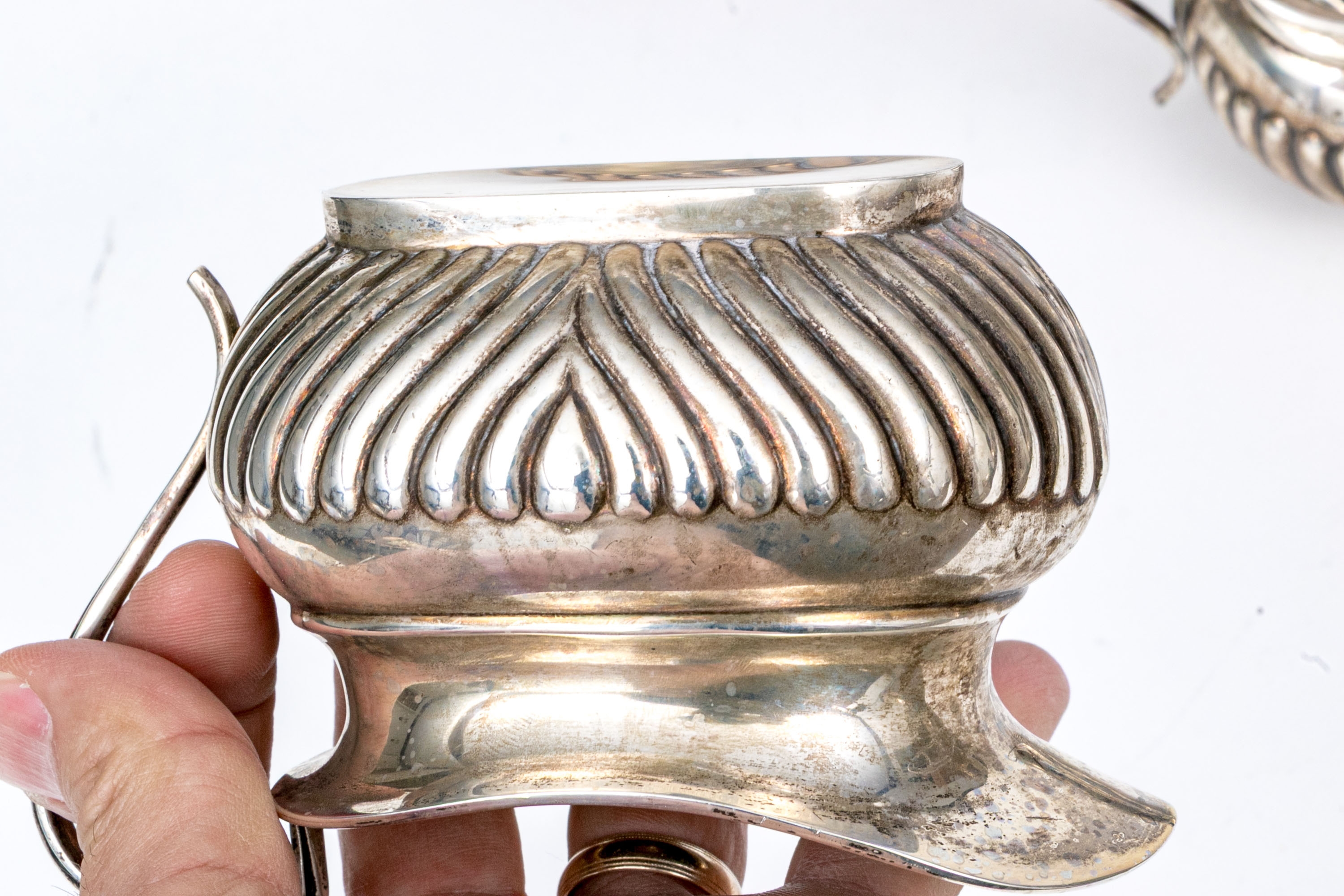 A handsome antique English Georgian style sterling silver tea service with oval forms, nicely gadrooned bottoms, and stout raised feet. The teapot features black decoration on the hinged lid finial and a shapely bracket handle.