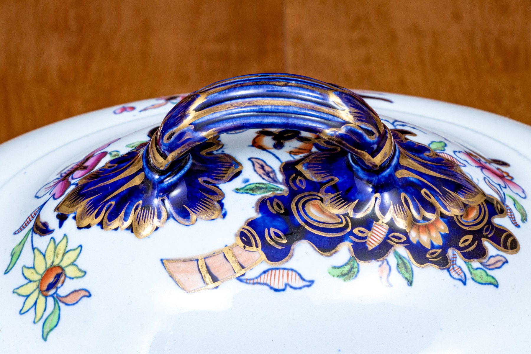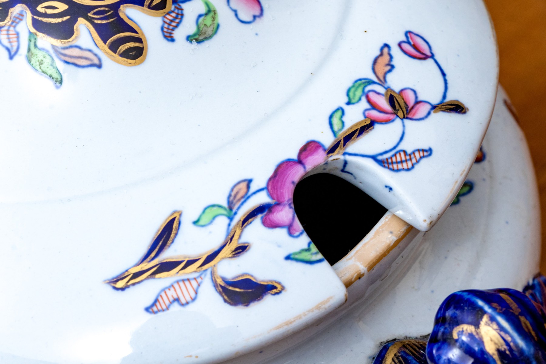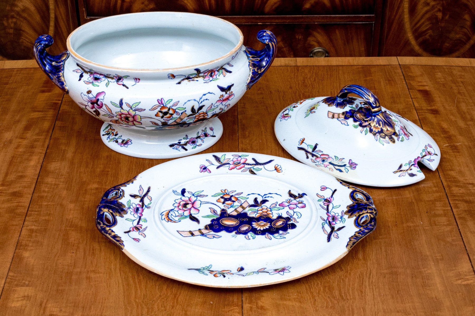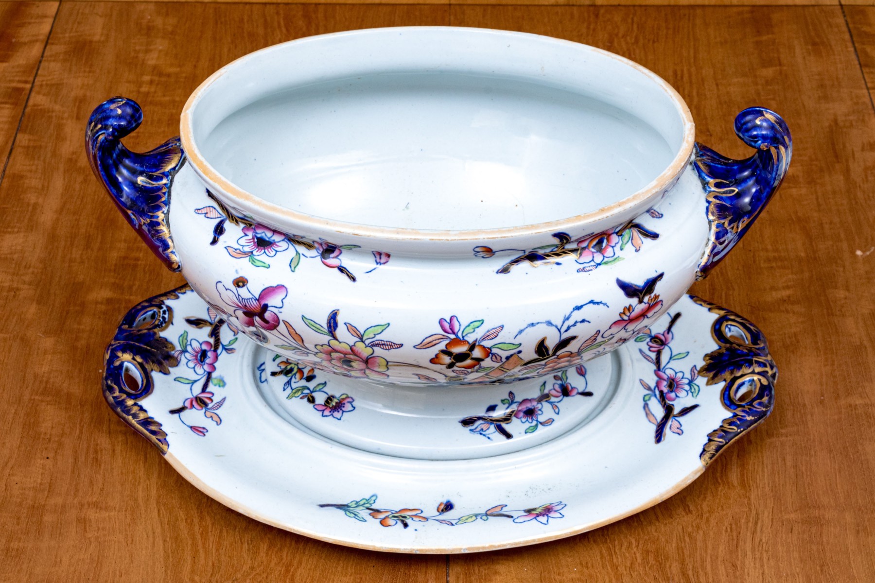 Indistinct blue mark on the bottom. The set decorated in an Imari inspired floral pattern in red and blue on white with gilt details. The tureen and underplate with cobalt blue and gilt leafy hand;es.