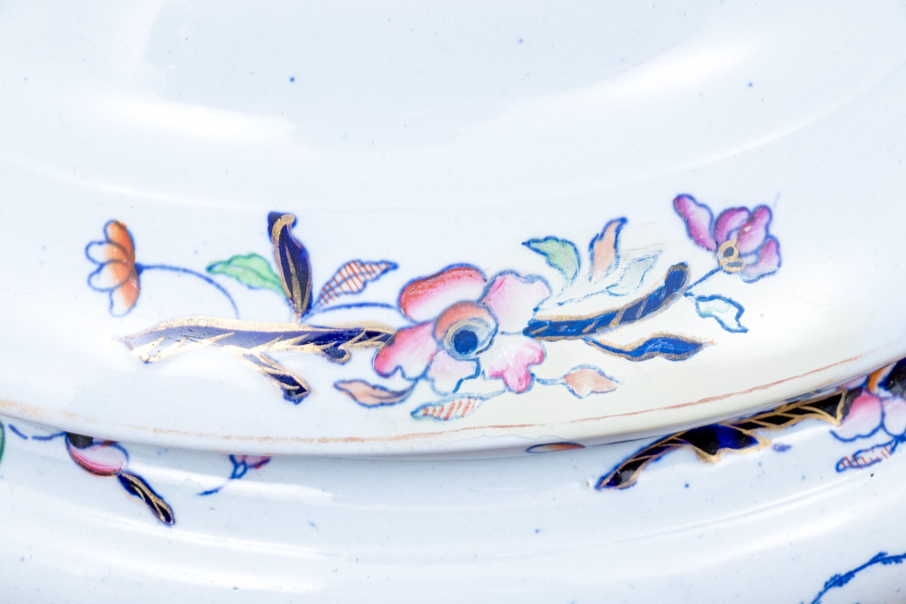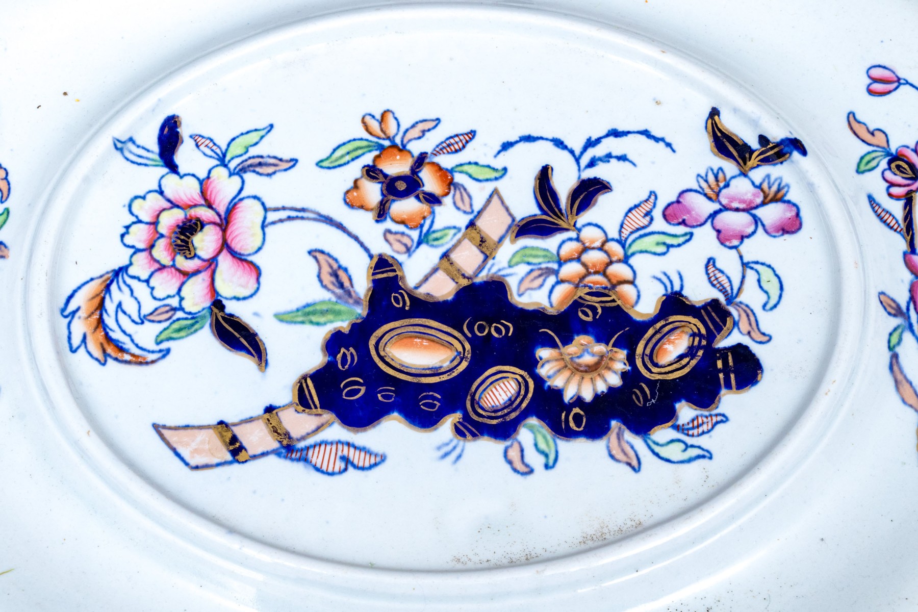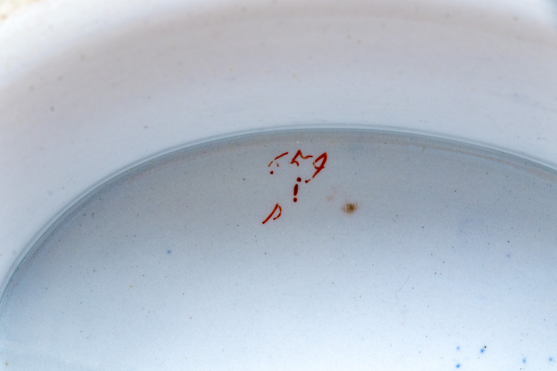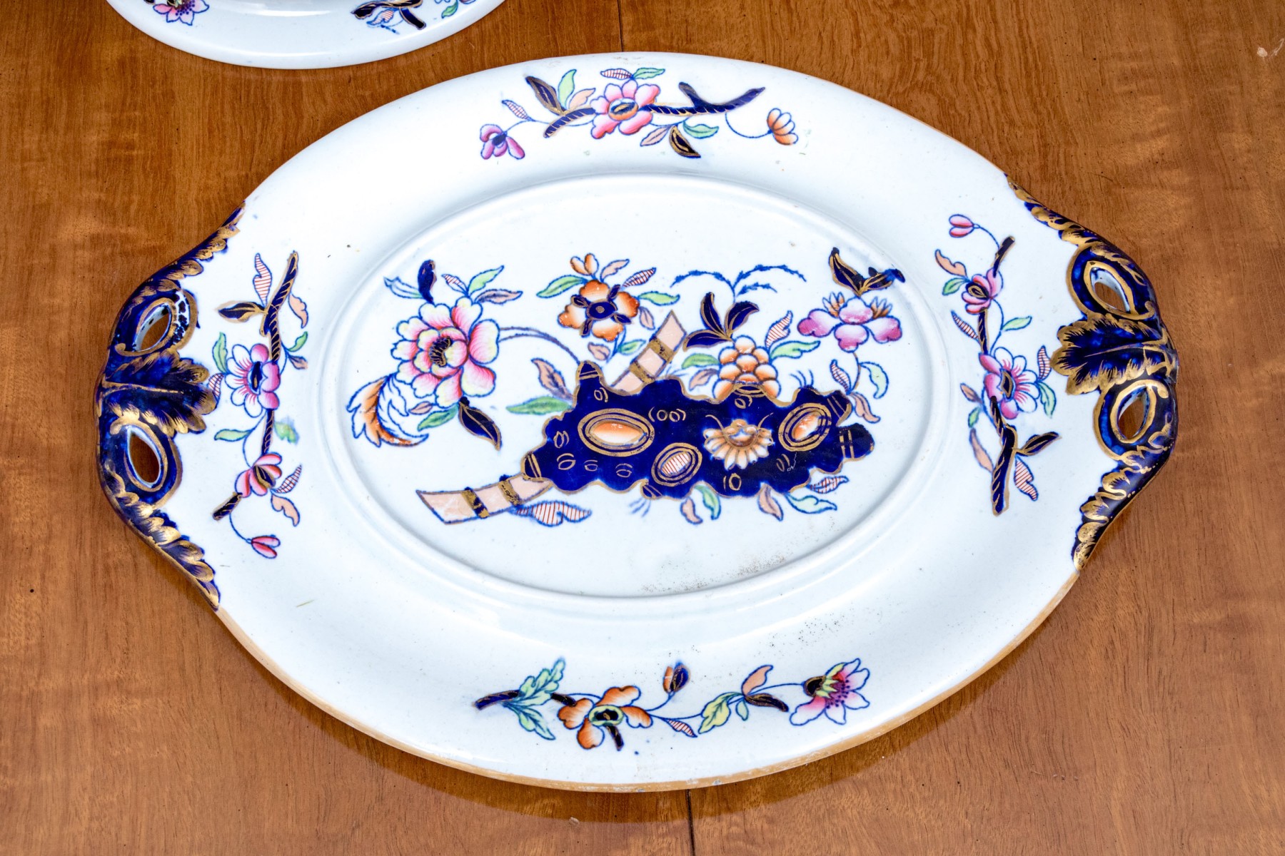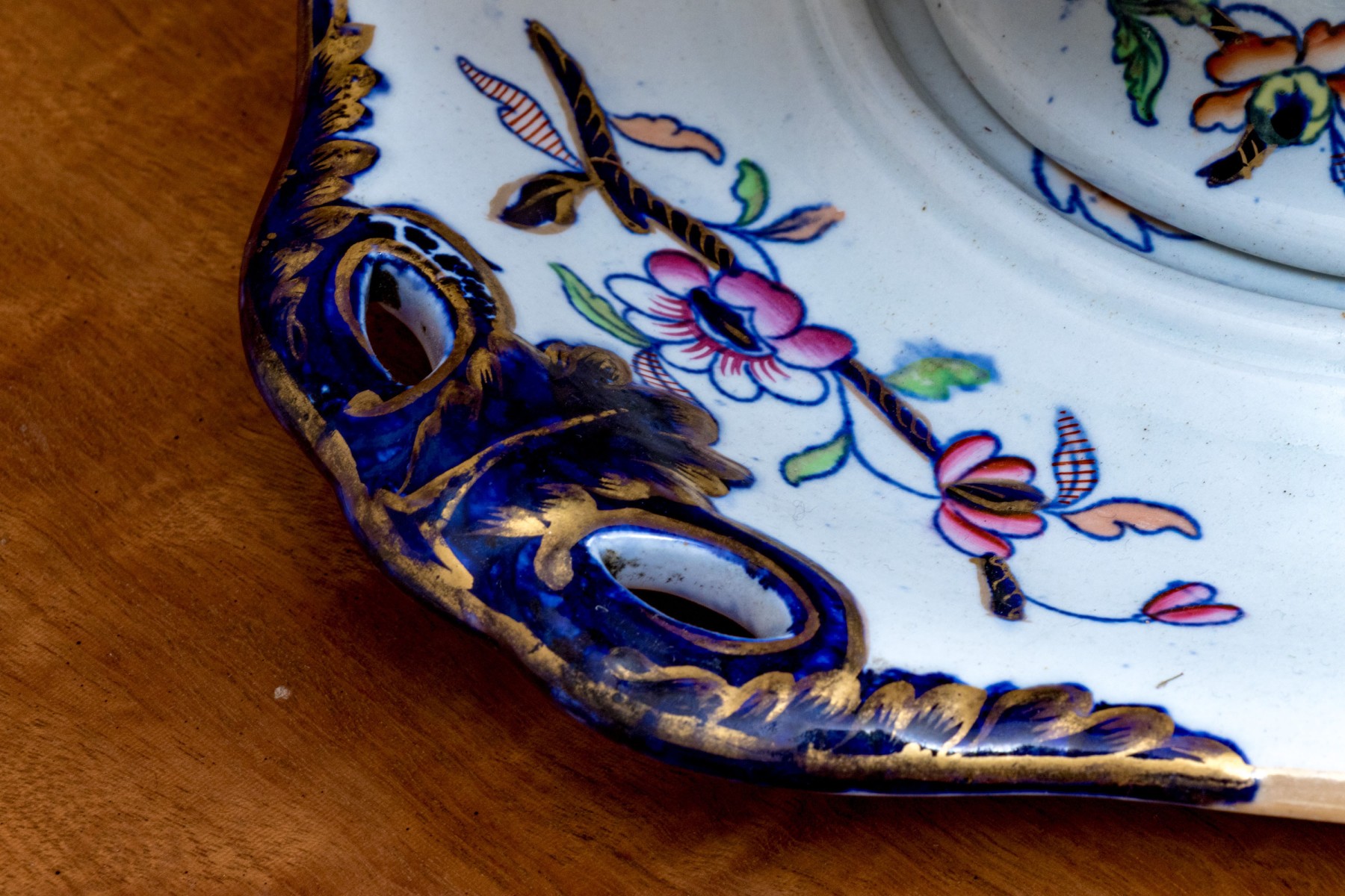 Indistinct blue mark on the bottom. The set decorated in an Imari inspired floral pattern in red and blue on white with gilt details. The tureen and underplate with cobalt blue and gilt leafy hand;es.