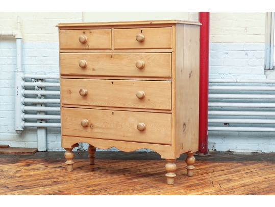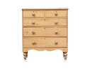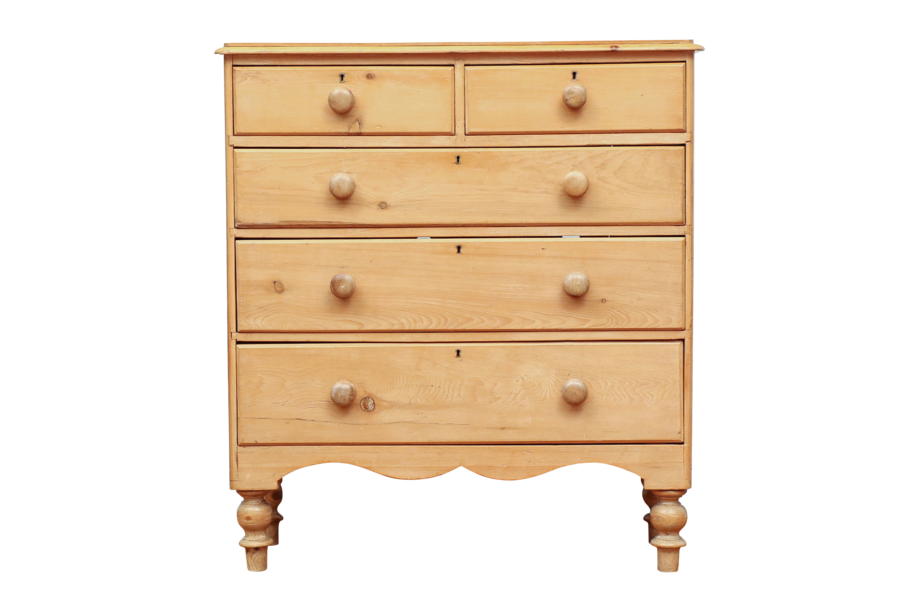 Two short over three graduated long drawers, all with brass keyholes (lacking keys) and knob pulls. A nicely carved top edge and shaped lower frame. Raised on turned feet.