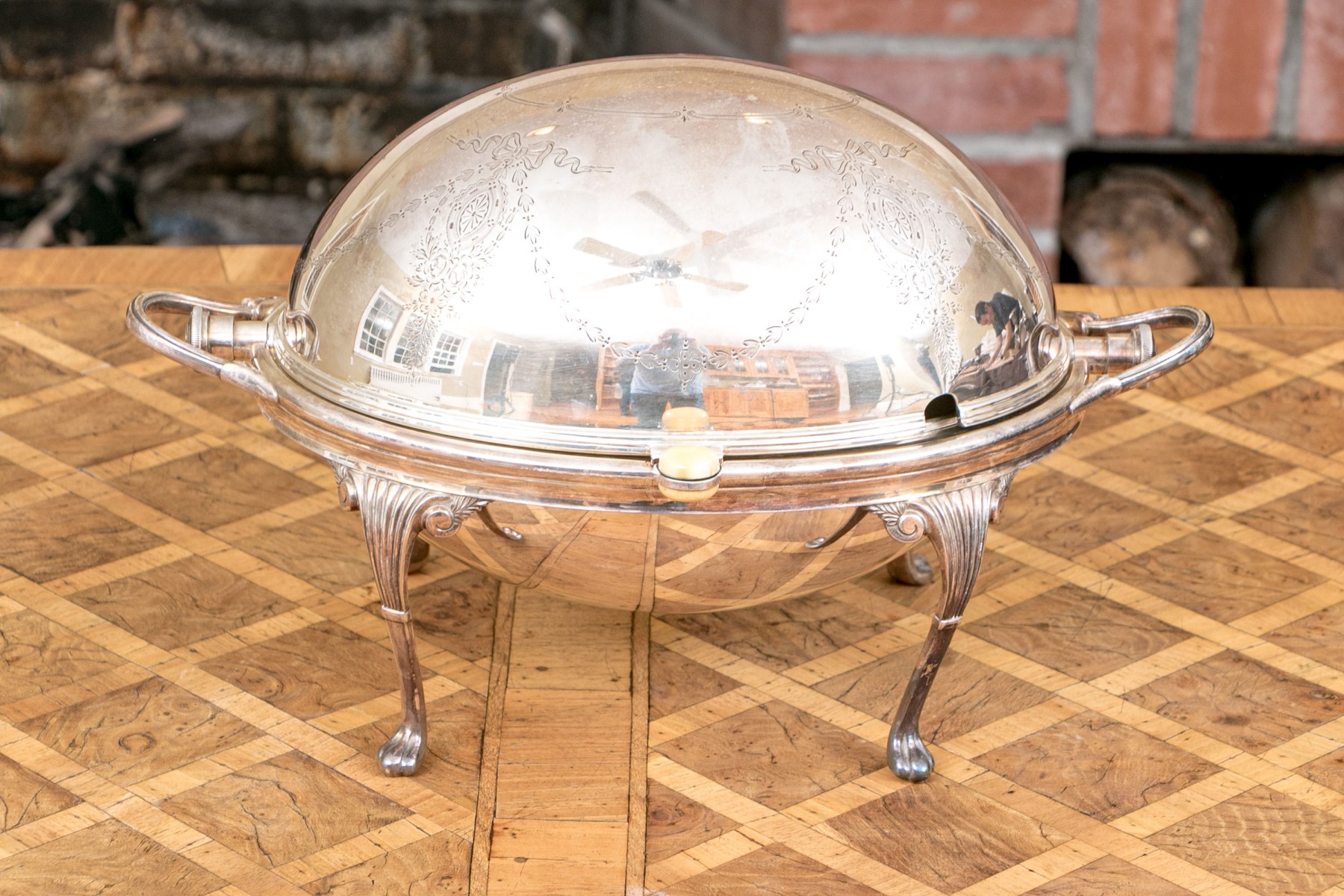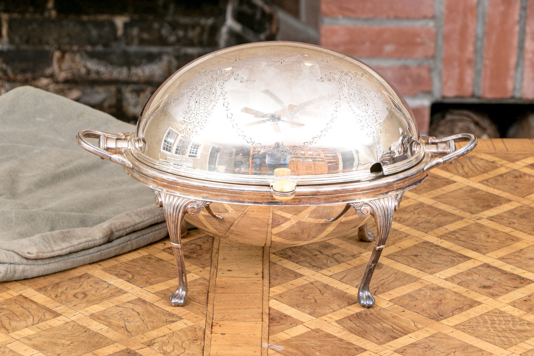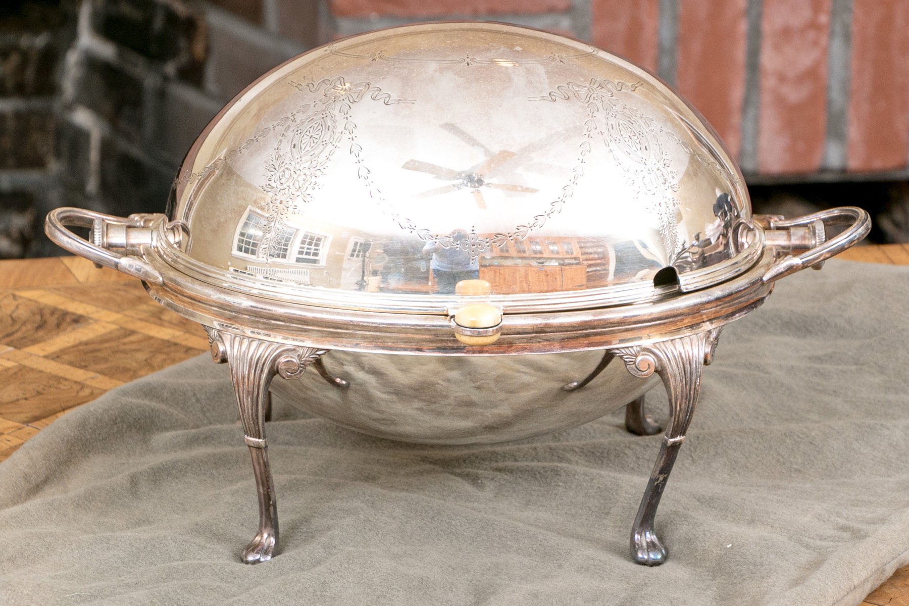 Well constructed heavy silver plate construction with revolving lid, and two removable inserts, the lid has a thoughtful cutout for serving pieces. Overall decorated with Adams style hand engraved decoration.