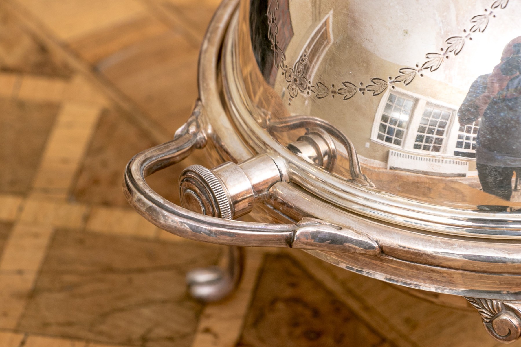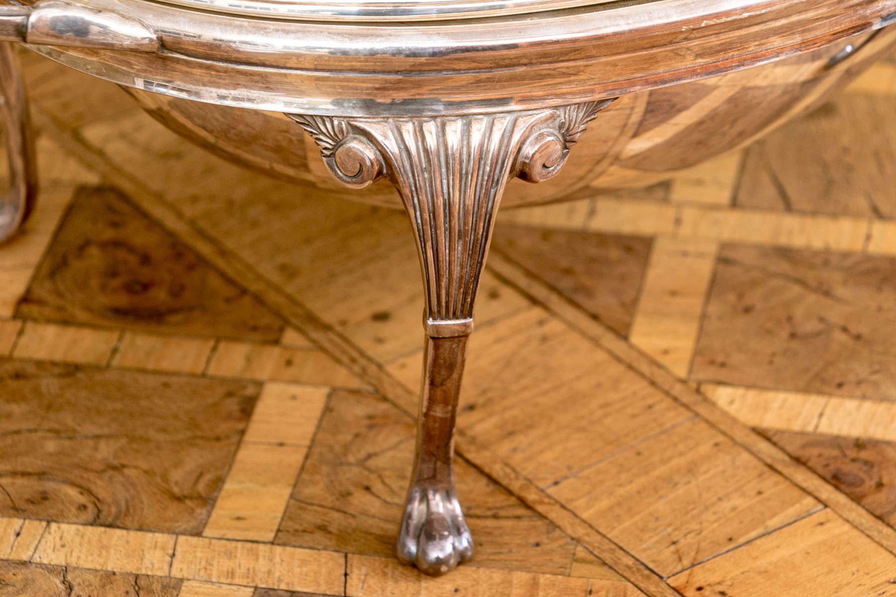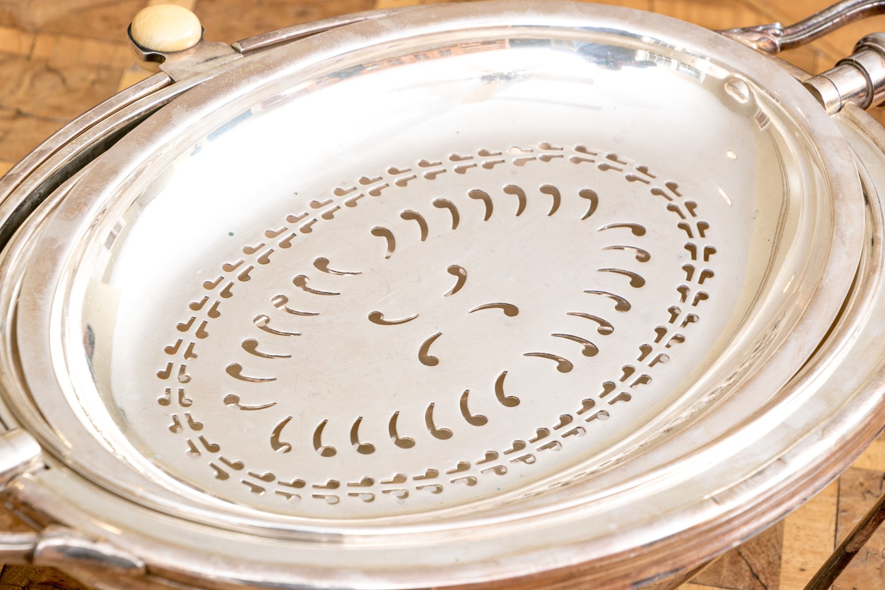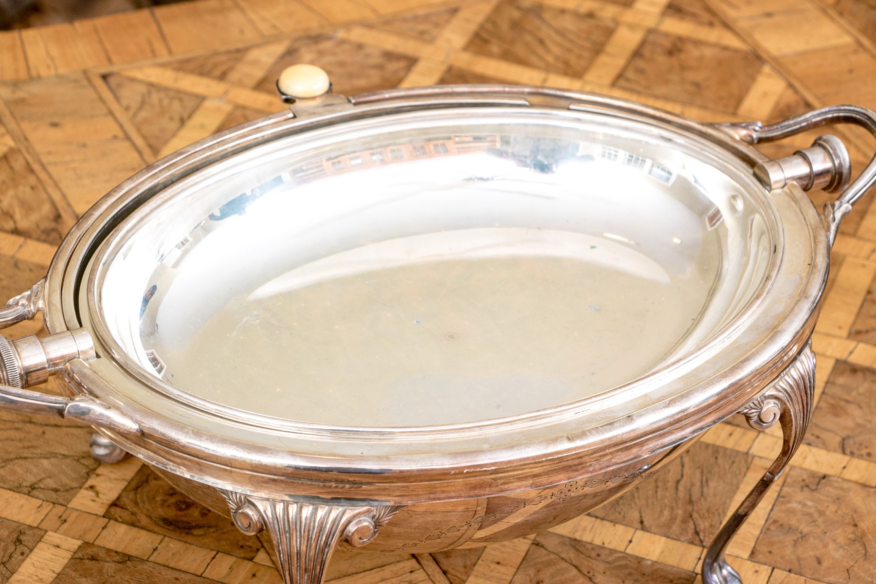 Well constructed heavy silver plate construction with revolving lid, and two removable inserts, the lid has a thoughtful cutout for serving pieces. Overall decorated with Adams style hand engraved decoration.