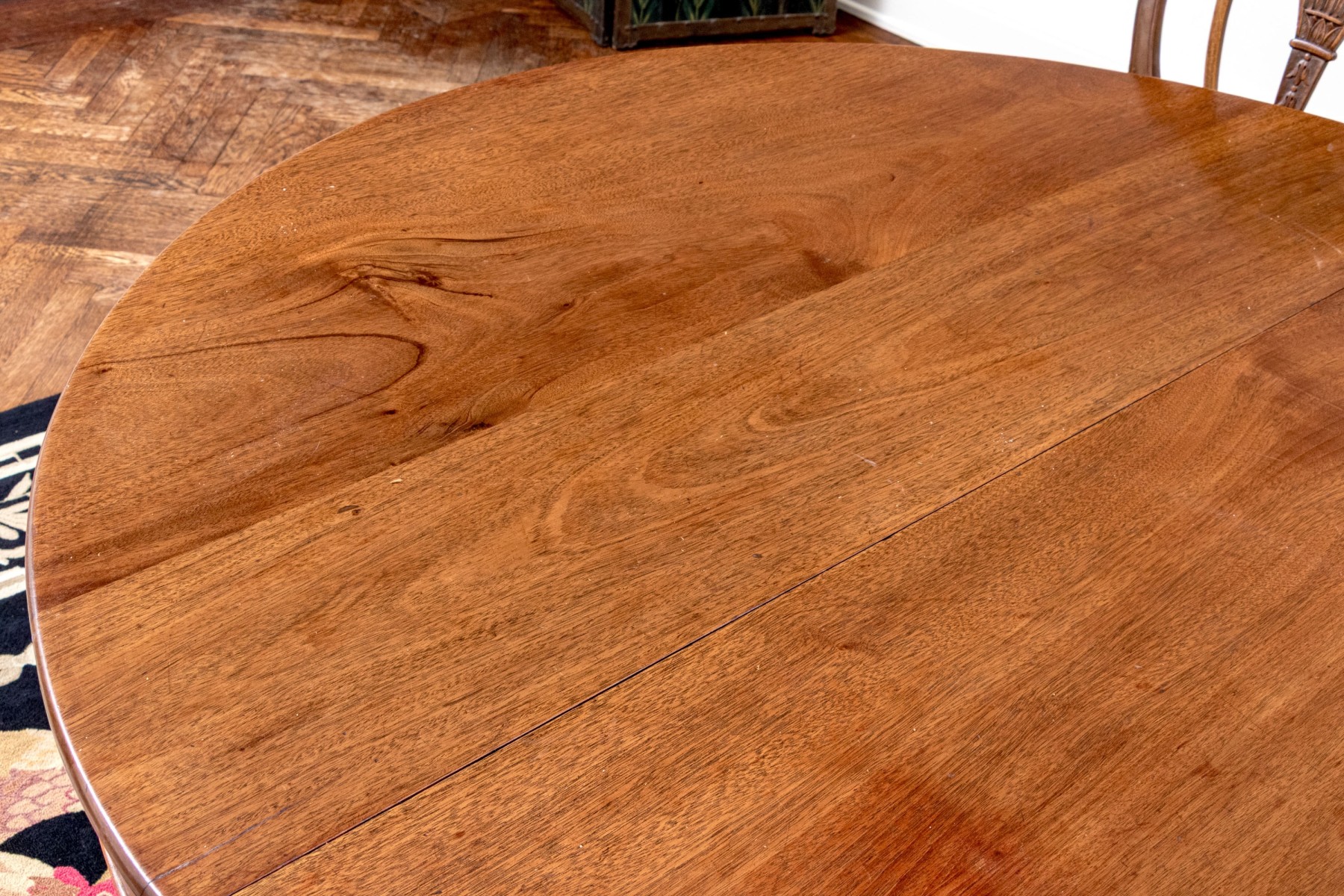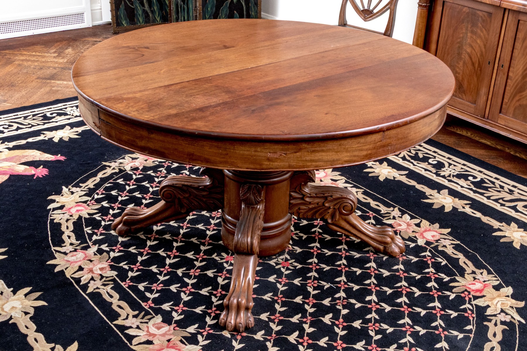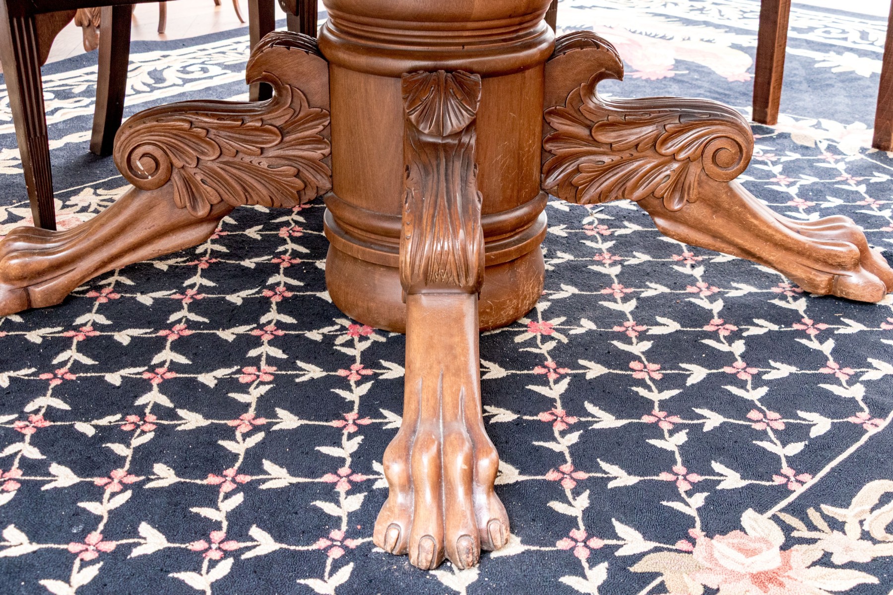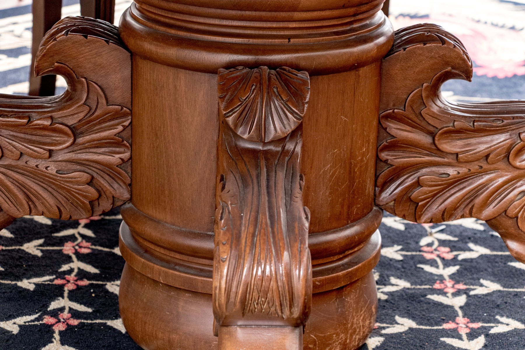 A stunning antique extension table in warm-toned medium brown wood. The circular table includes two extension leaves, raised over a thick cylindrical pedestal on four impressively carved paw feet with fine detail throughout foliate scrolled knees. Two simple tapered legs on either end can fold down to support the ends when leaves are in for additional support.