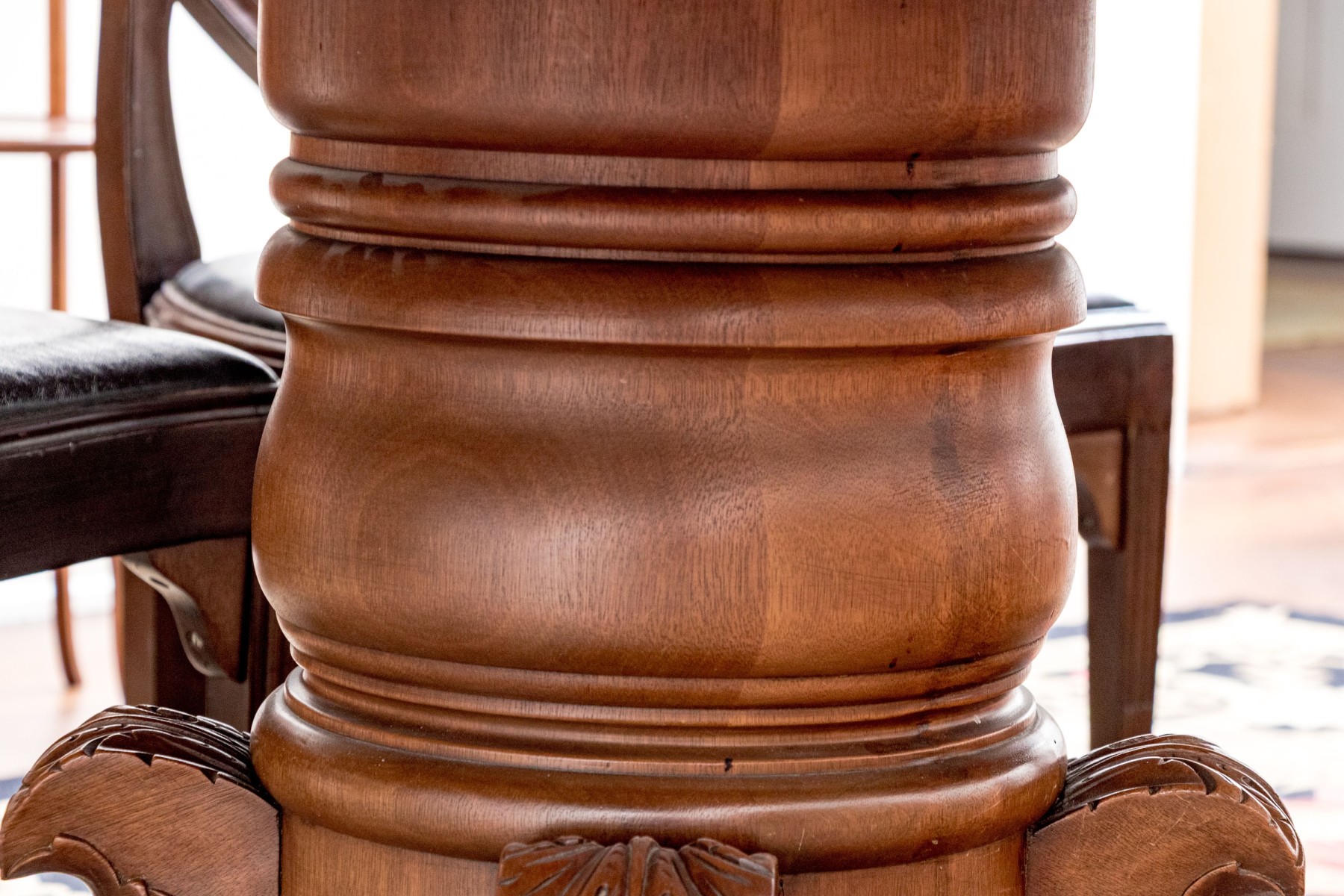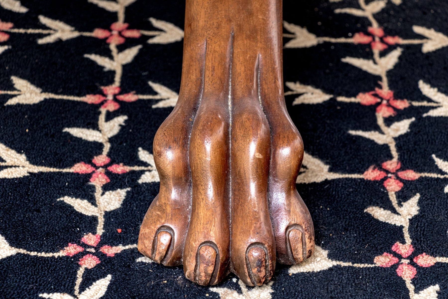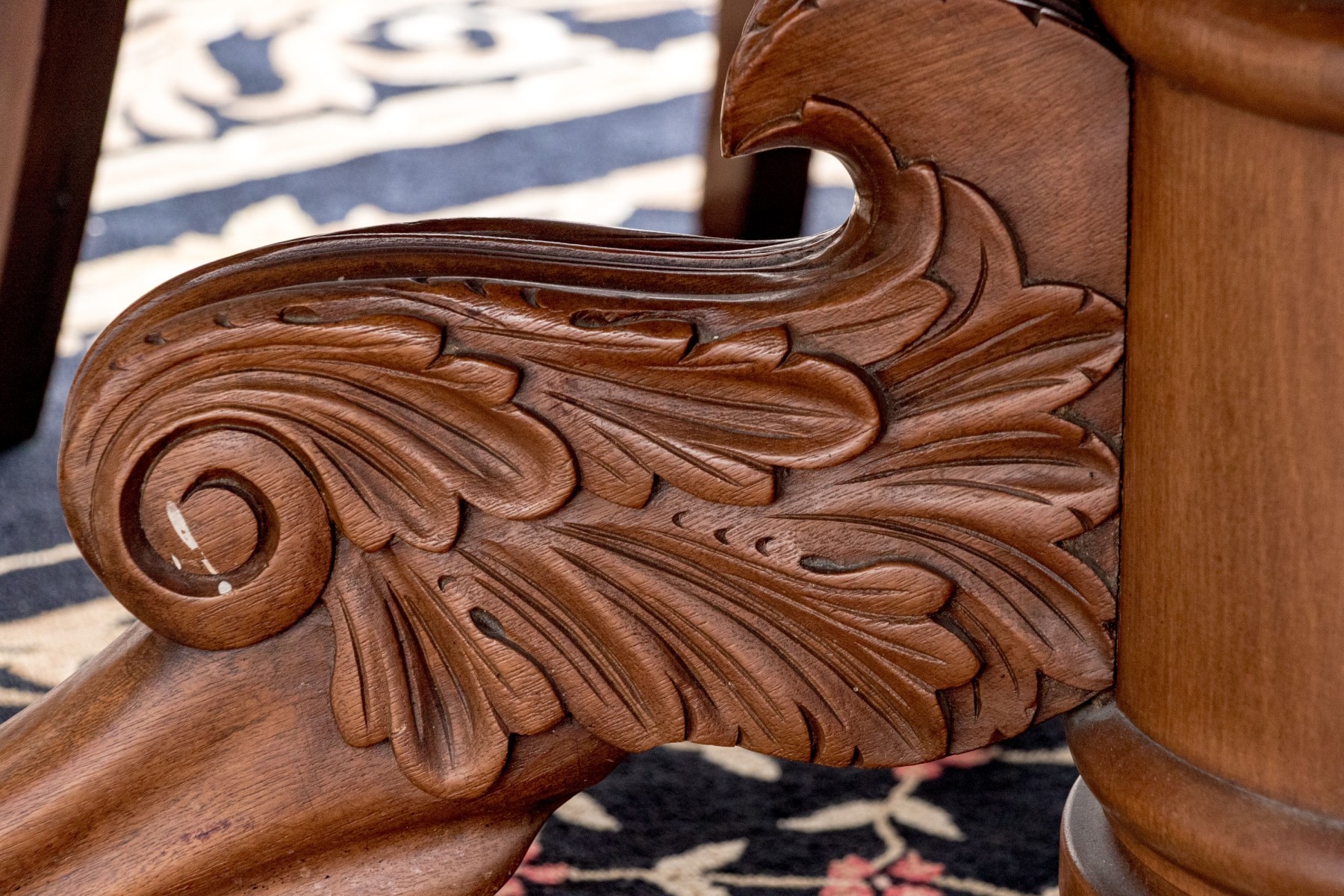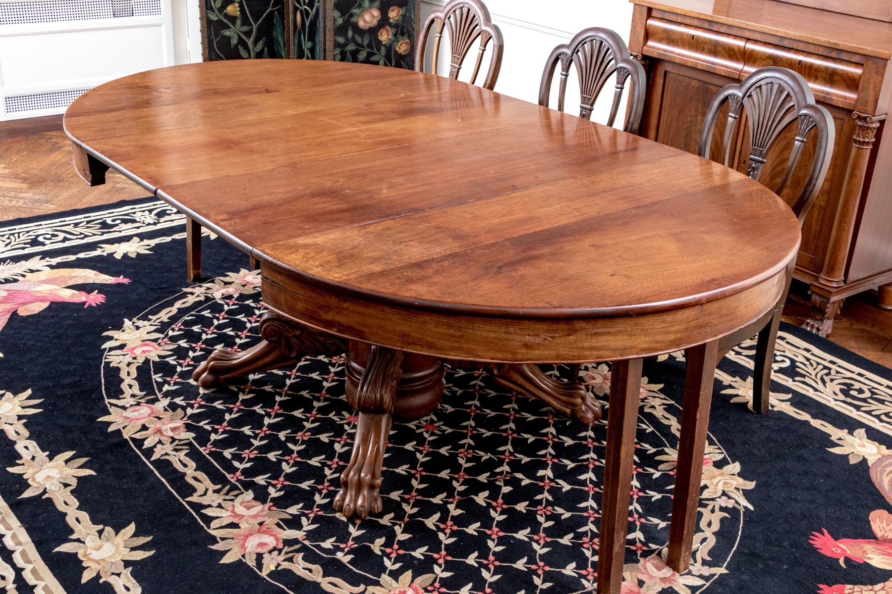 A stunning antique extension table in warm-toned medium brown wood. The circular table includes two extension leaves, raised over a thick cylindrical pedestal on four impressively carved paw feet with fine detail throughout foliate scrolled knees. Two simple tapered legs on either end can fold down to support the ends when leaves are in for additional support.