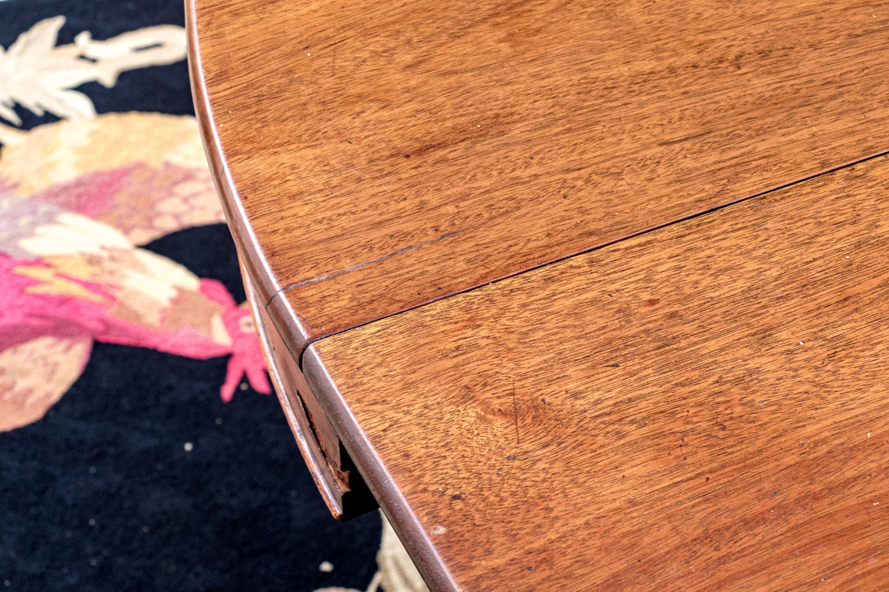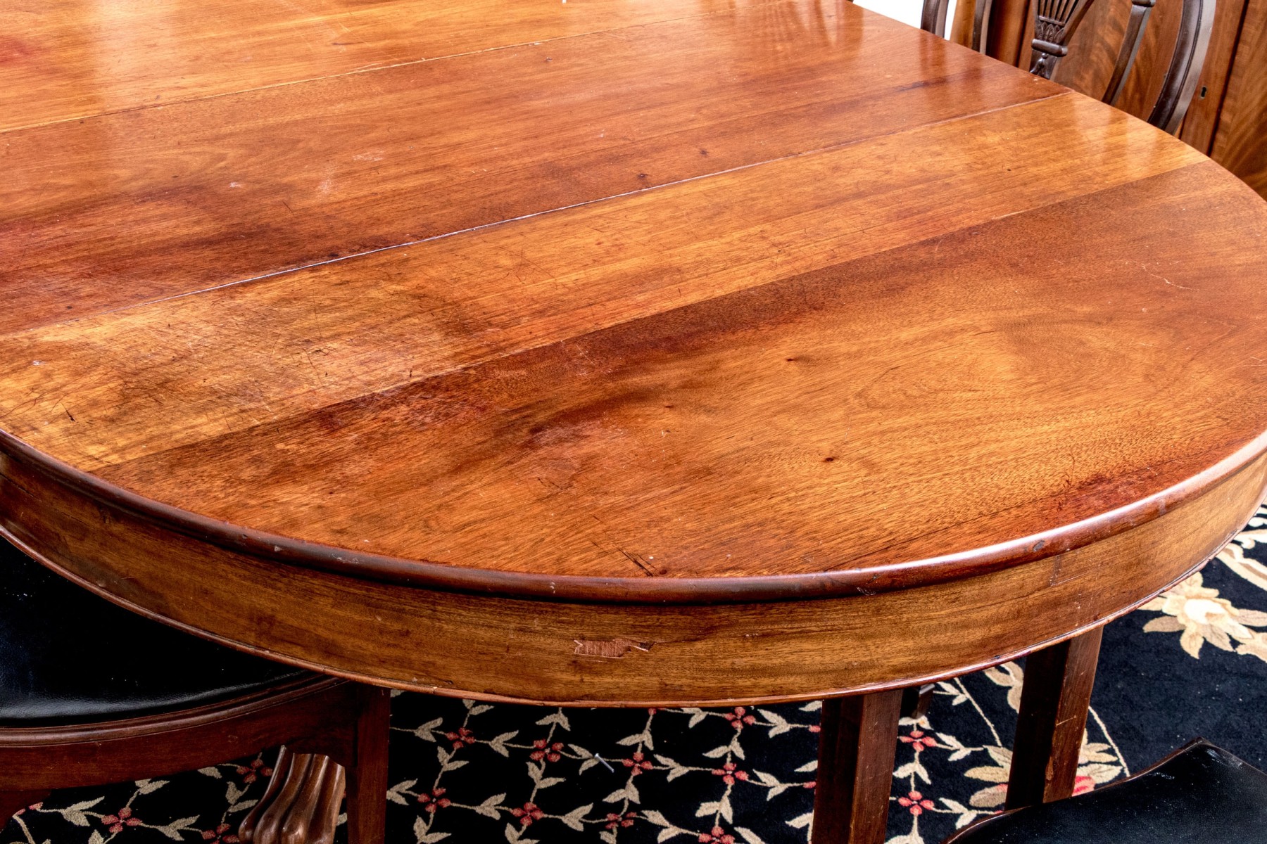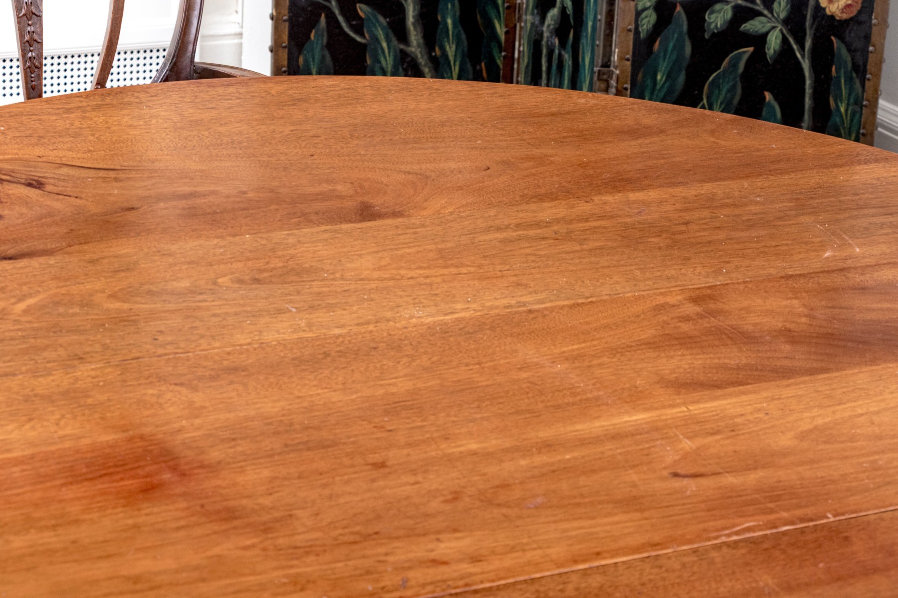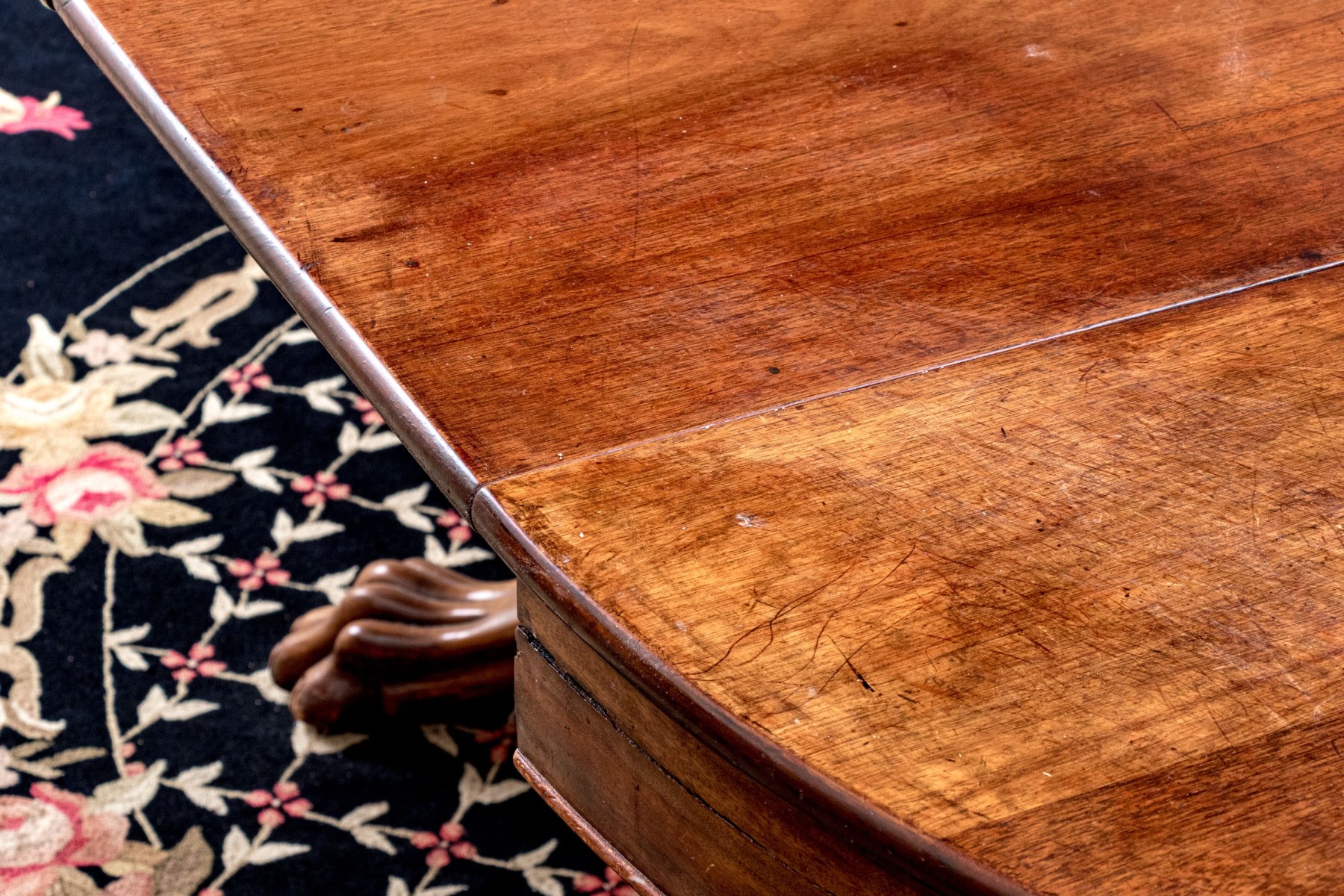A stunning antique extension table in warm-toned medium brown wood. The circular table includes two extension leaves, raised over a thick cylindrical pedestal on four impressively carved paw feet with fine detail throughout foliate scrolled knees. Two simple tapered legs on either end can fold down to support the ends when leaves are in for additional support.