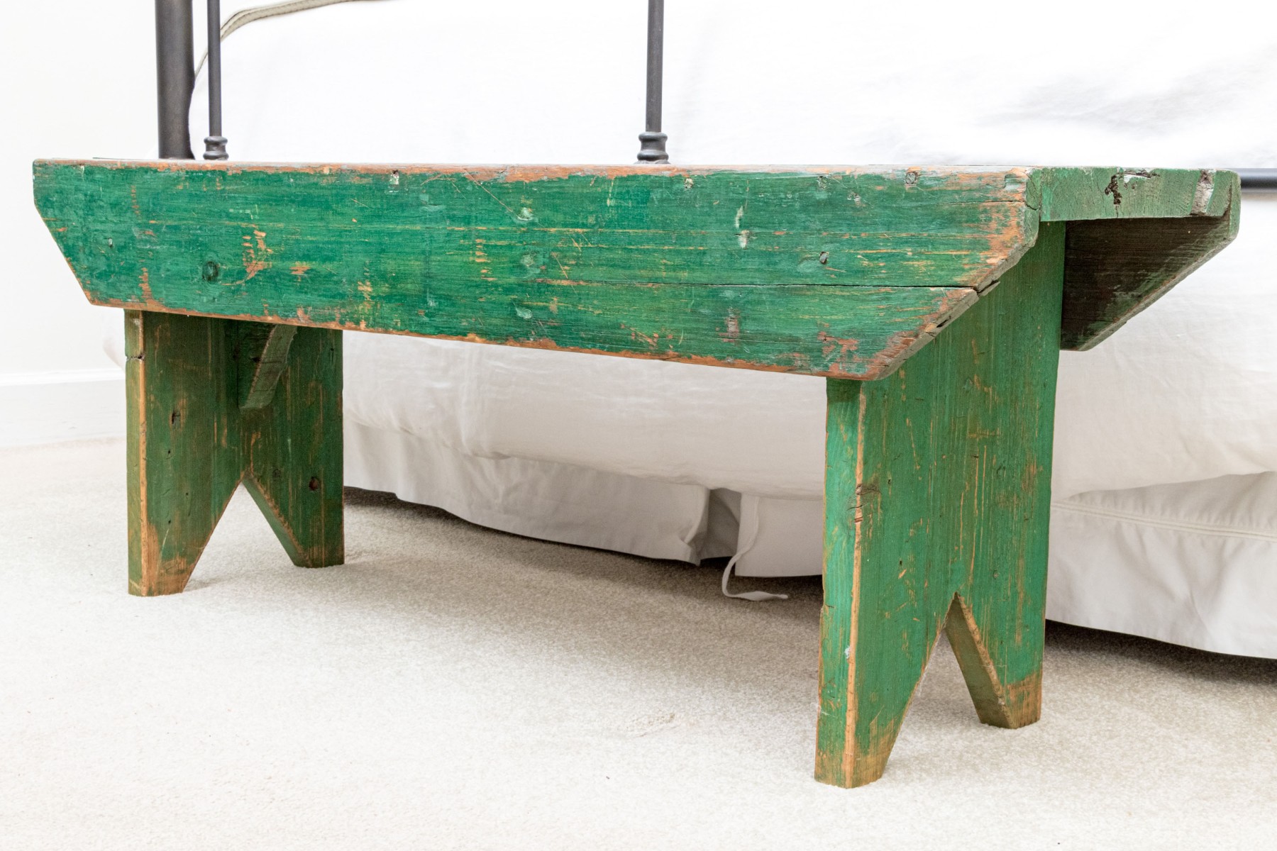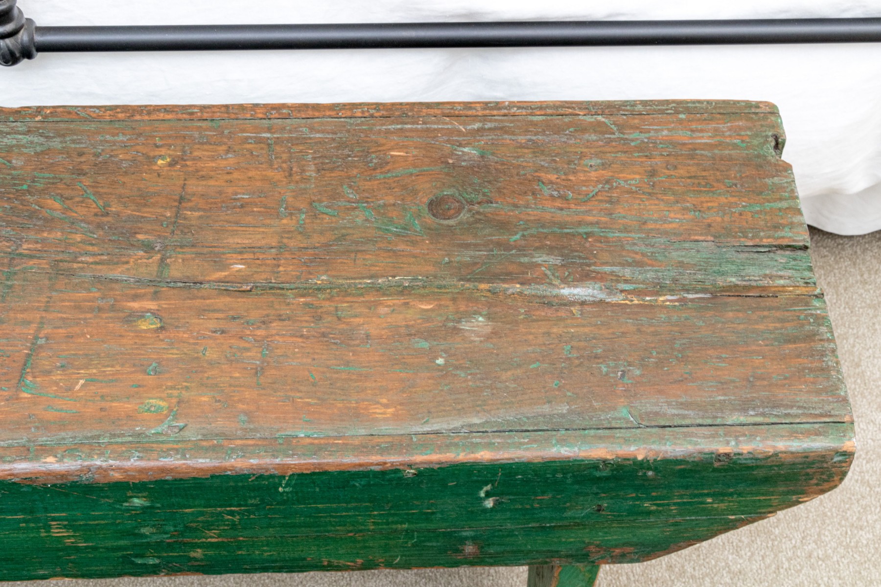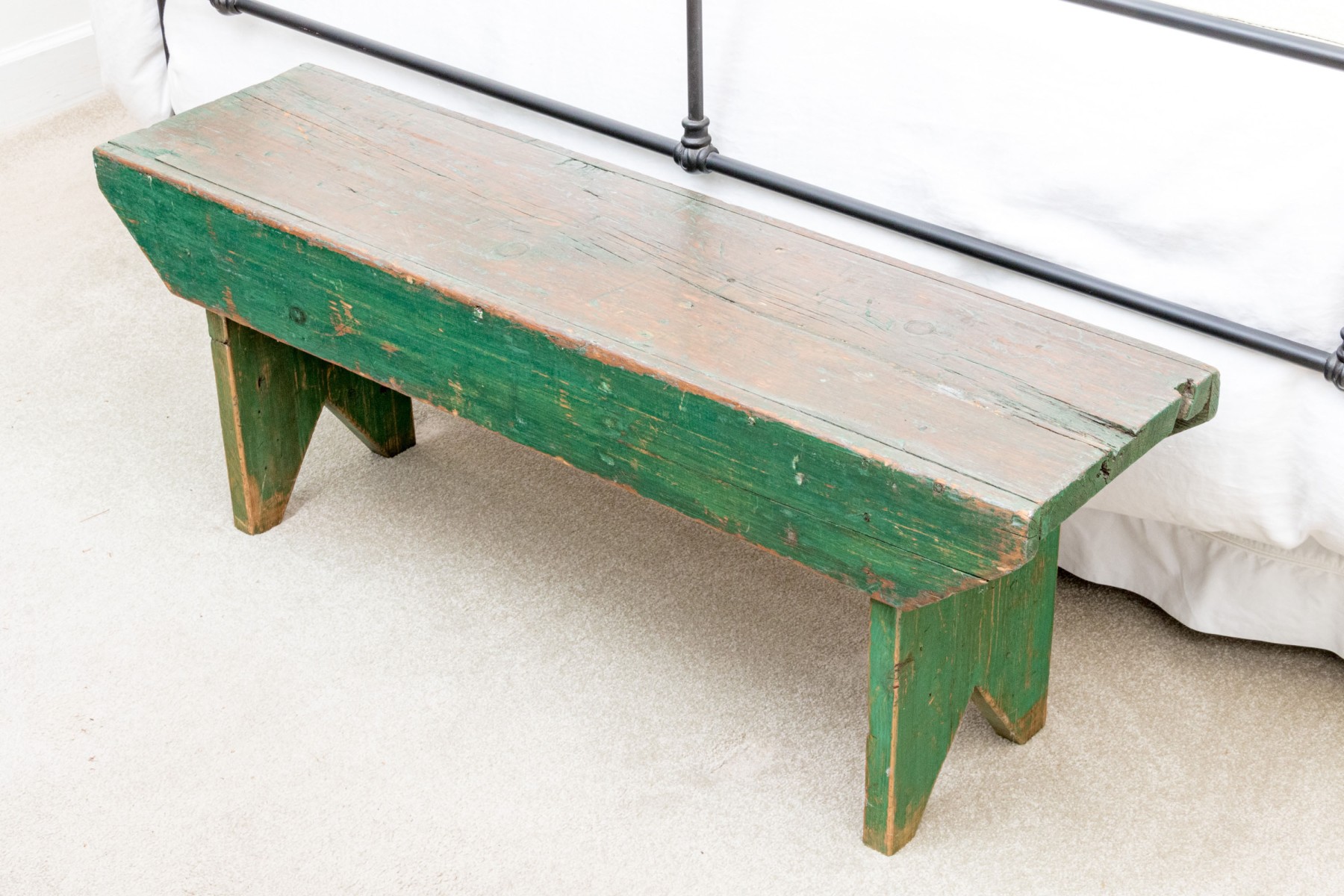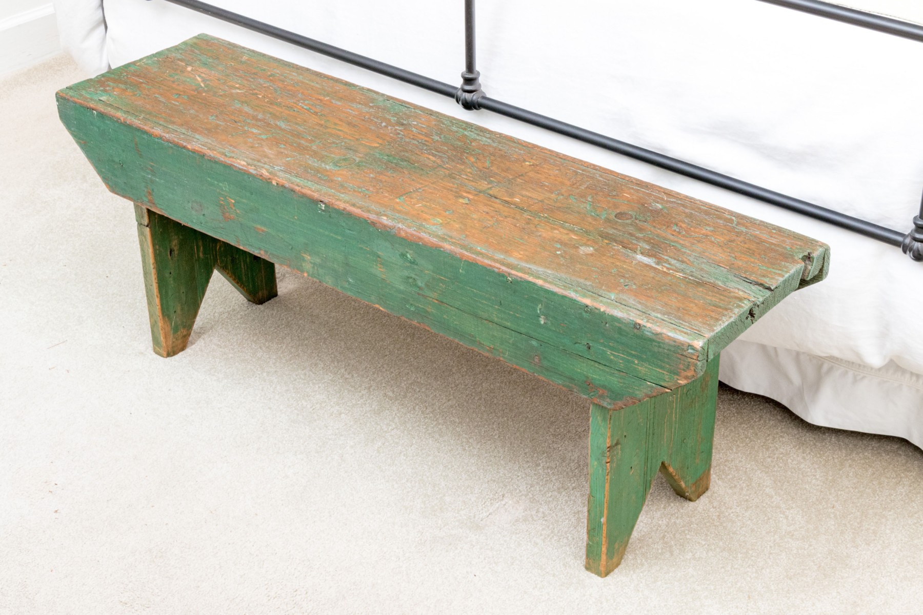 A wonderful antique wood bench oozing rustic farmhouse charm, featuring a rectangular top in a stripped finish with a trapezoidal apron over stylish A-frame legs in an age-loved green finish.