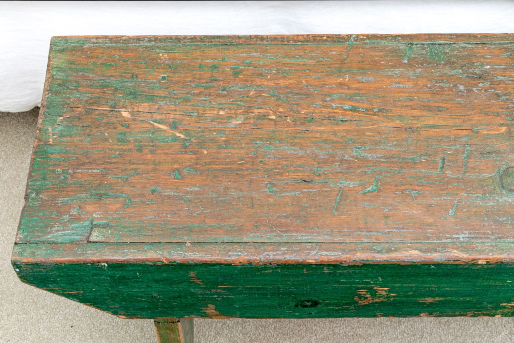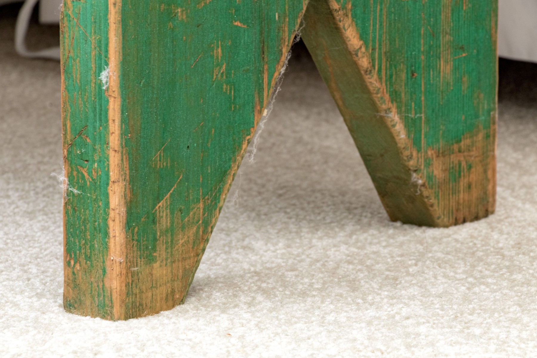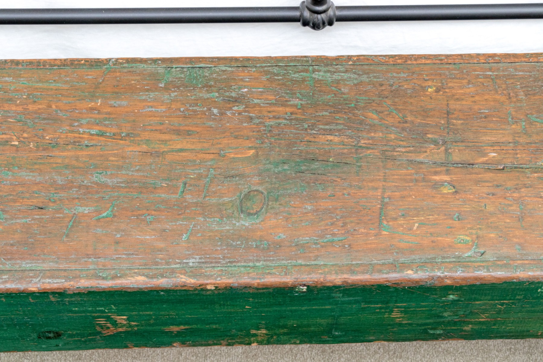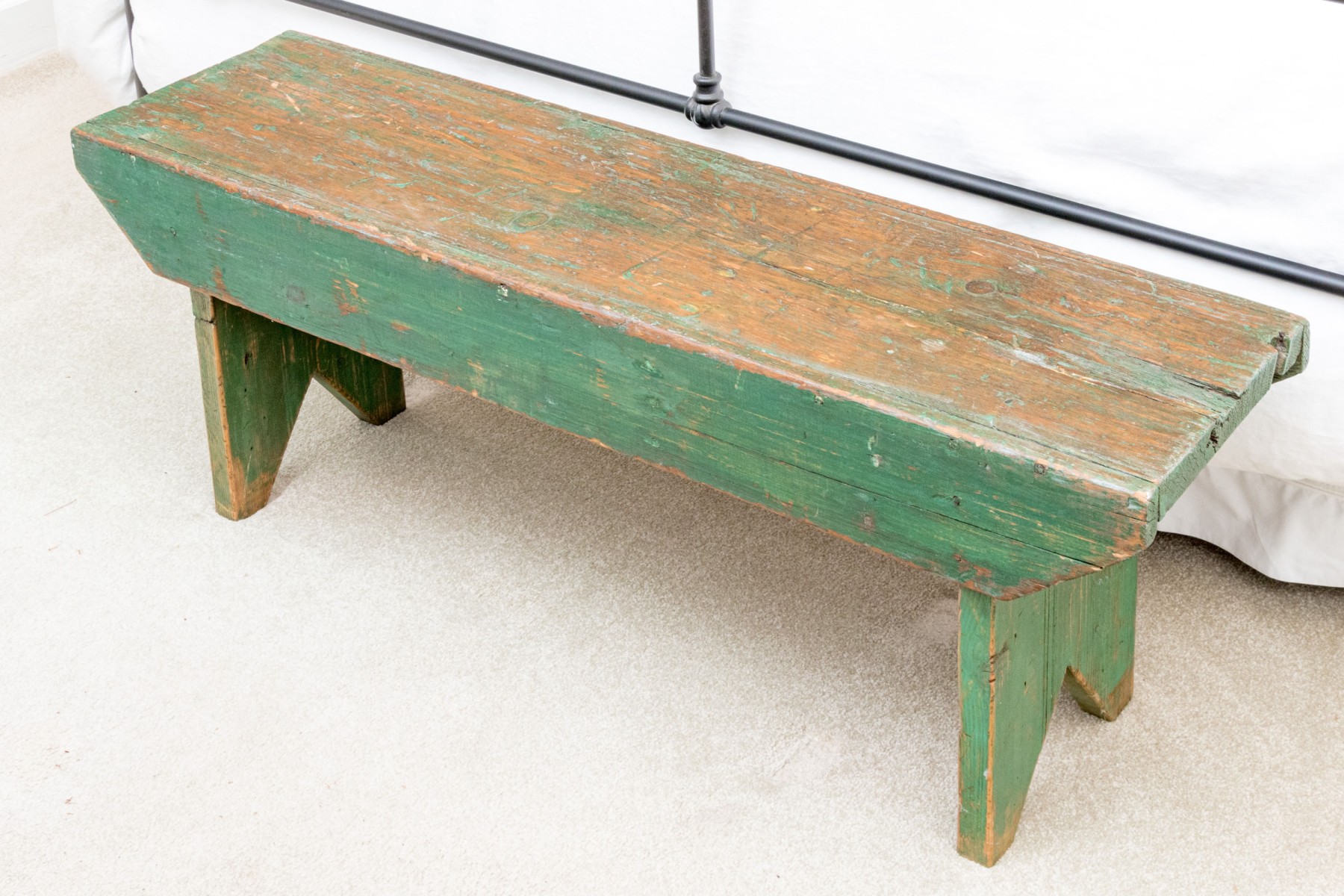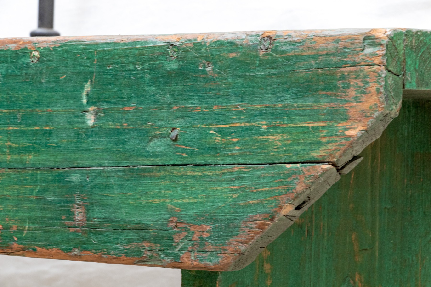 A wonderful antique wood bench oozing rustic farmhouse charm, featuring a rectangular top in a stripped finish with a trapezoidal apron over stylish A-frame legs in an age-loved green finish.