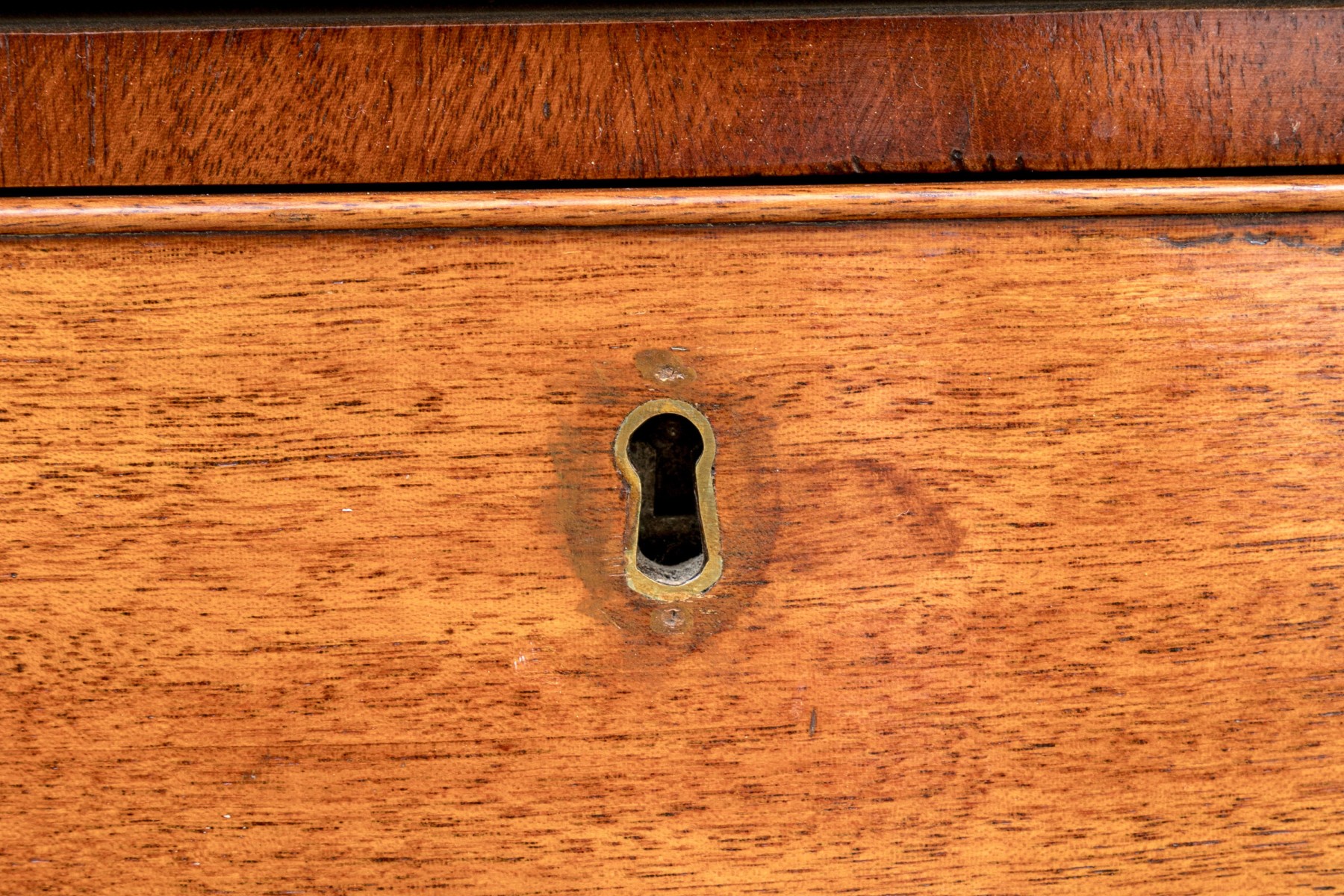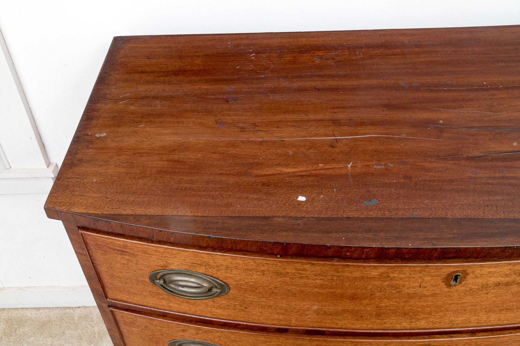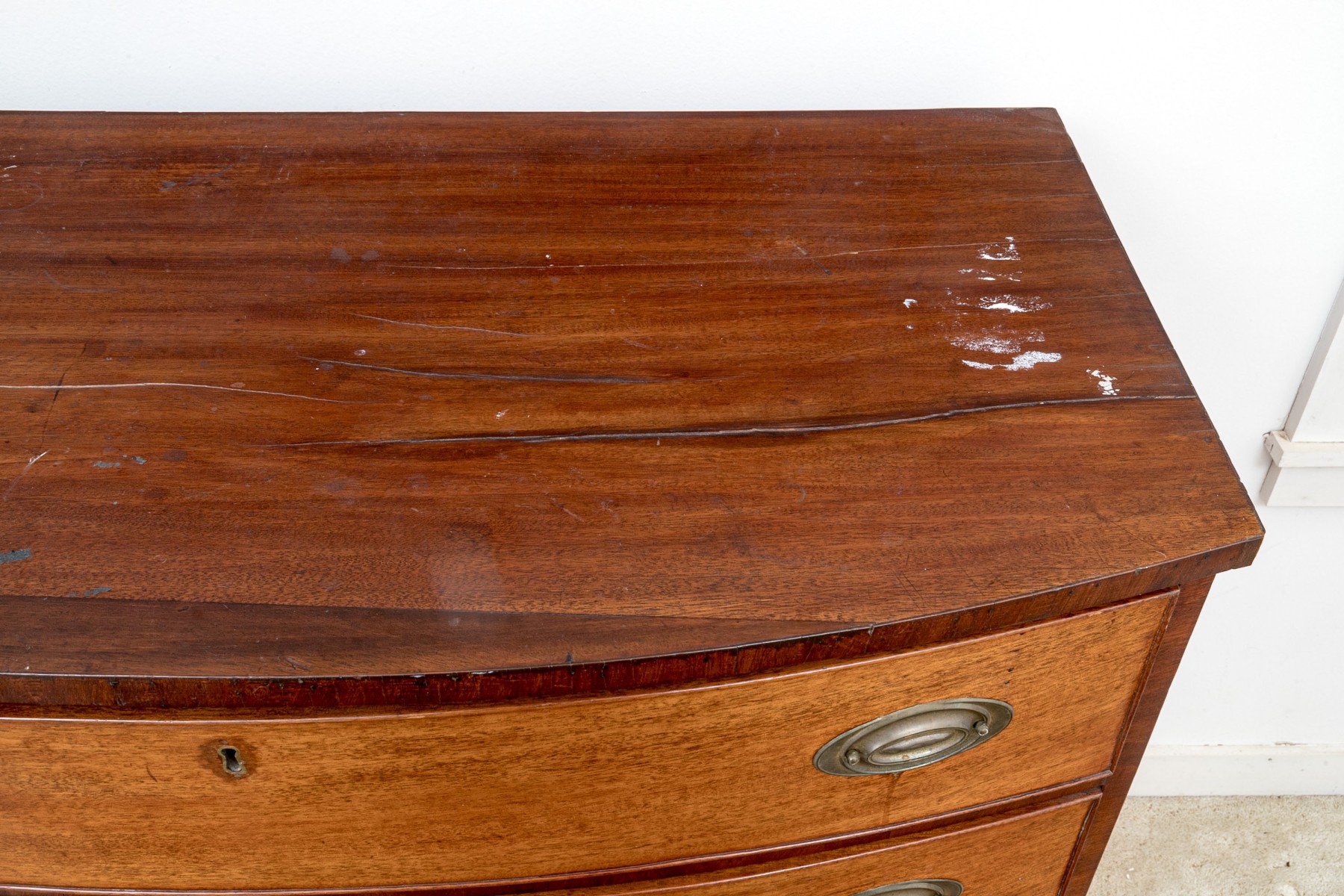 Raised on four bracket feet. The chest with four bow front drawers all with oval brass swing handles. Each with a key escutcheon with key.