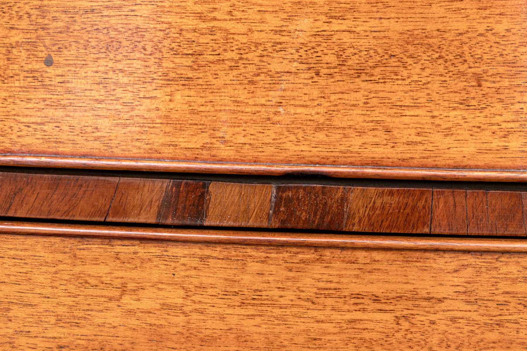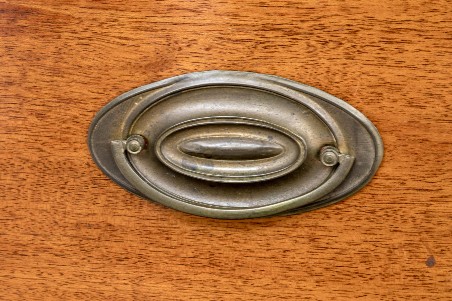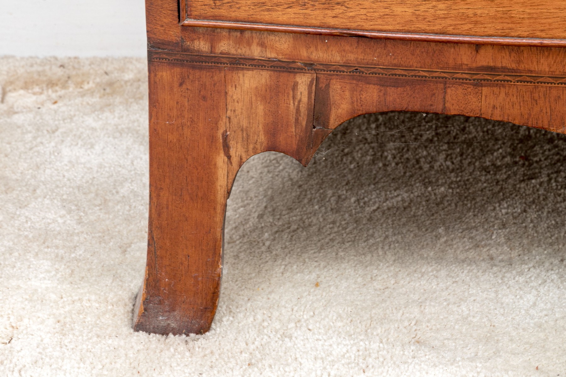 Raised on four bracket feet. The chest with four bow front drawers all with oval brass swing handles. Each with a key escutcheon with key.