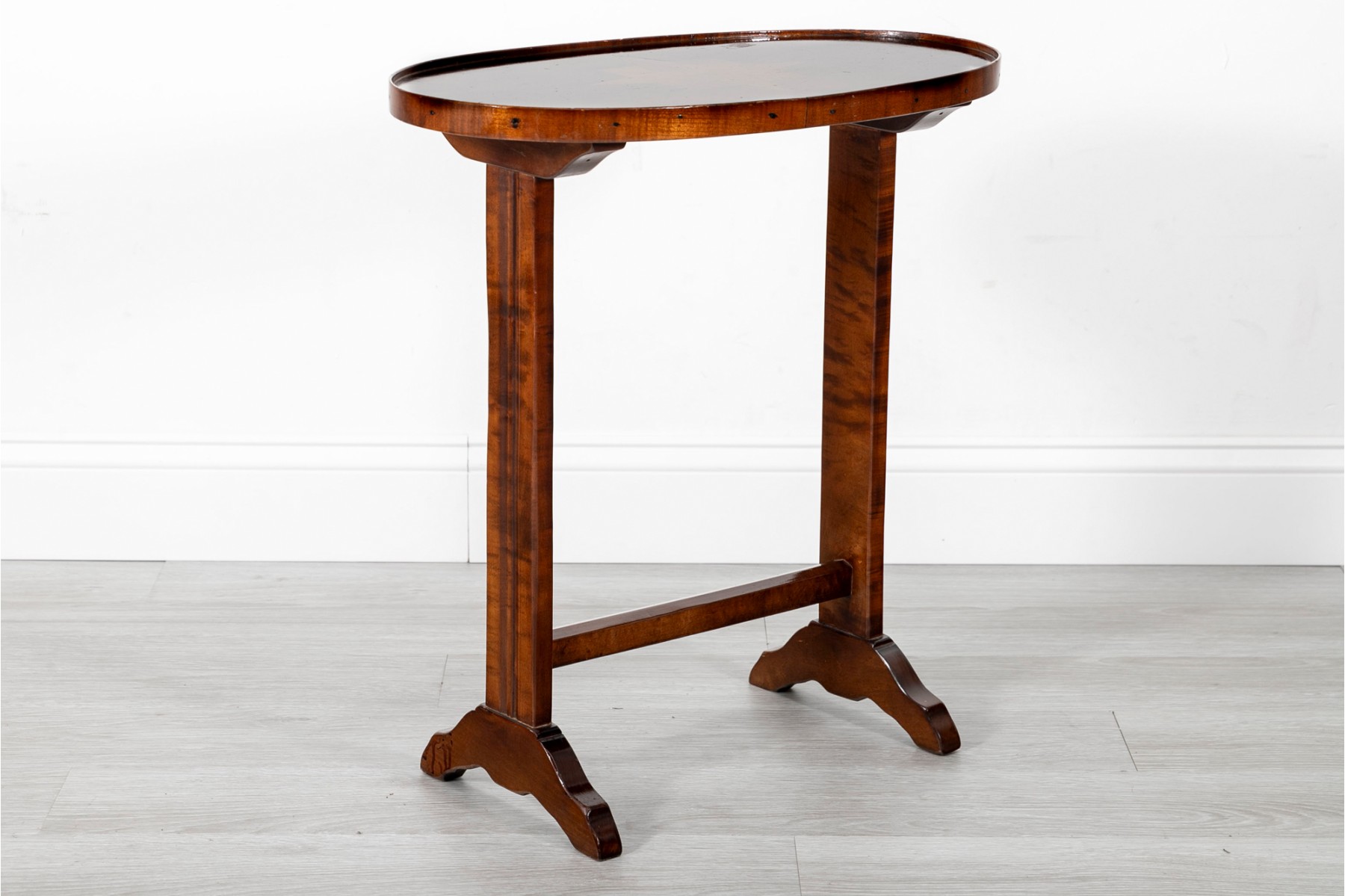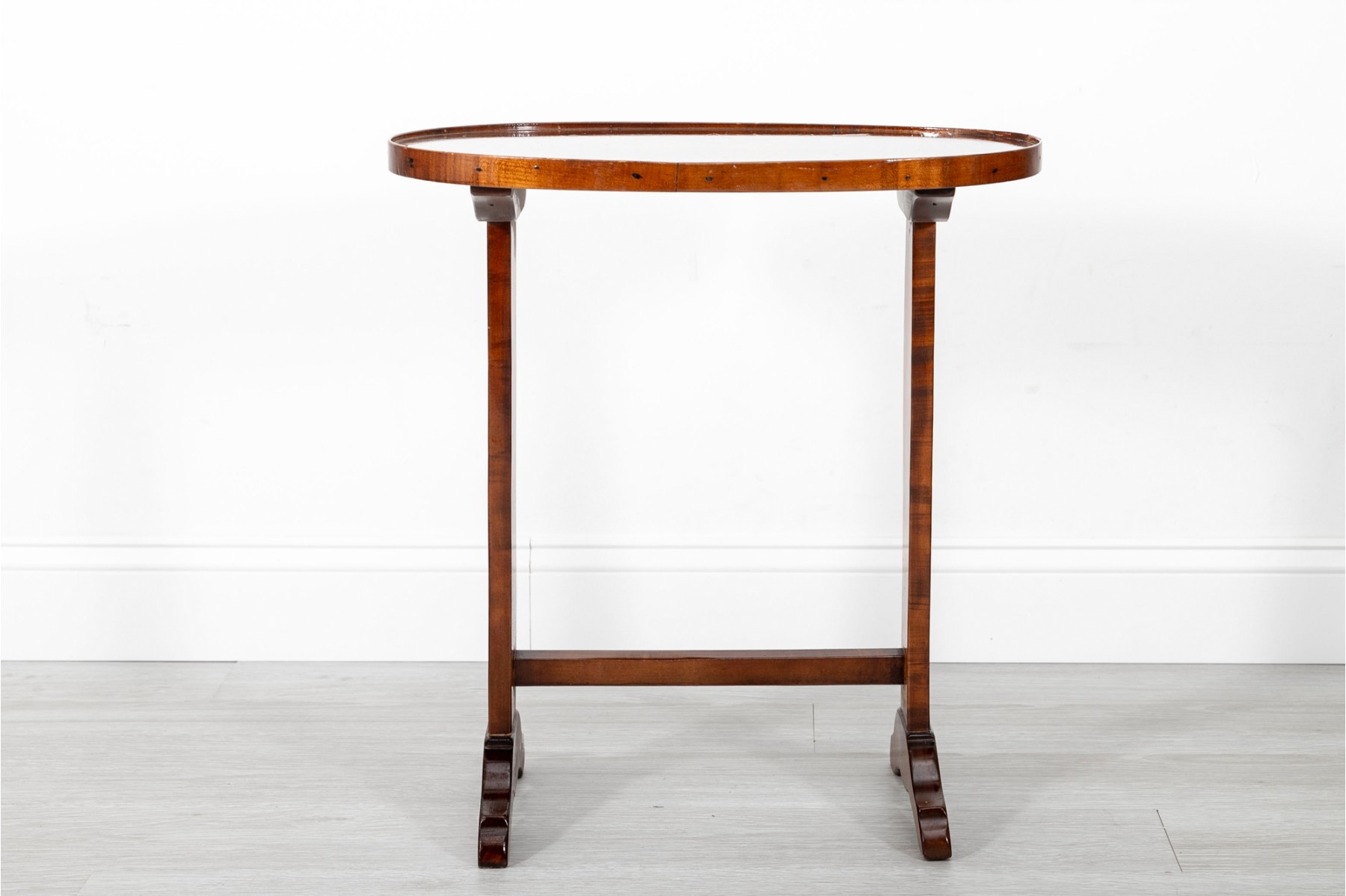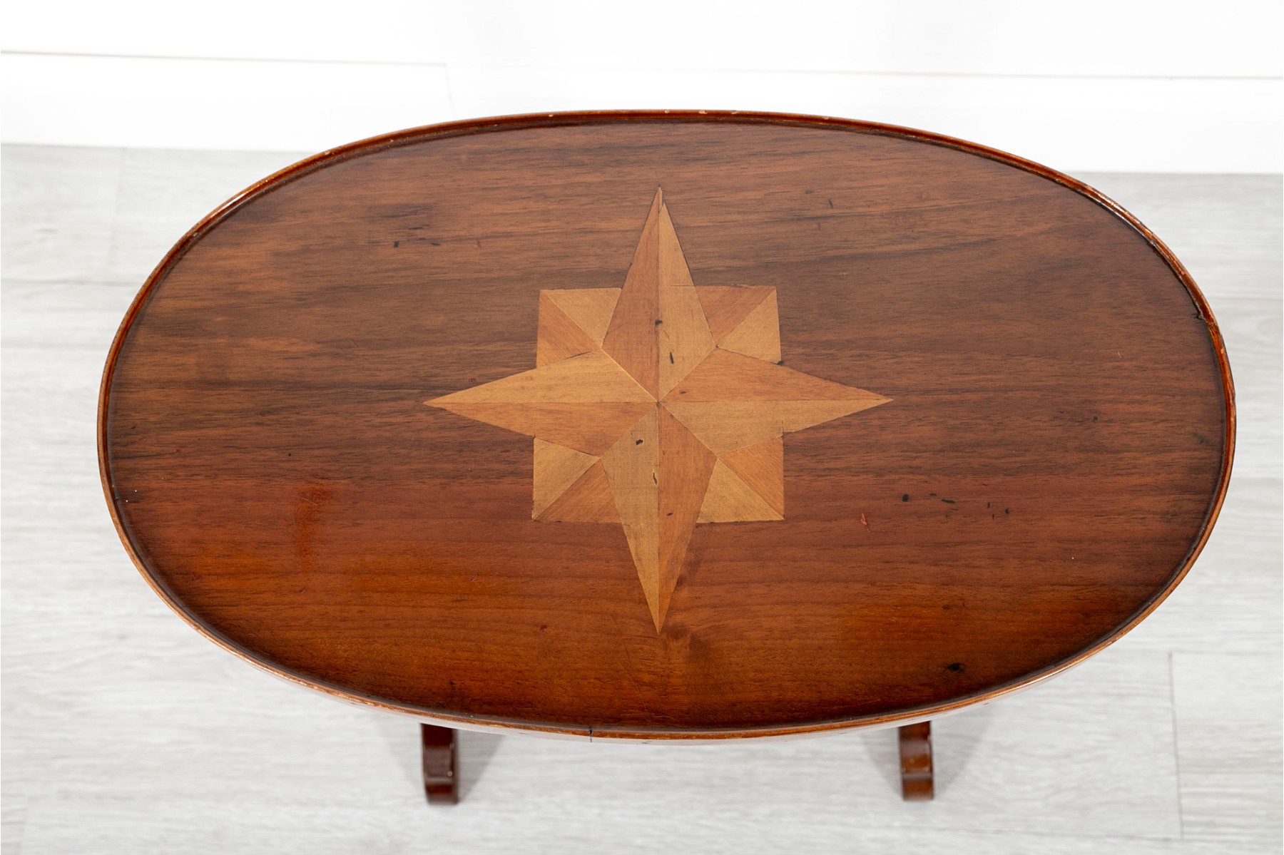 A delightful antique Federal styled accent or end table in warm-toned medium brown mahogany, displaying a beautiful two-tone light brown inlaid star design. The oval top features a raised rim, supported by wide ribbed plank legs over serpentine pronged feet.