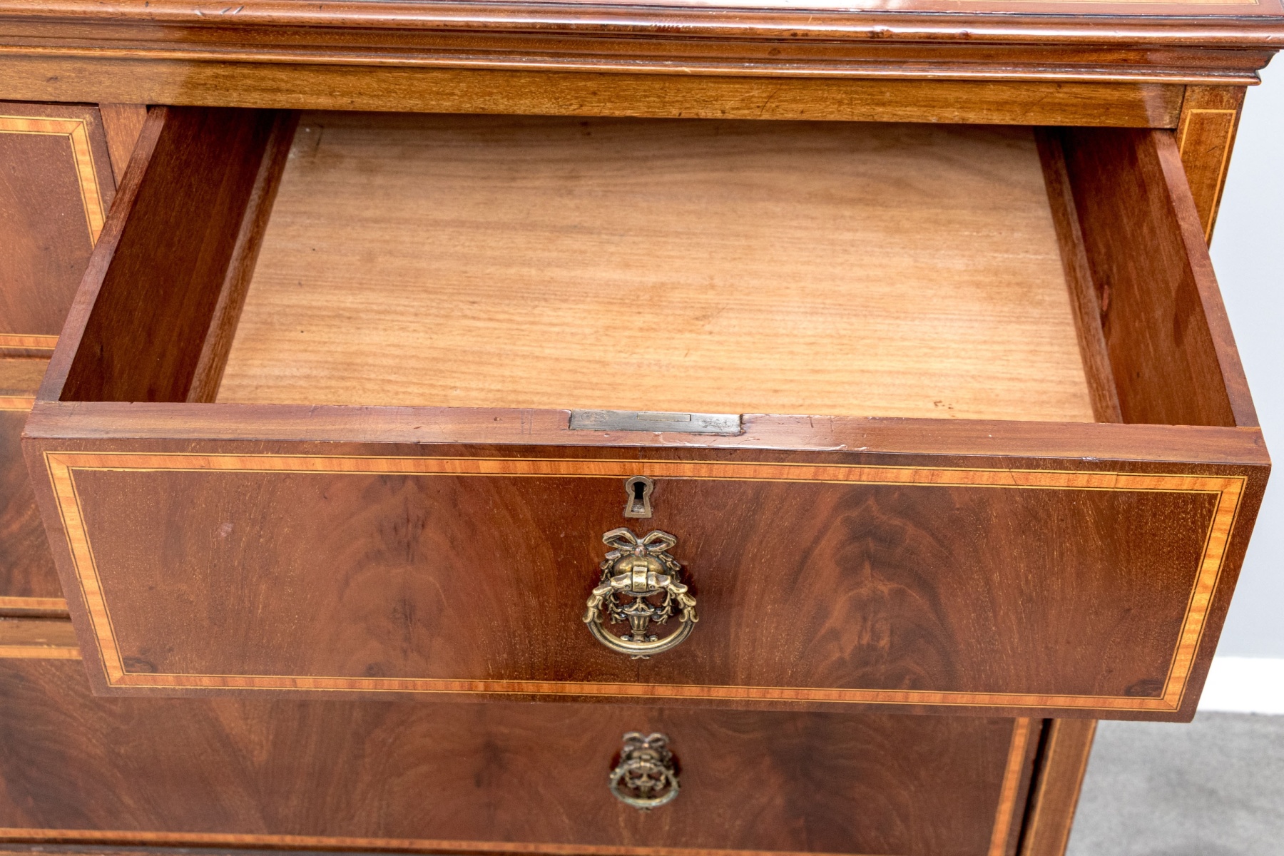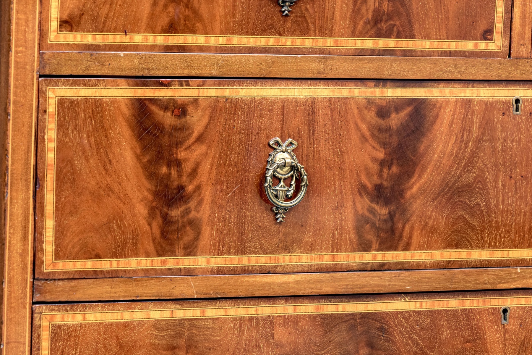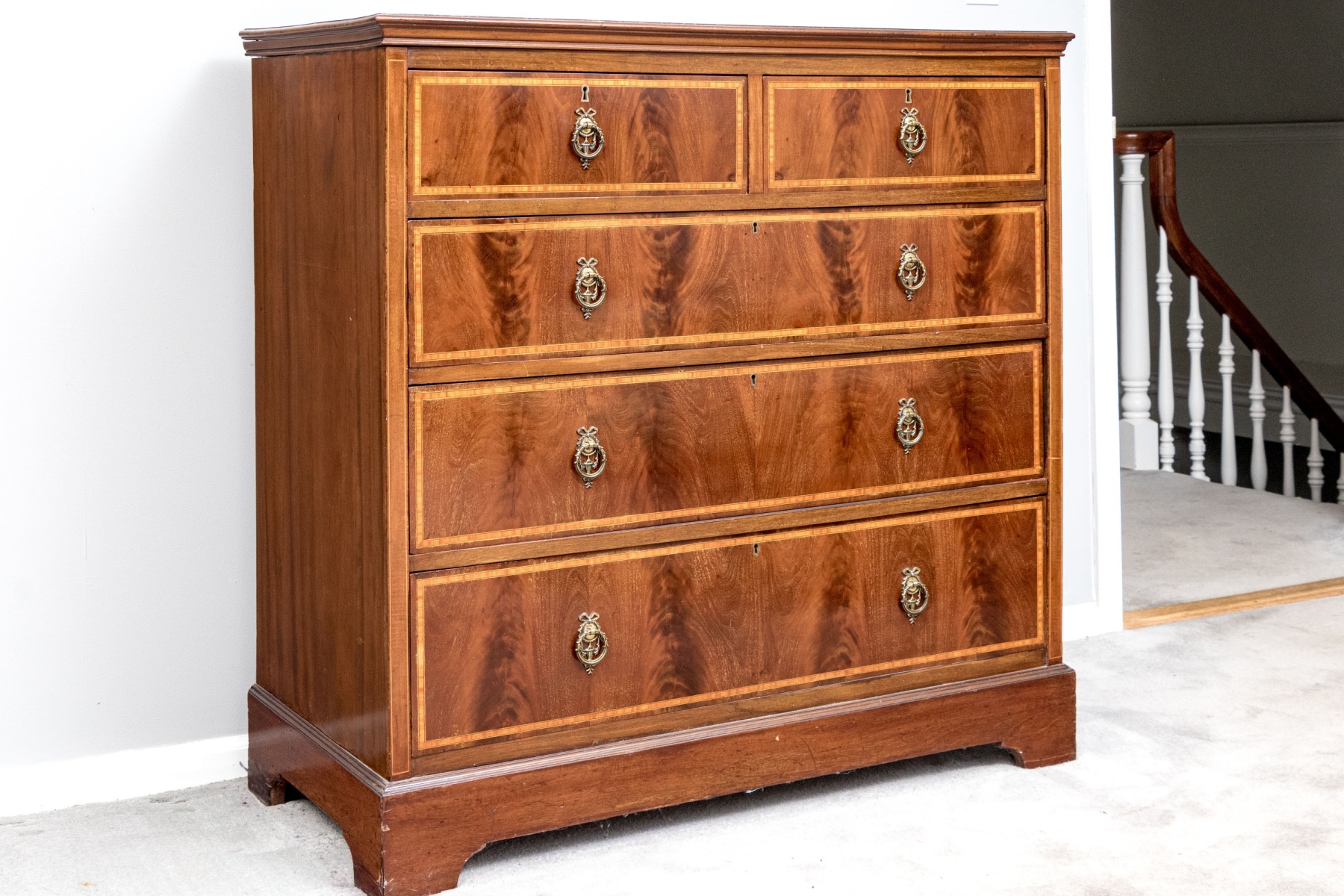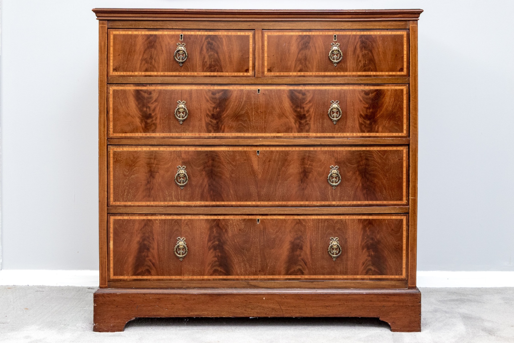 A gorgeous antique chest of drawers in classic Federal style, well crafted with flamed mahogany veneers and satinwood borders for a great touch of contrast. The chest features a two-over-three arrangement of drawers with the lower drawers graduating, each beautifully veneered and adorned with brass wreath loop handles on intricate plaques. Raised on bracket feet, completing the design.