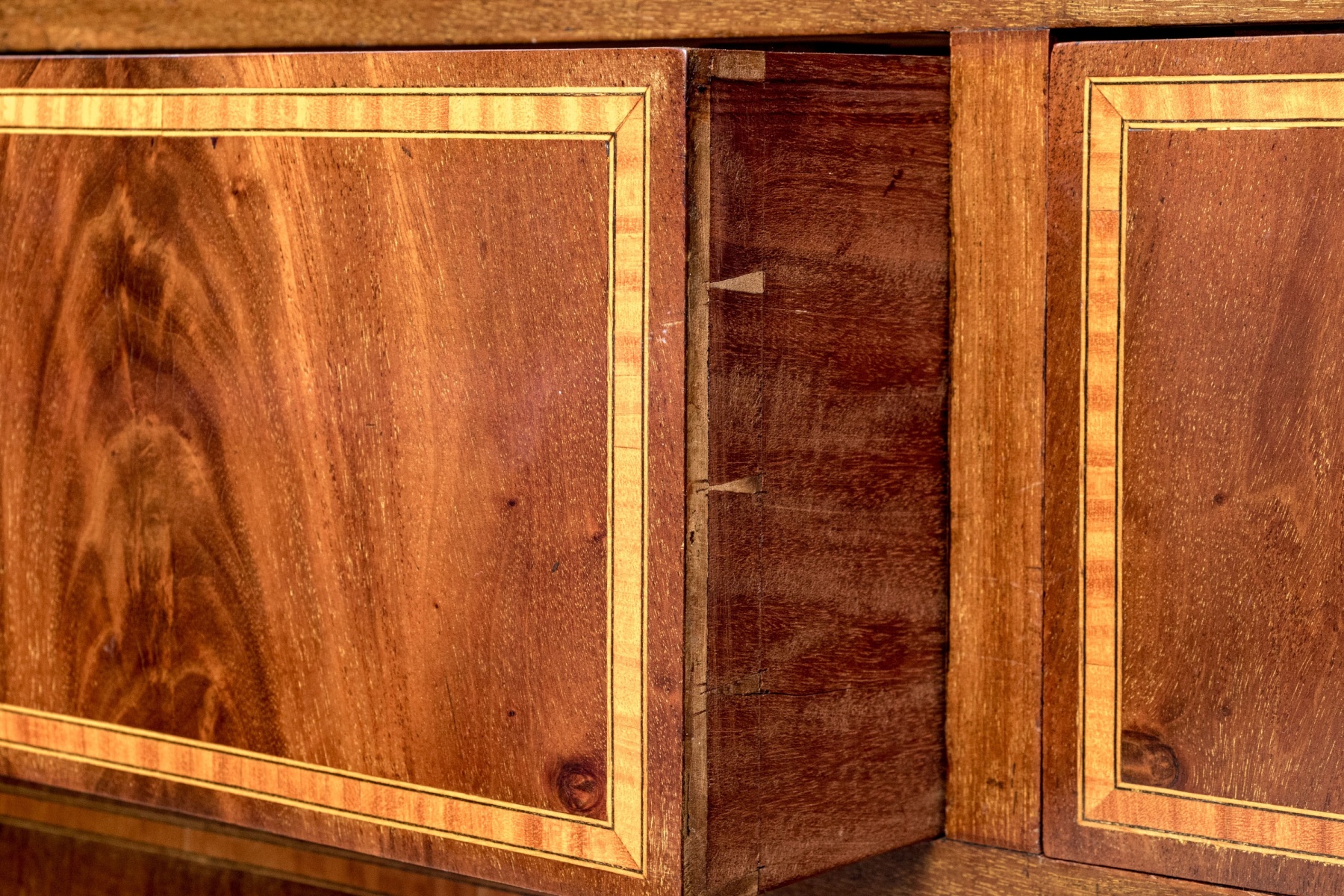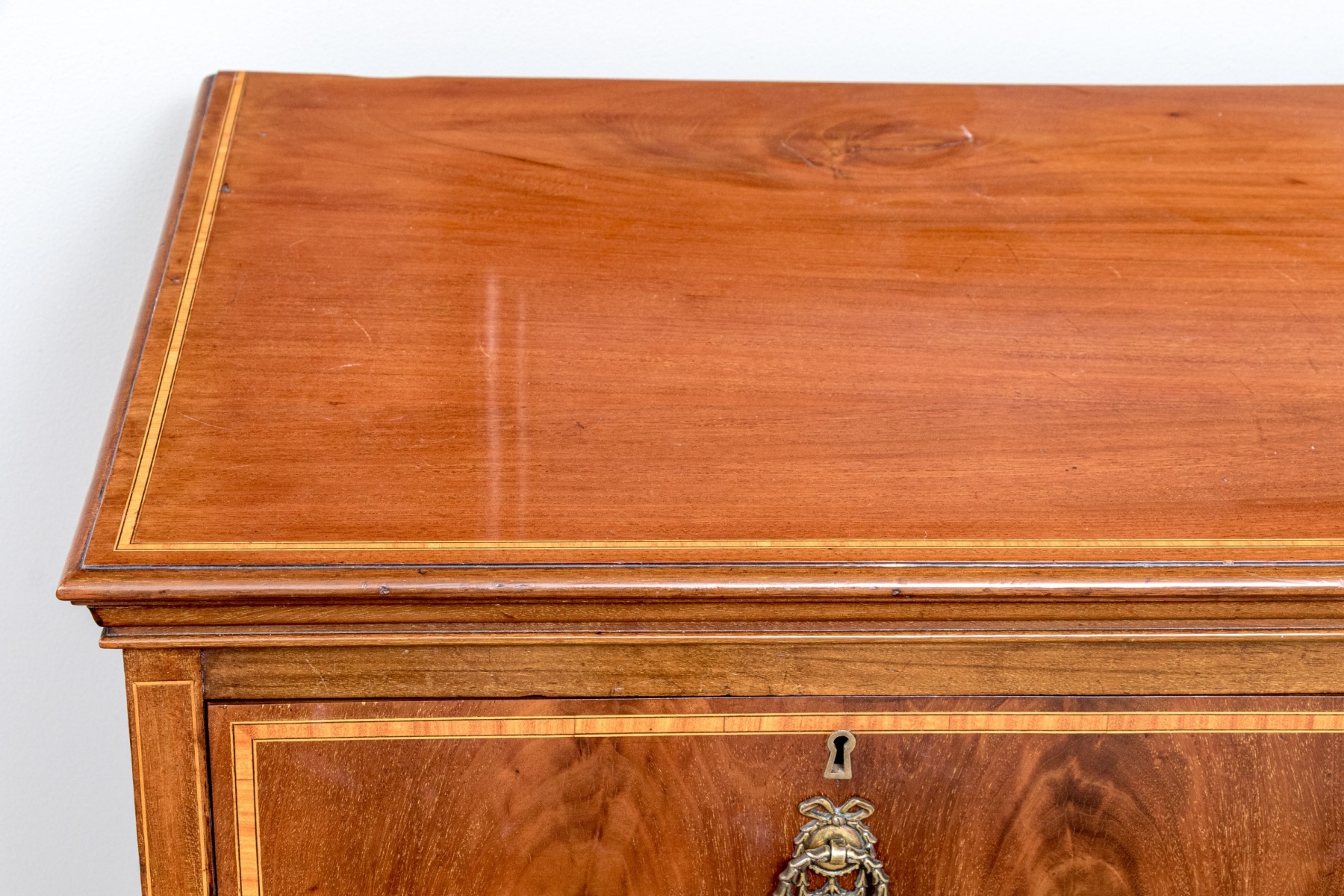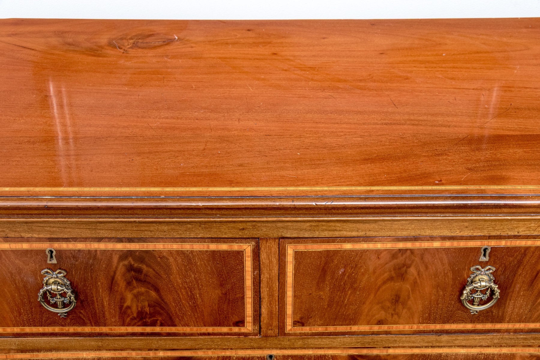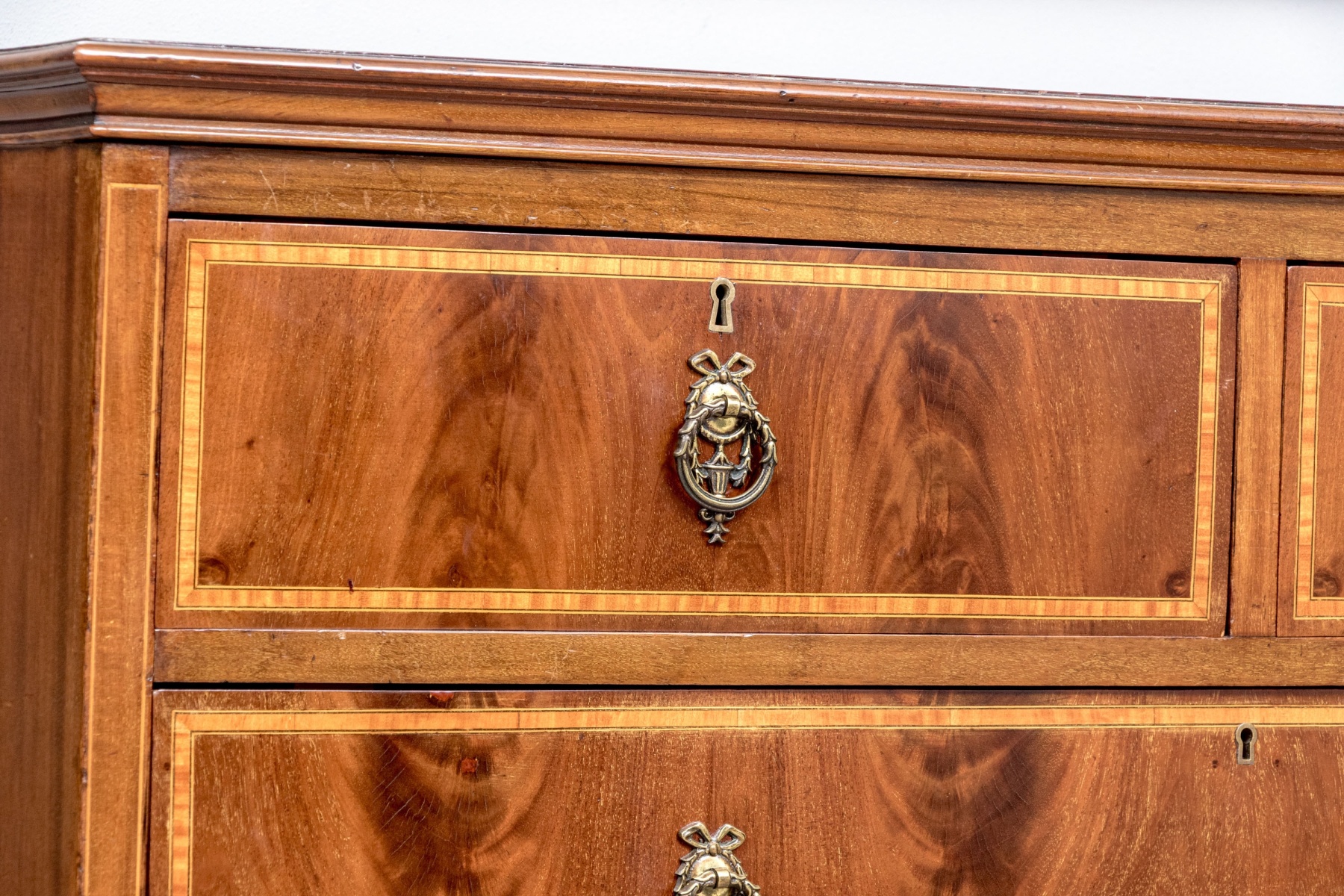 A gorgeous antique chest of drawers in classic Federal style, well crafted with flamed mahogany veneers and satinwood borders for a great touch of contrast. The chest features a two-over-three arrangement of drawers with the lower drawers graduating, each beautifully veneered and adorned with brass wreath loop handles on intricate plaques. Raised on bracket feet, completing the design.