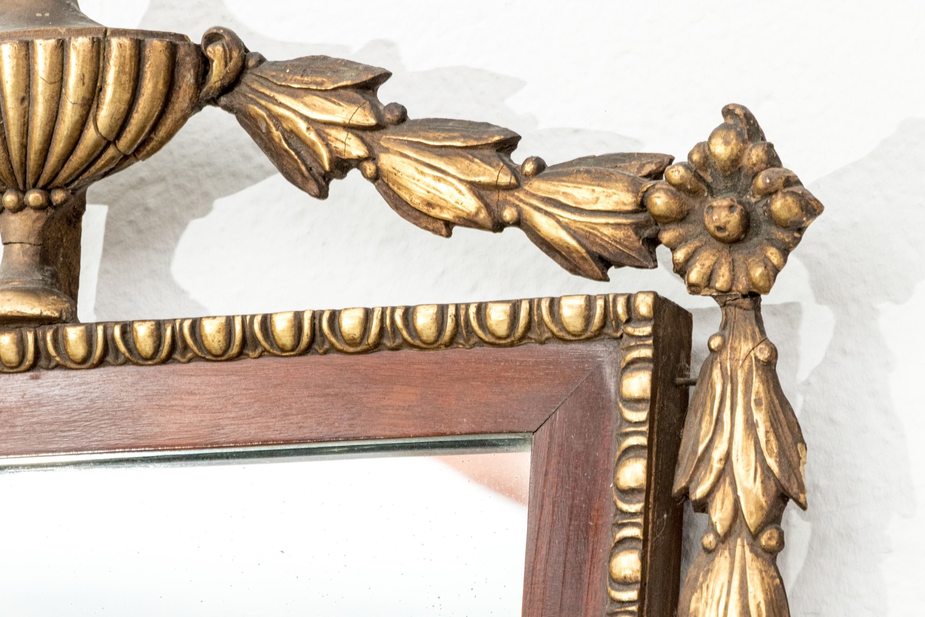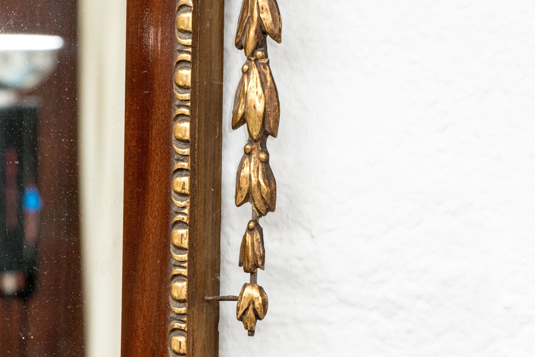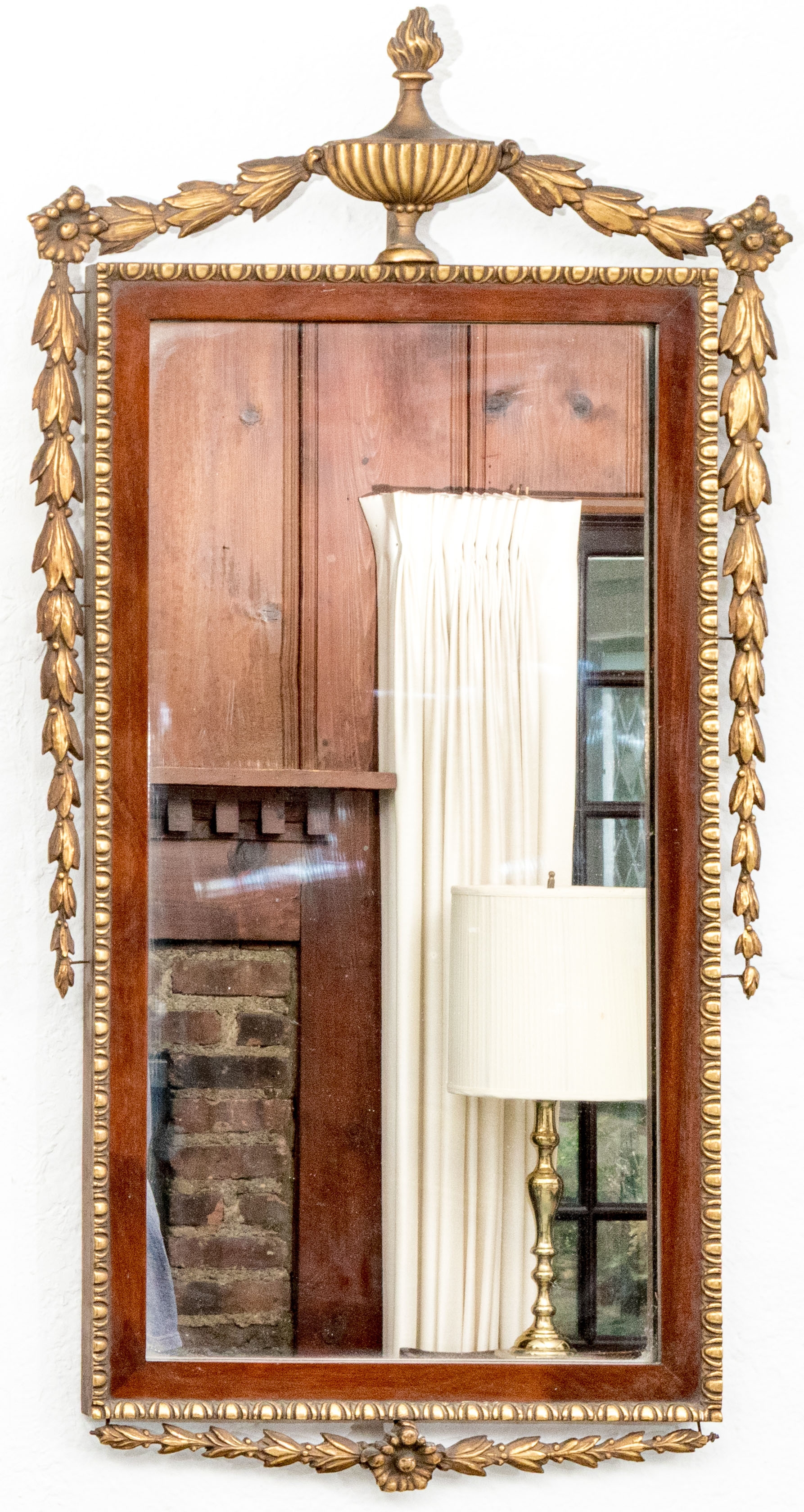 A gorgeous antique mirror with excellent Federal and Neoclassical elegance, showcasing a tall rectangular mirror in a red-brown wood inner frame and egg and dart outer border topped with an impressive gilt oil lamp motif with a flame over an urn-shaped gadrooned font supporting foliate swags with floral corners.