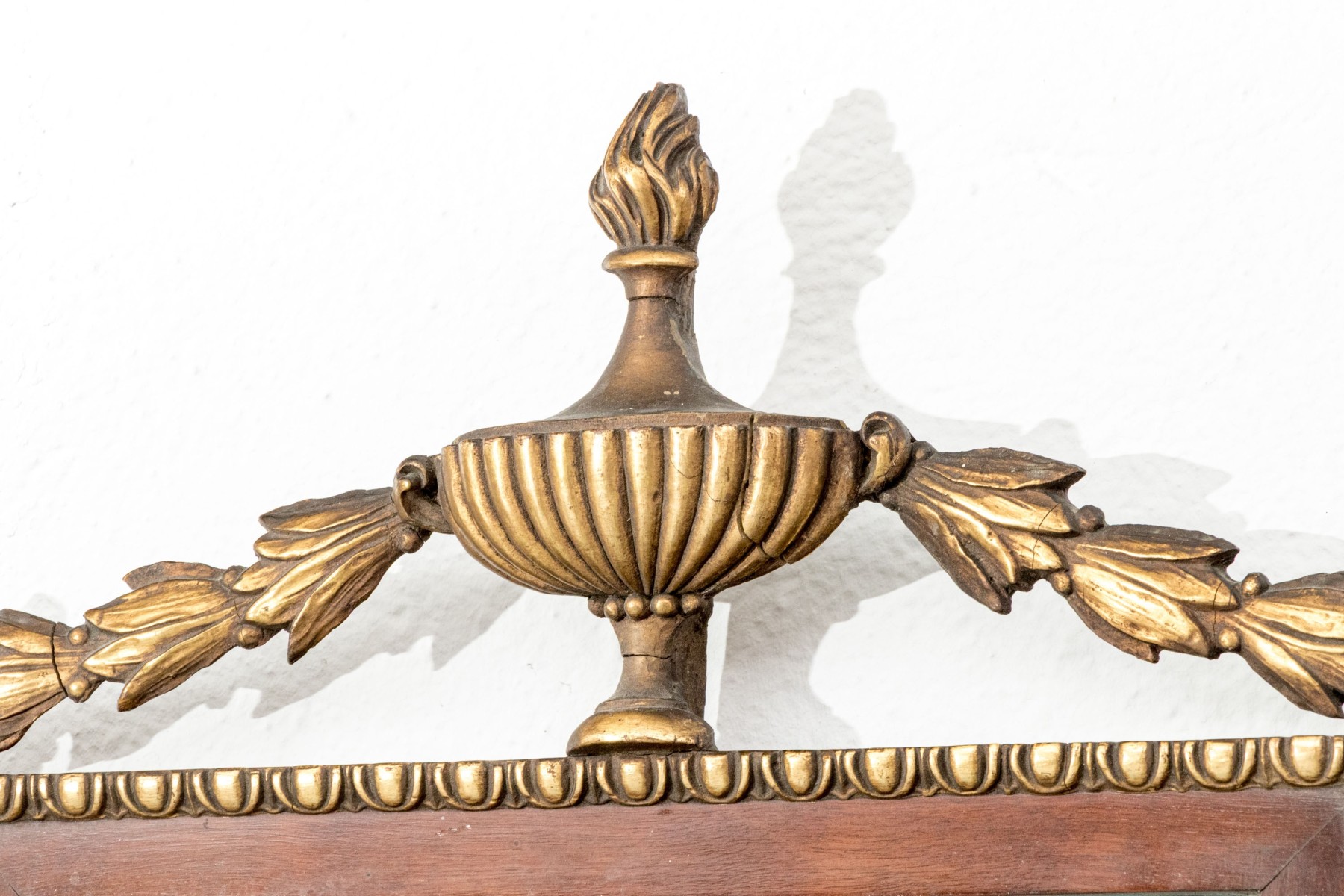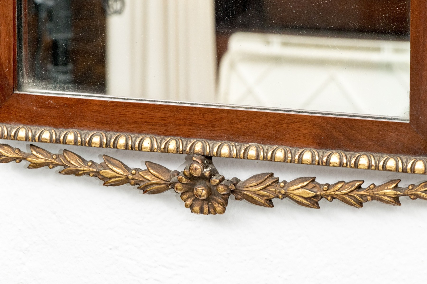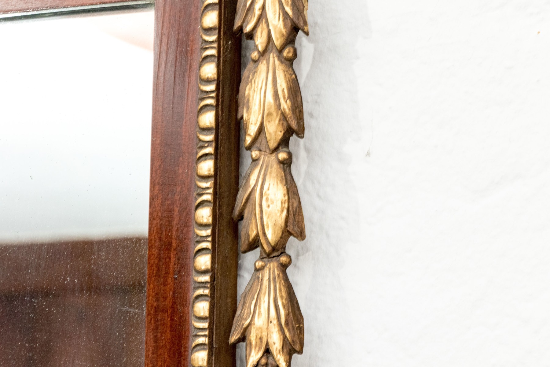 A gorgeous antique mirror with excellent Federal and Neoclassical elegance, showcasing a tall rectangular mirror in a red-brown wood inner frame and egg and dart outer border topped with an impressive gilt oil lamp motif with a flame over an urn-shaped gadrooned font supporting foliate swags with floral corners.