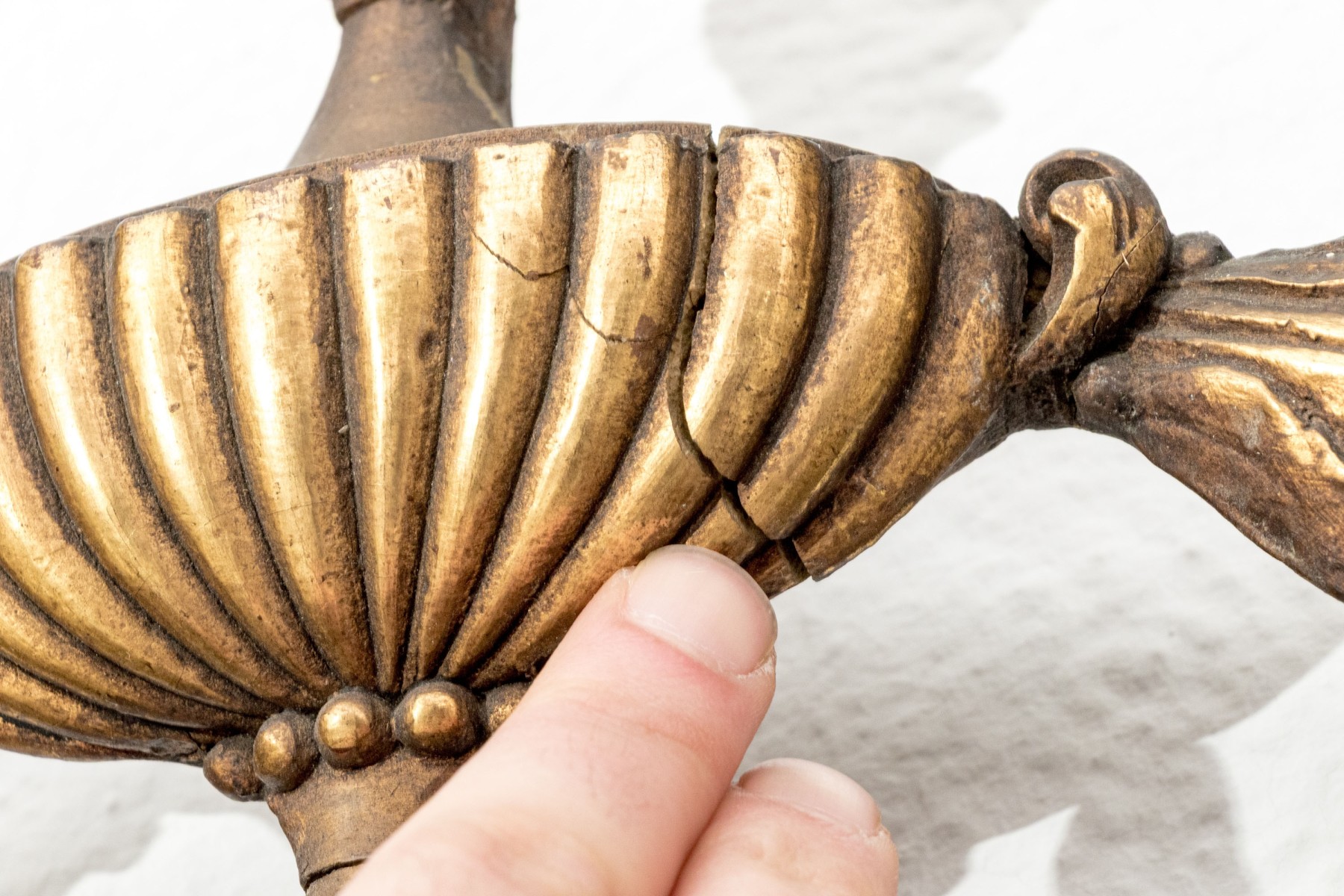 Breaks, losses, and checking commensurate with age and display. Small wear to interior frame. Despite wear still a handsome piece overall.