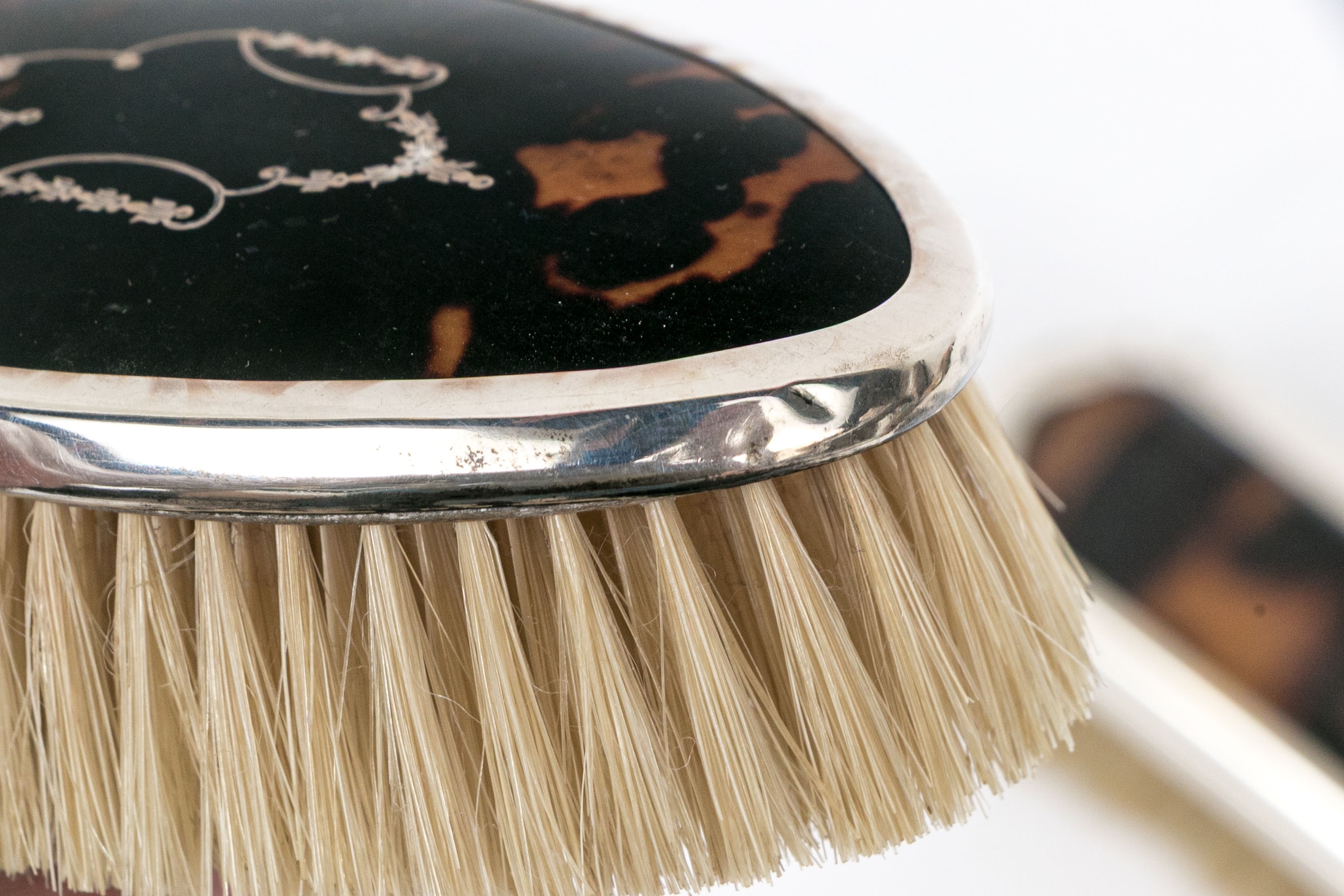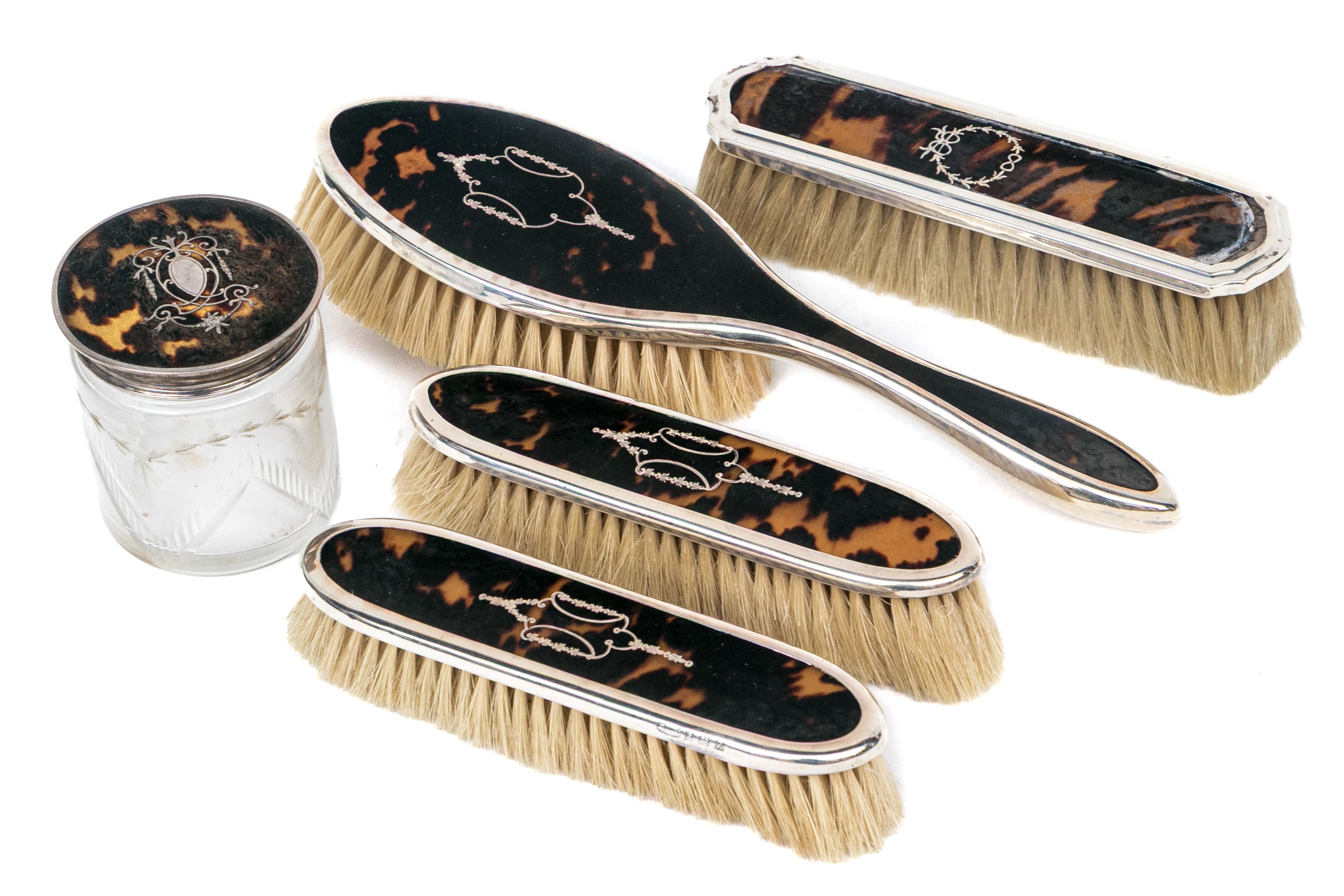 Antique Five Piece English Sterling Silver Mounted Tortoise Dresser Set
