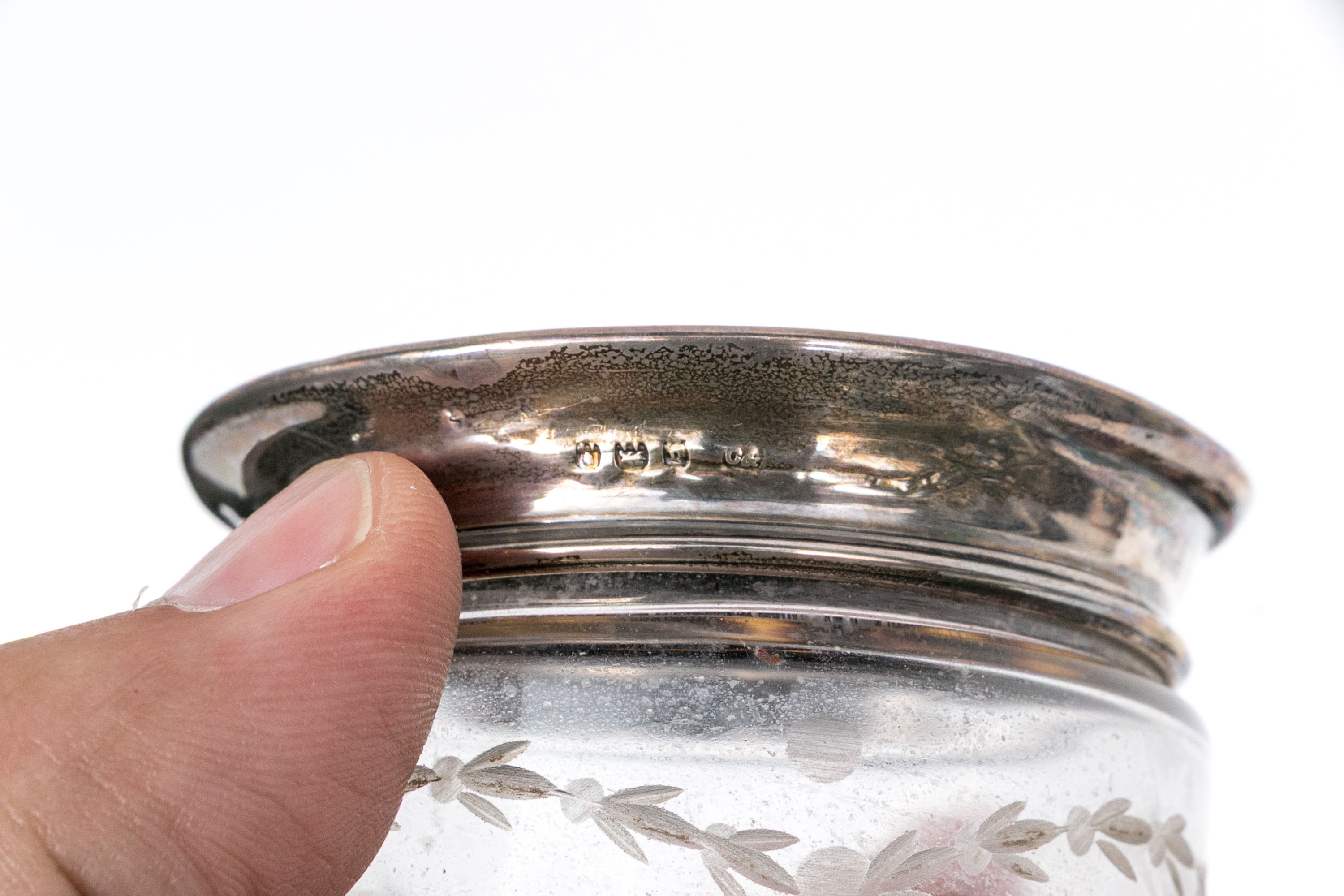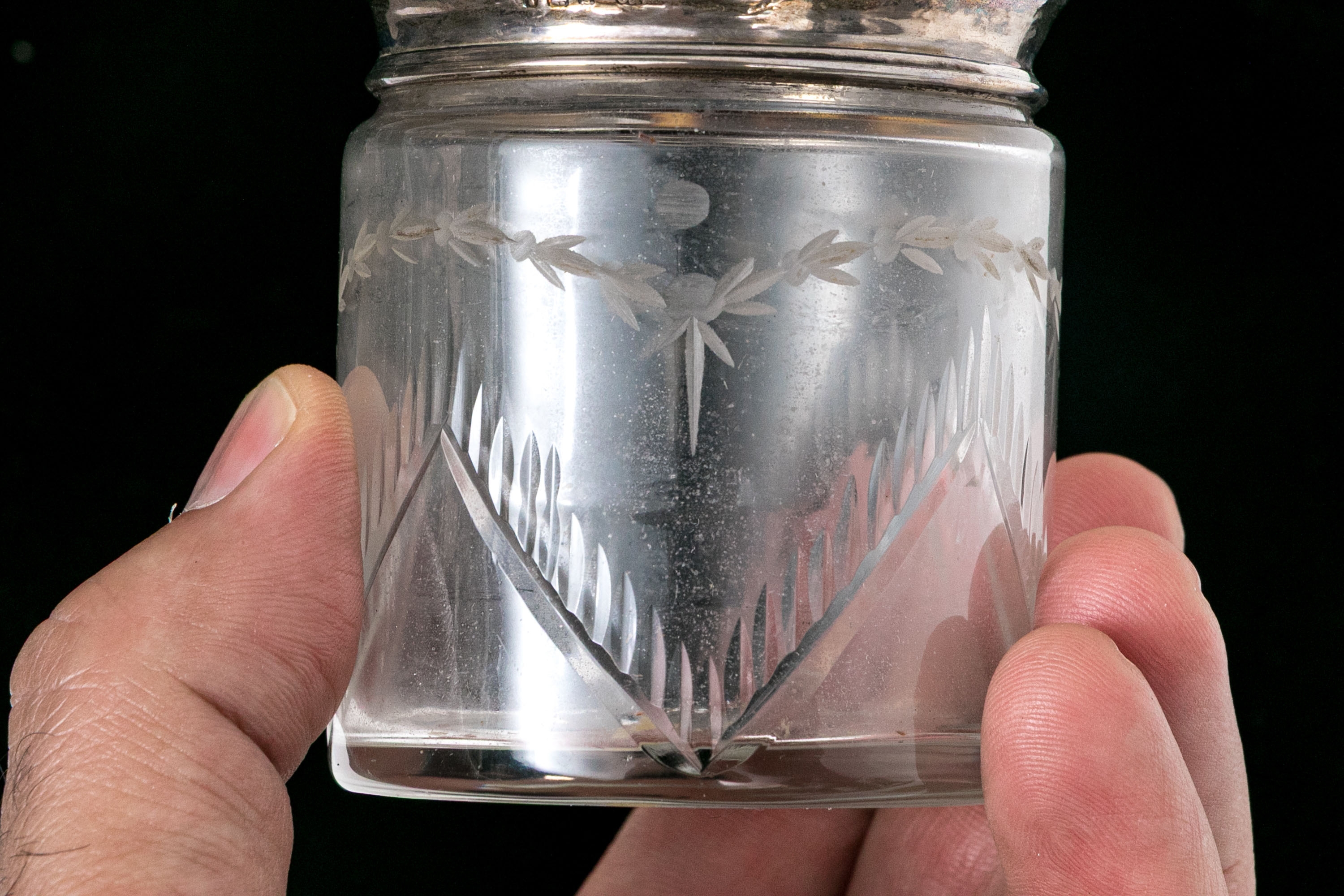 and a glass dresser jar with etched and cut decoration with a tortoise lid with a foliate framed medallion. The sterling marks are worn.