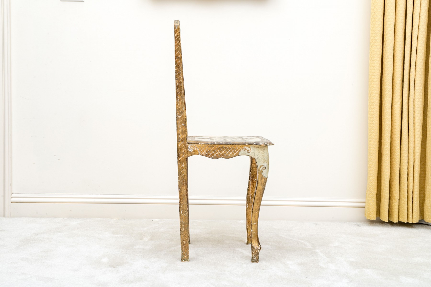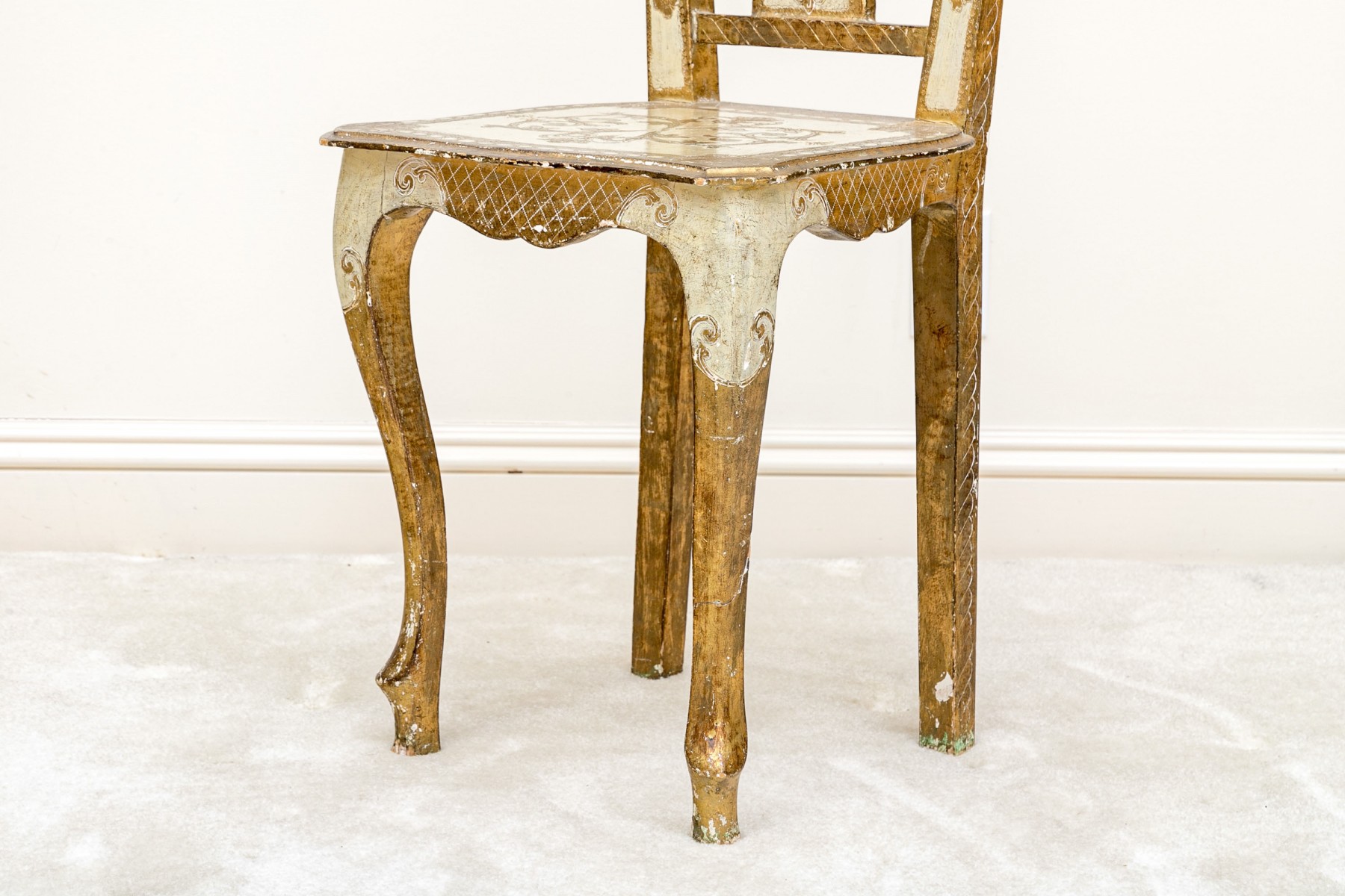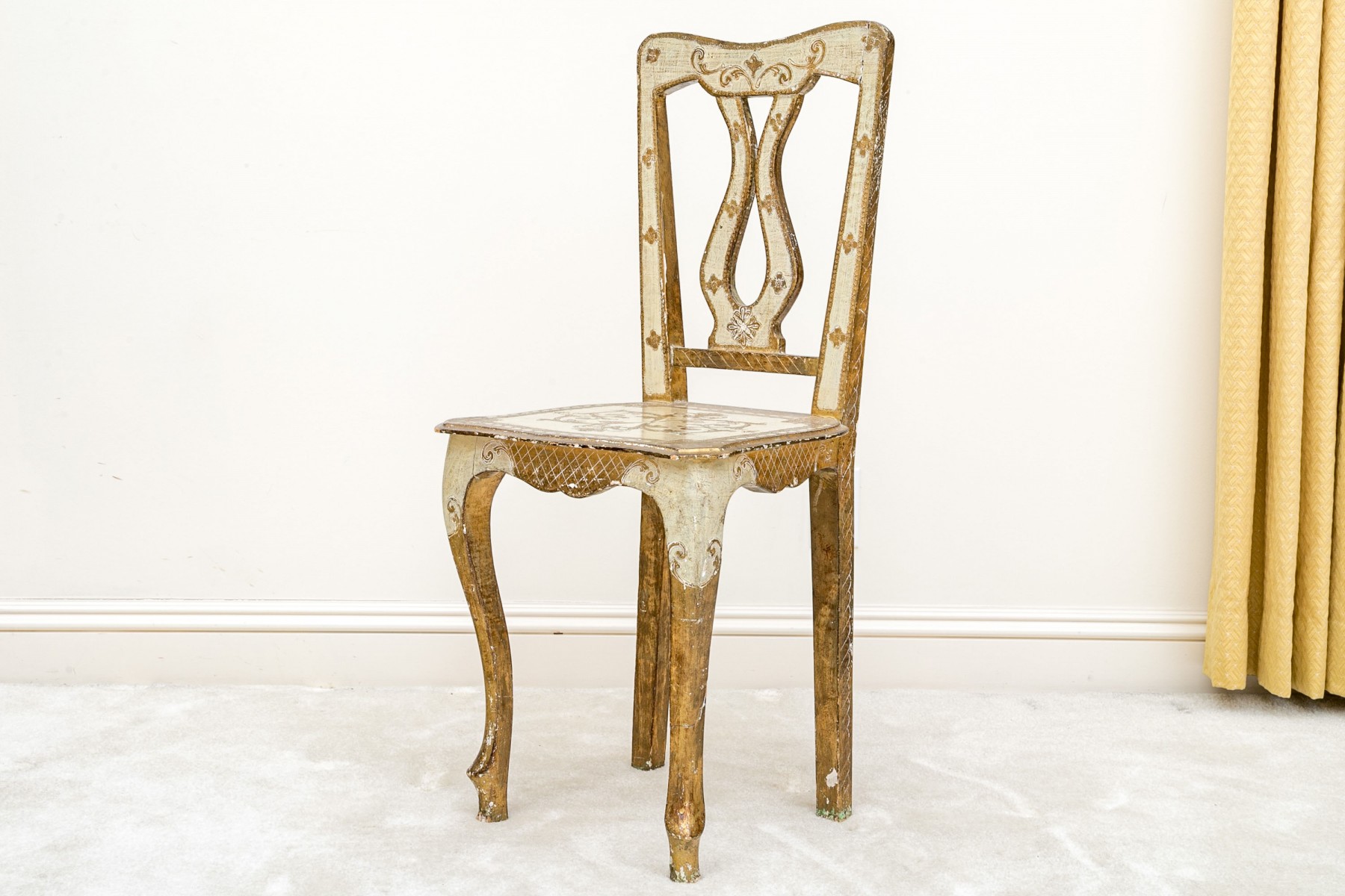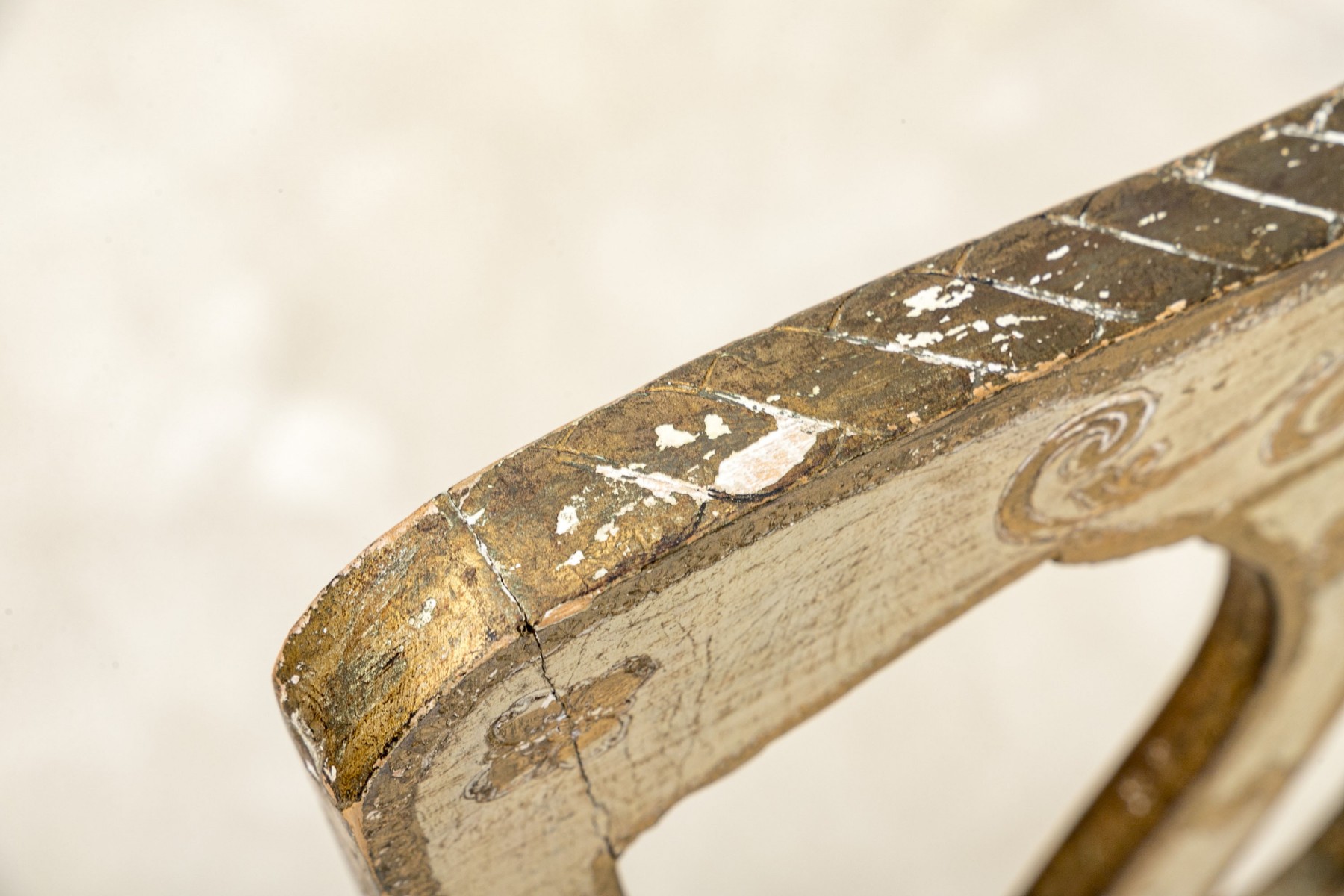 Condition: One of the back legs has been previously restored. There are splits and losses to the wood and paint finish throughout commensurate with age and use but overall presents nicely.