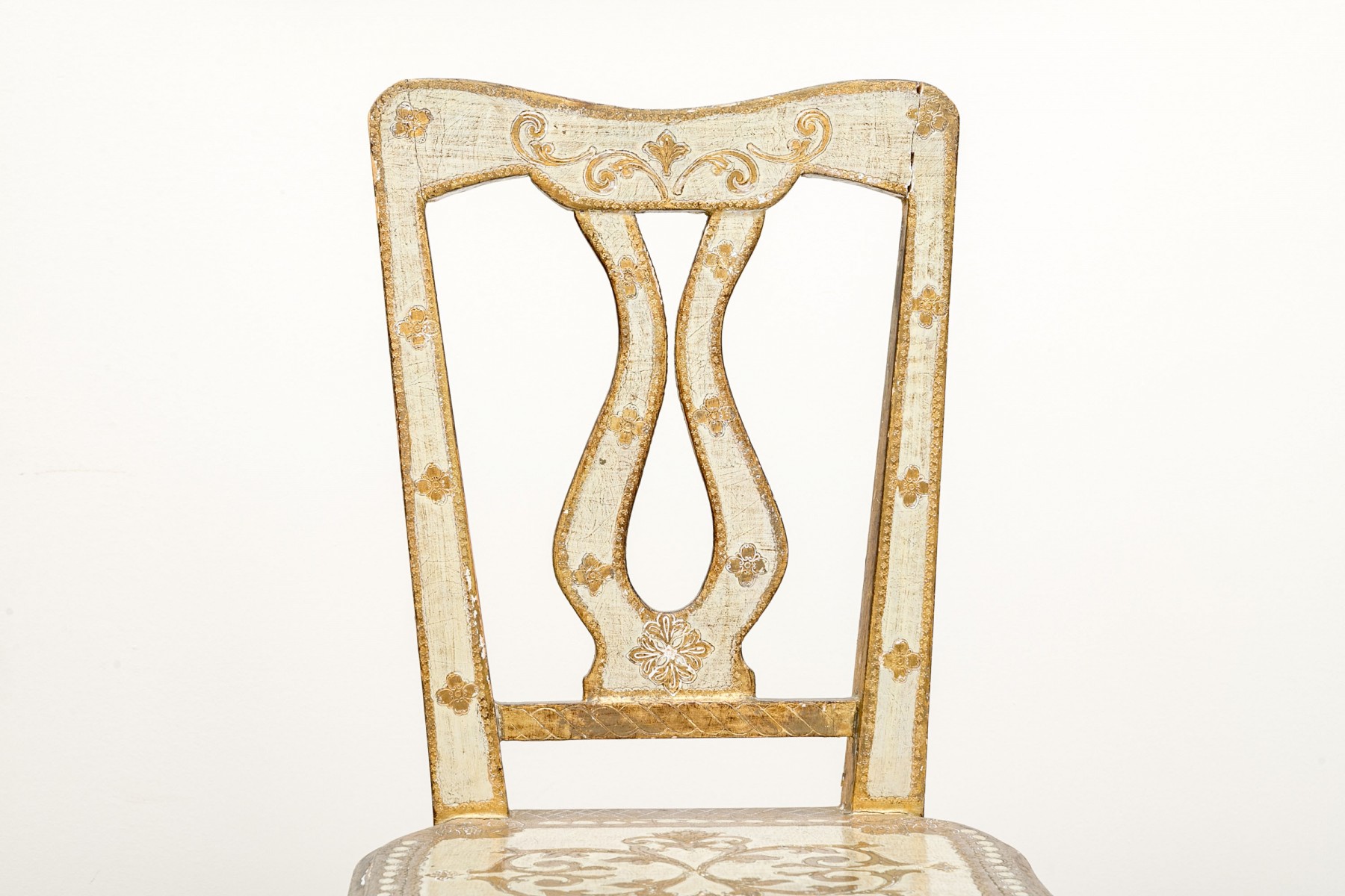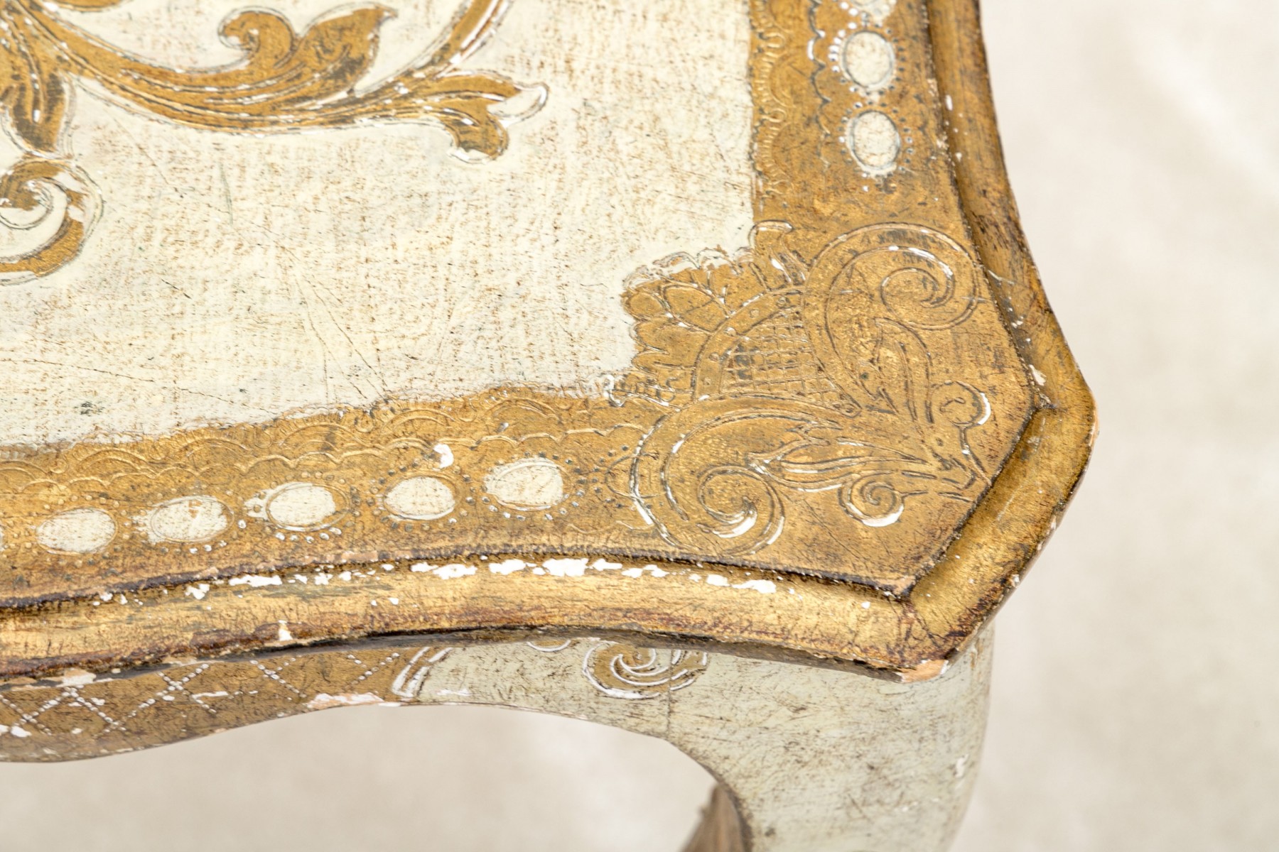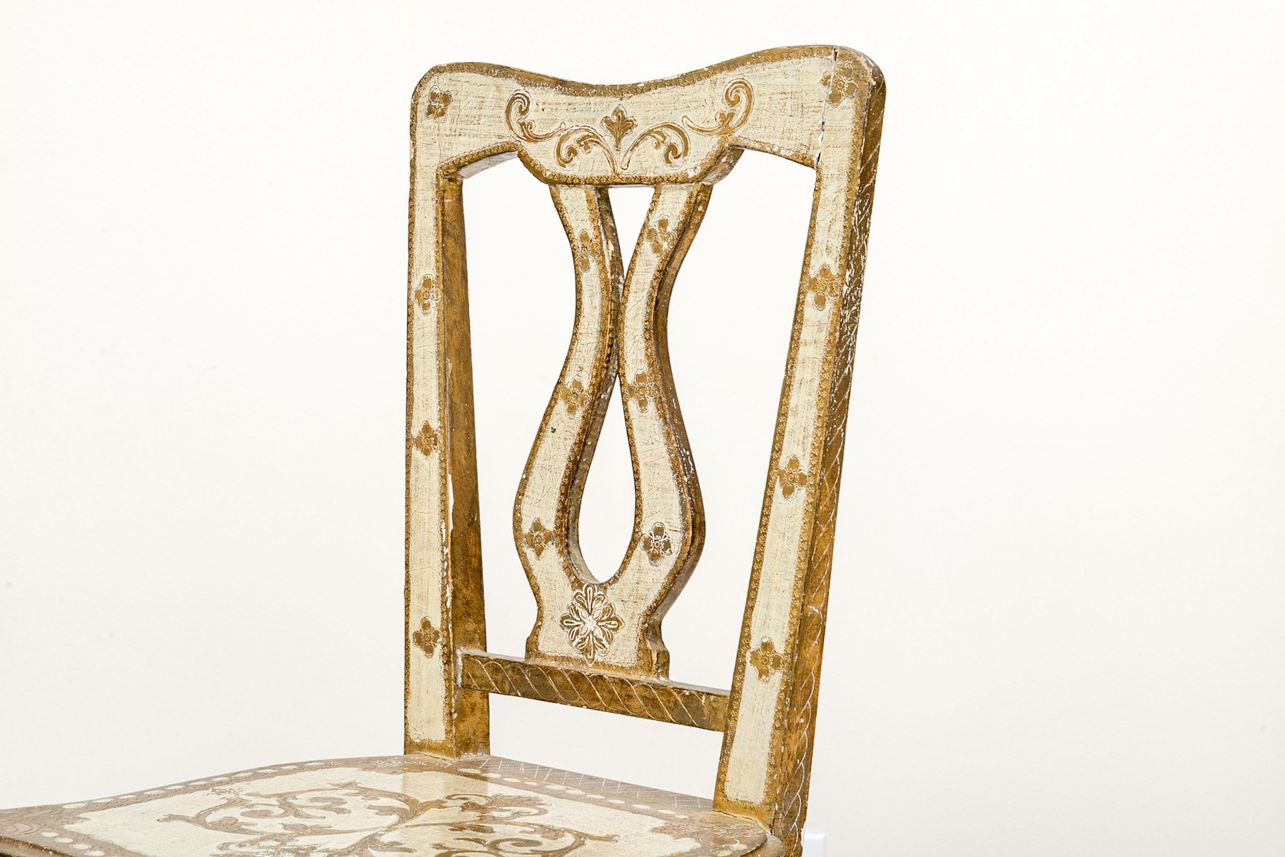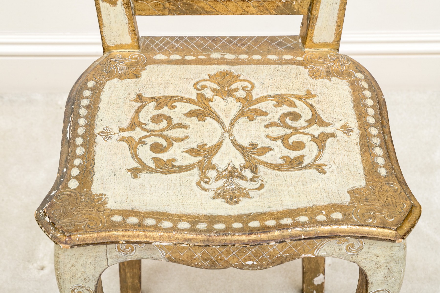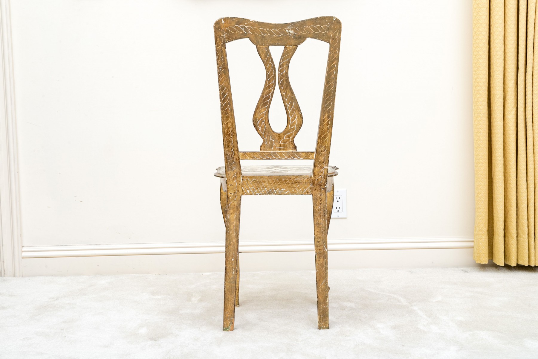 Condition: One of the back legs has been previously restored. There are splits and losses to the wood and paint finish throughout commensurate with age and use but overall presents nicely.