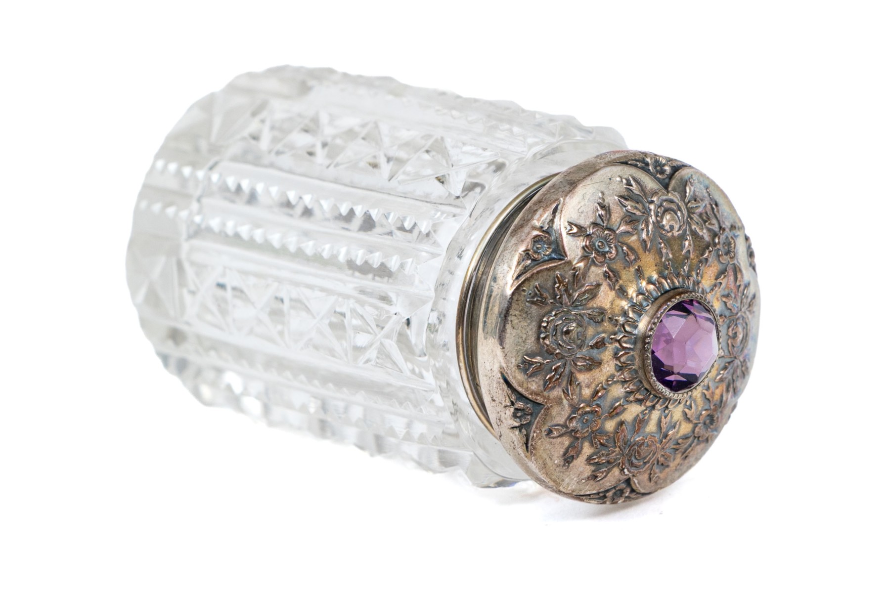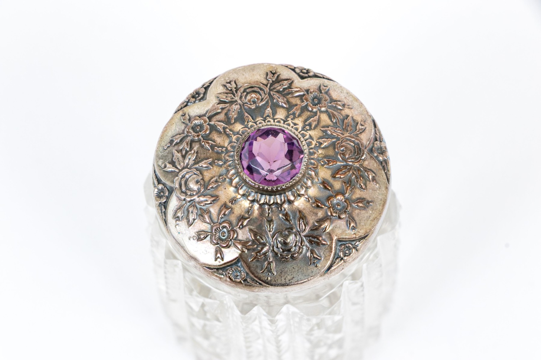 A fine antique Bailey & Co. crystal vanity jar in cylindrical form with fine geometric cut columns all around, topped with an elegant sterling silver lid bezel set with a purple glass stone surrounded by floral scalloping and relief motifs.