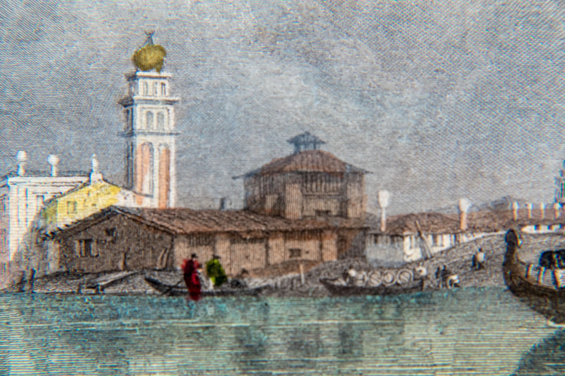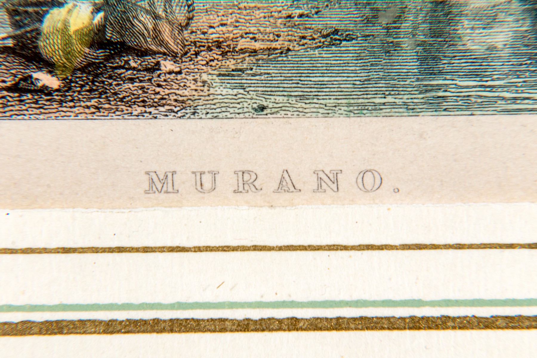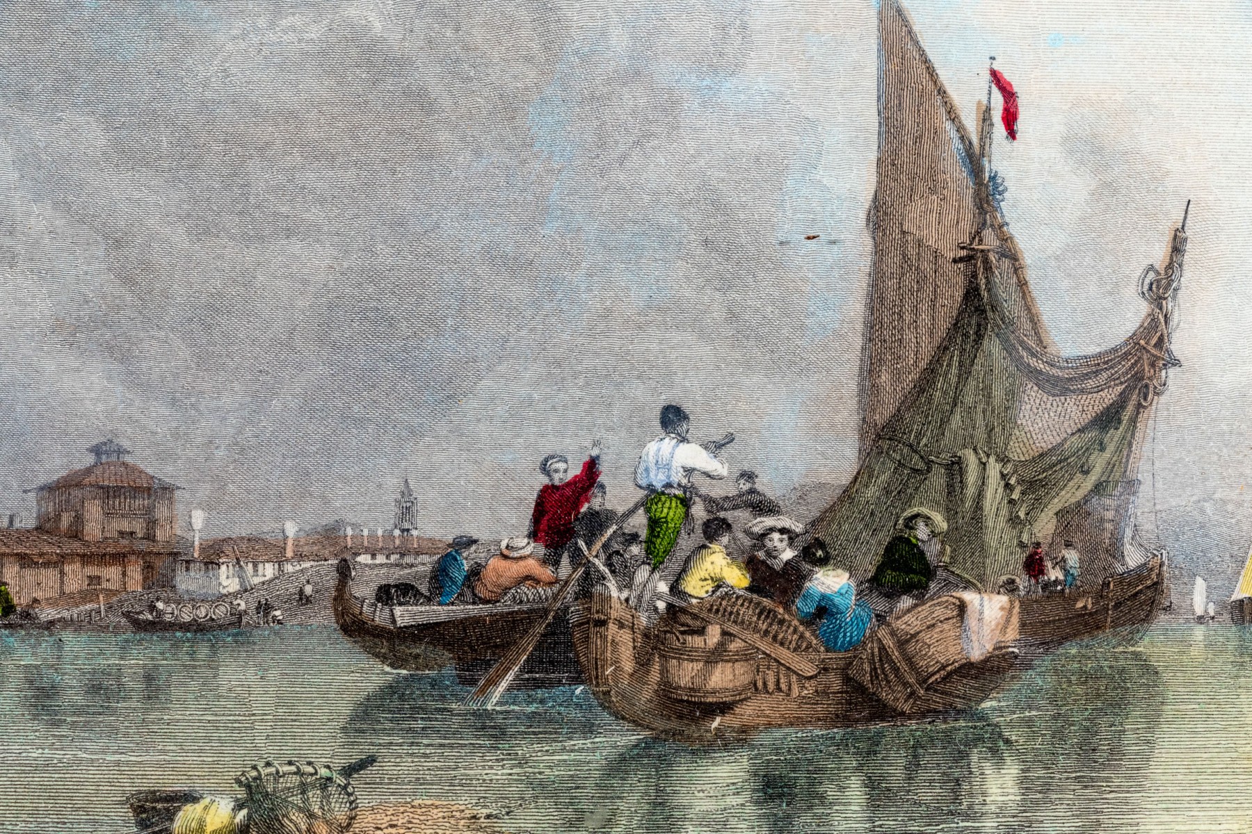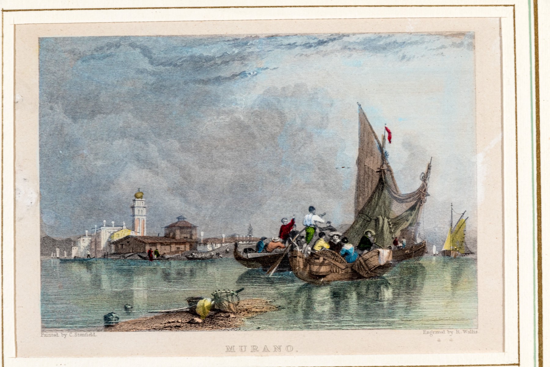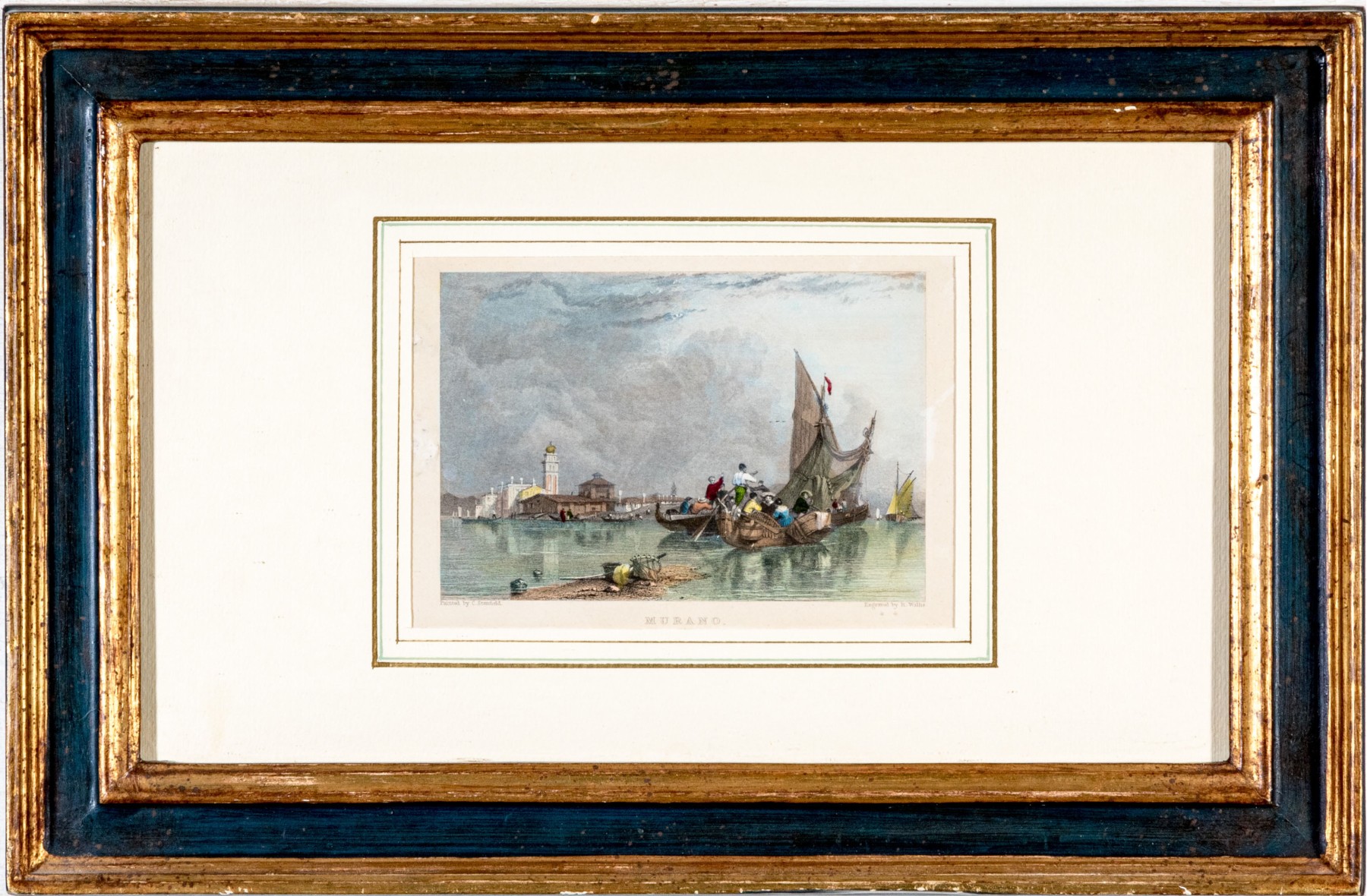 Engraved by R. Wallis after a painting by C. Stanfield. Figures are in boats in the lagoon off the island of Murano in the distance. Presented in a painted and gilt wood frame with glass.