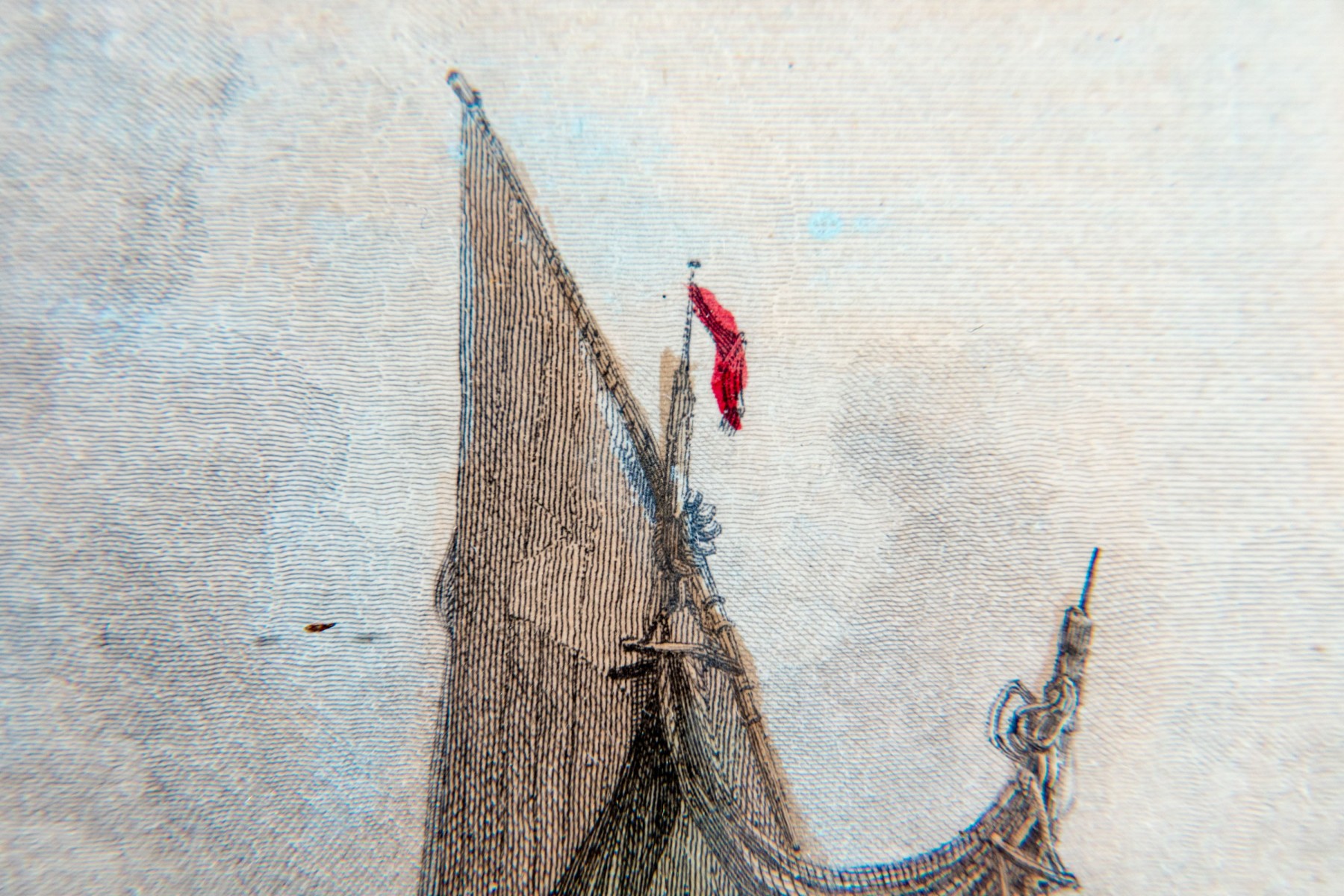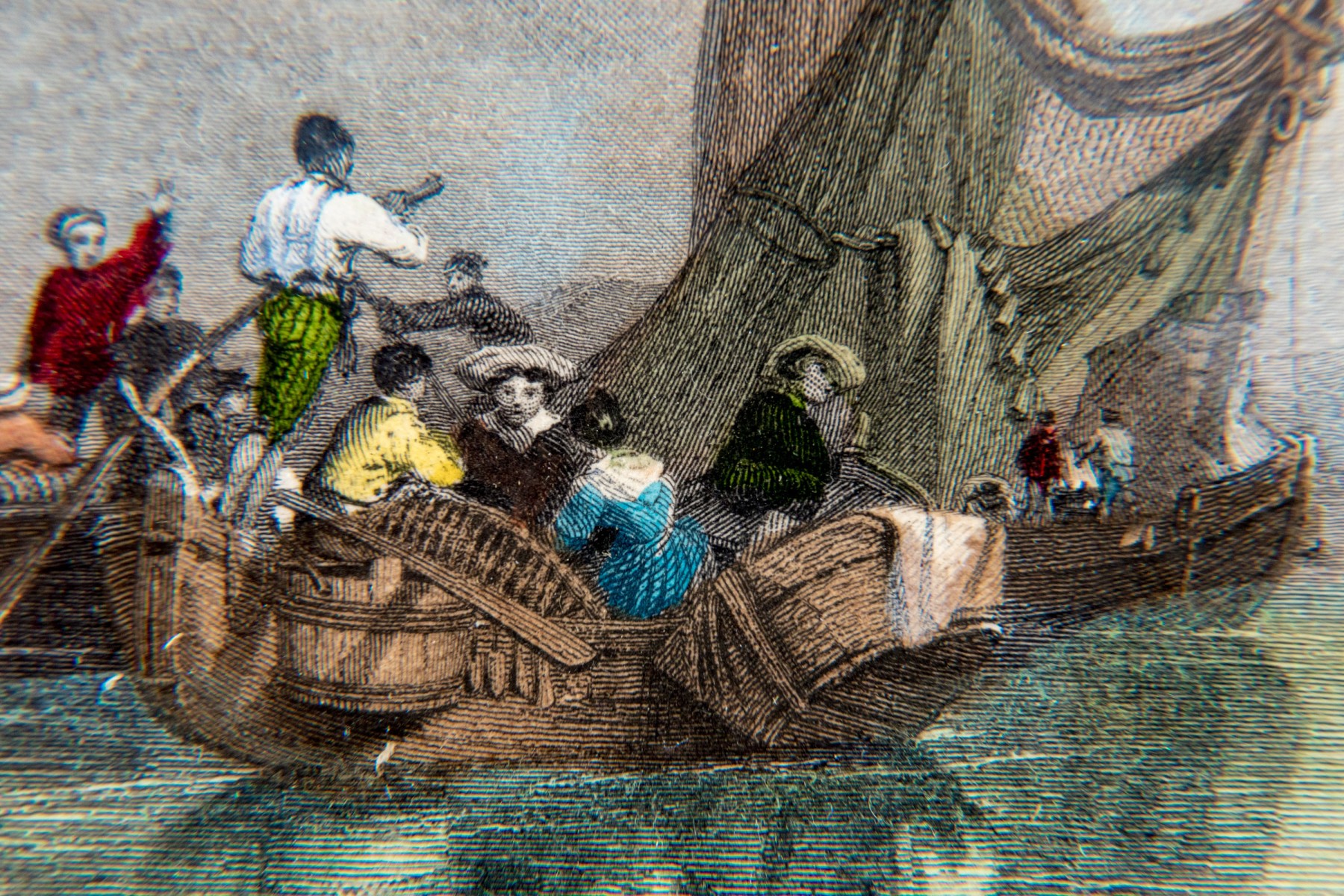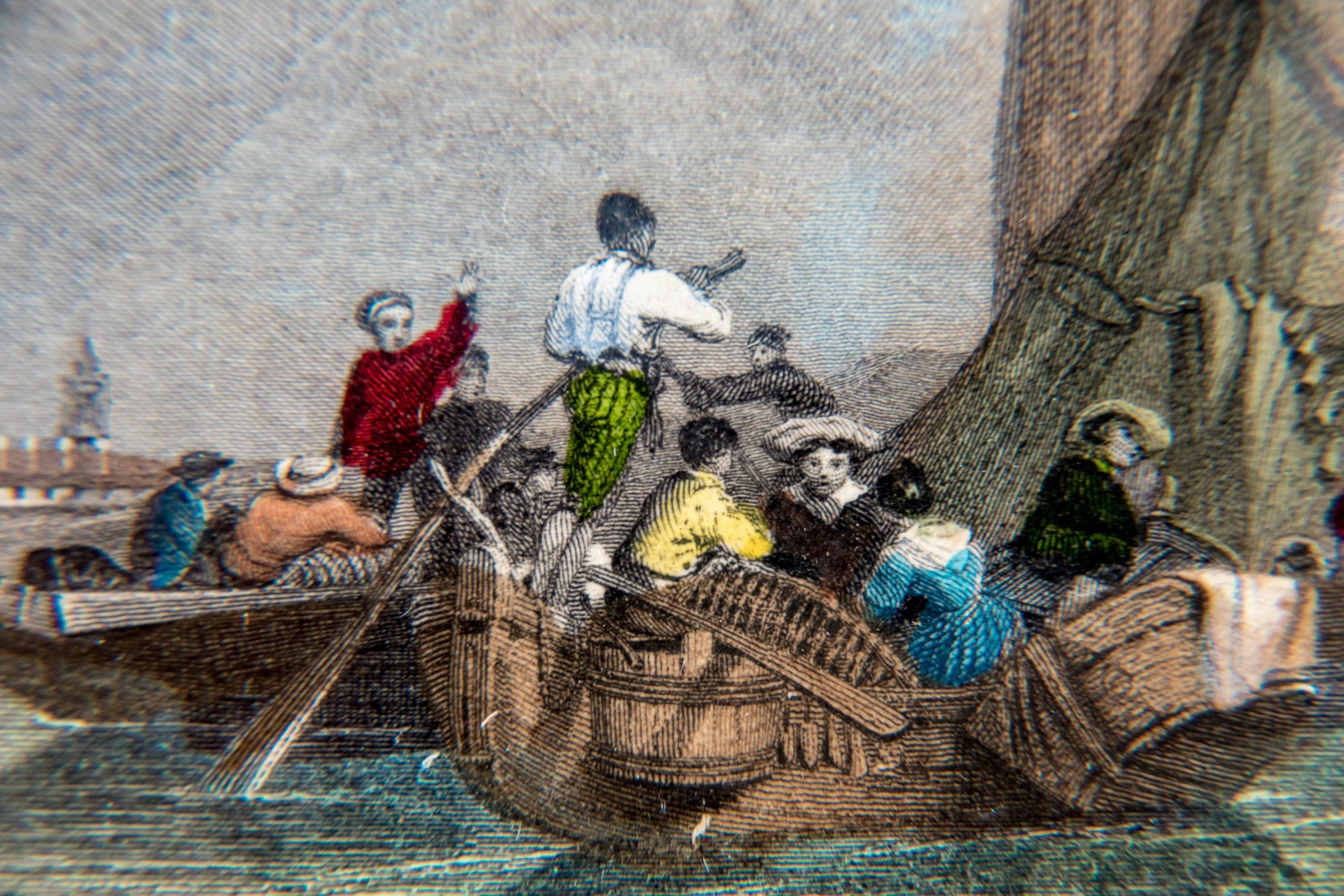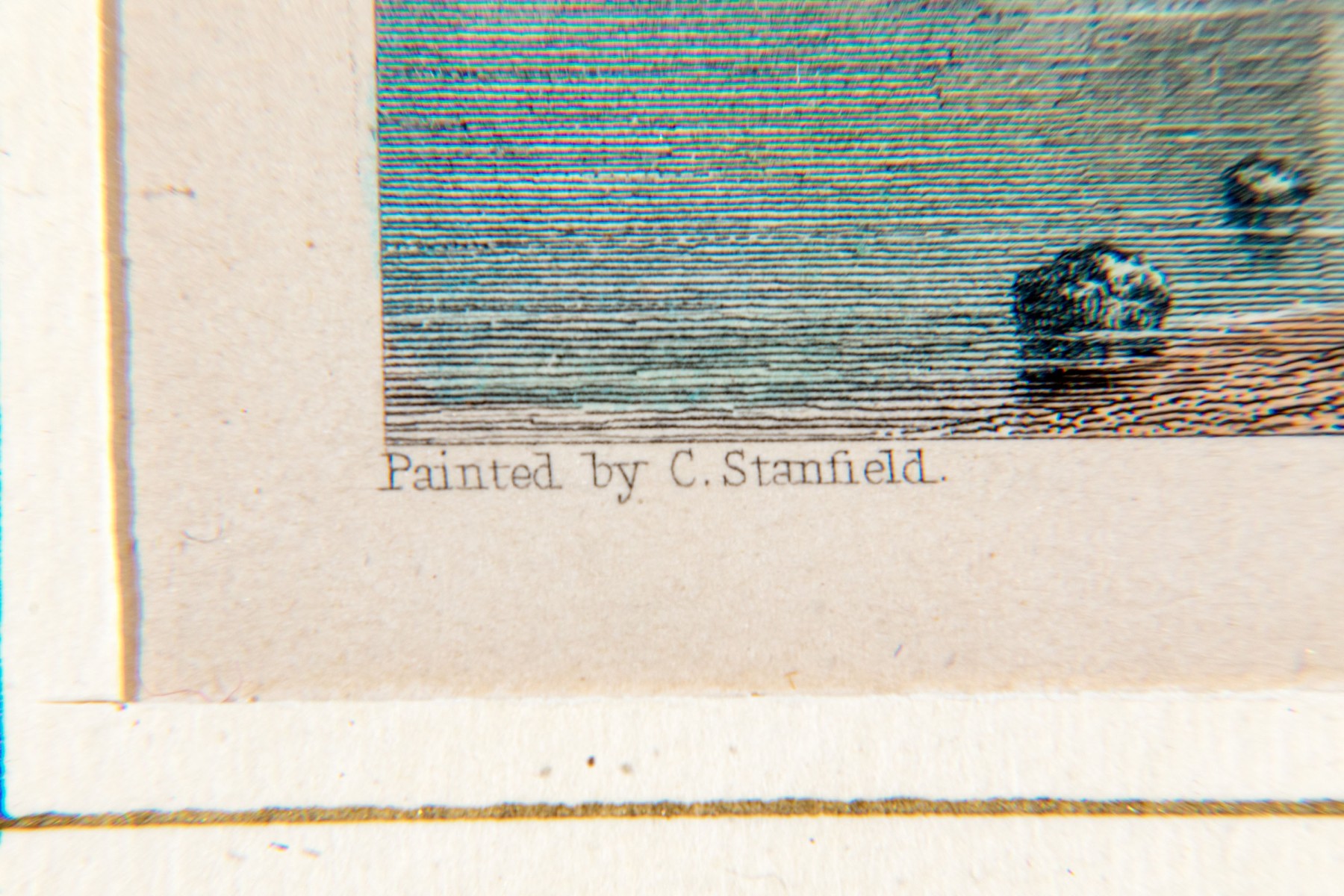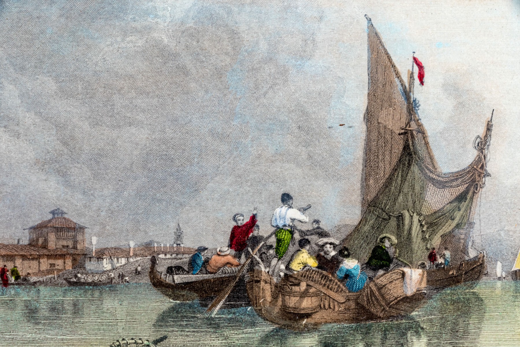 Engraved by R. Wallis after a painting by C. Stanfield. Figures are in boats in the lagoon off the island of Murano in the distance. Presented in a painted and gilt wood frame with glass.