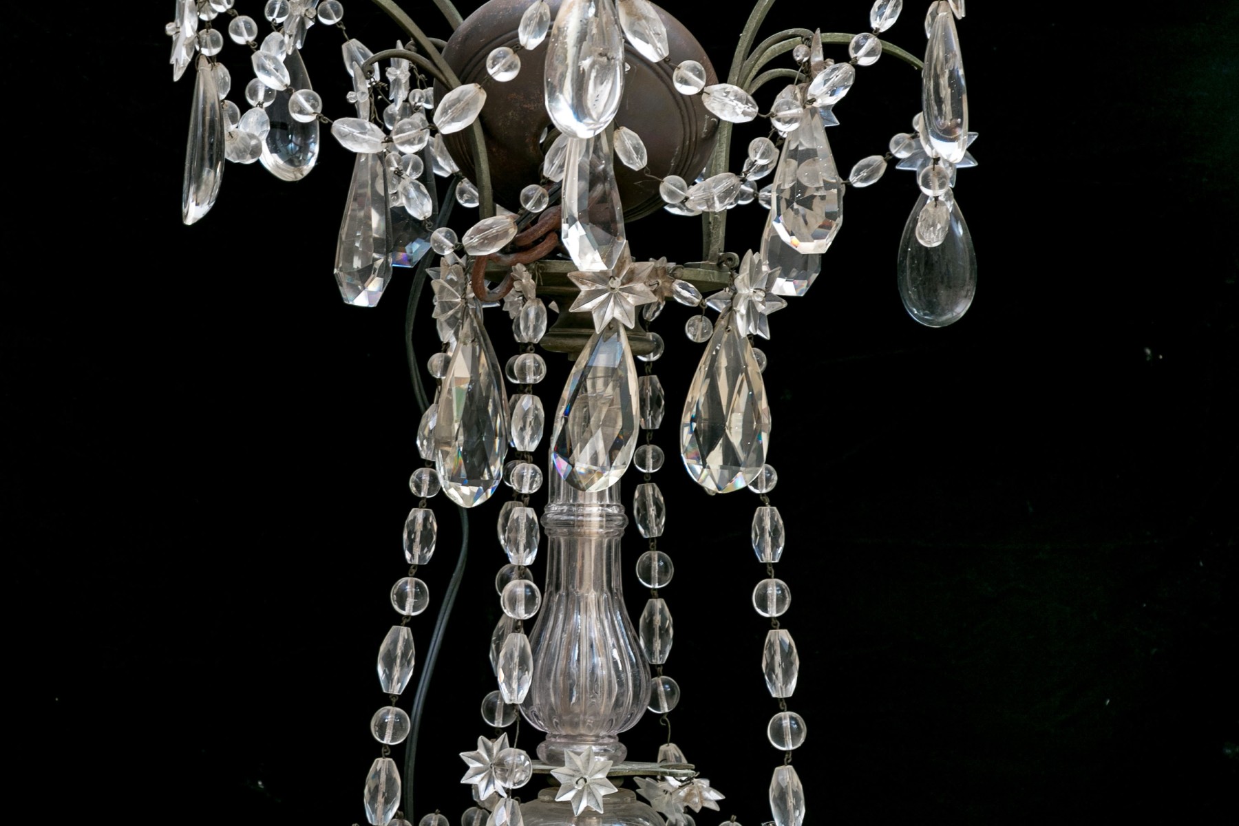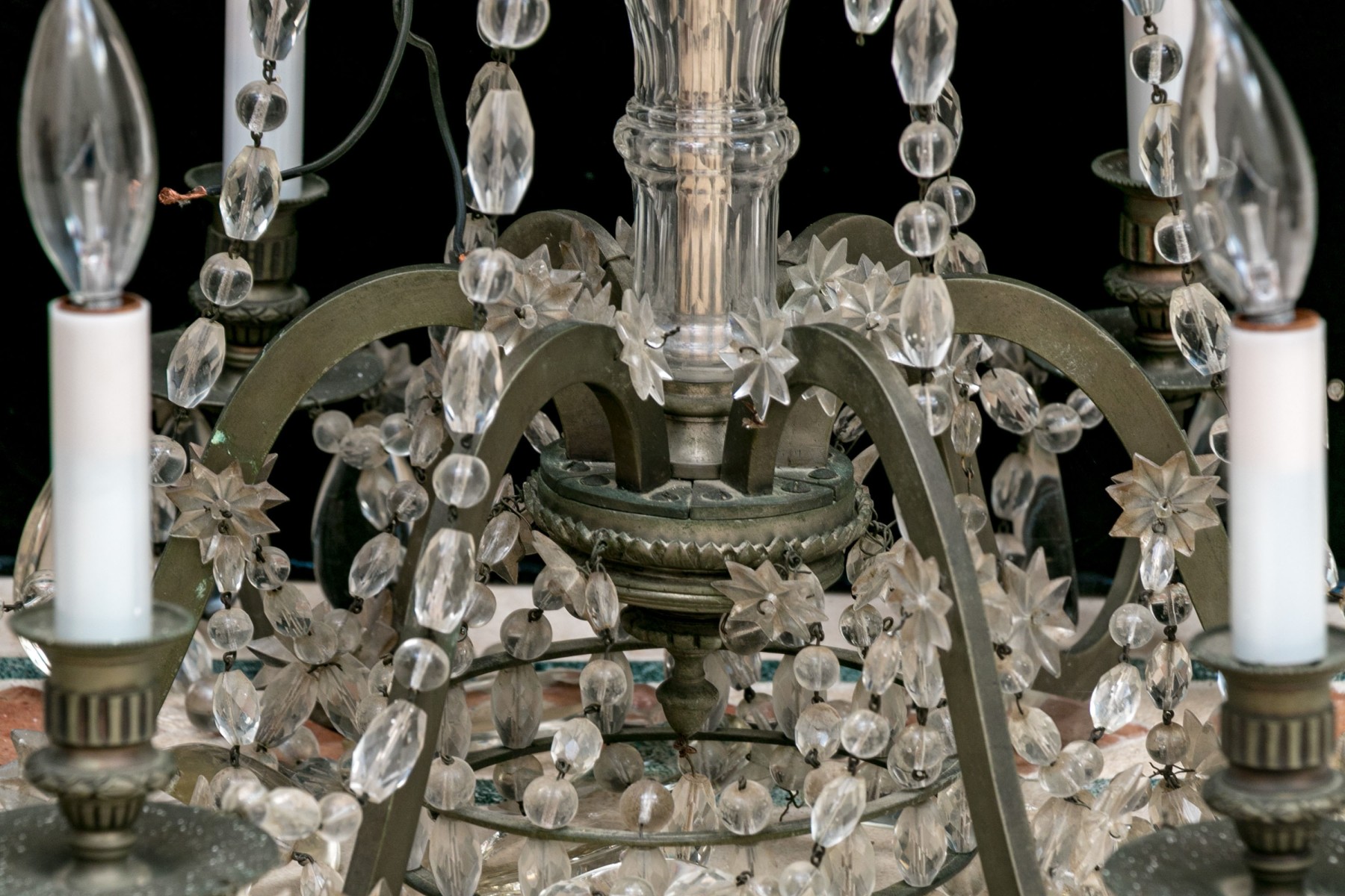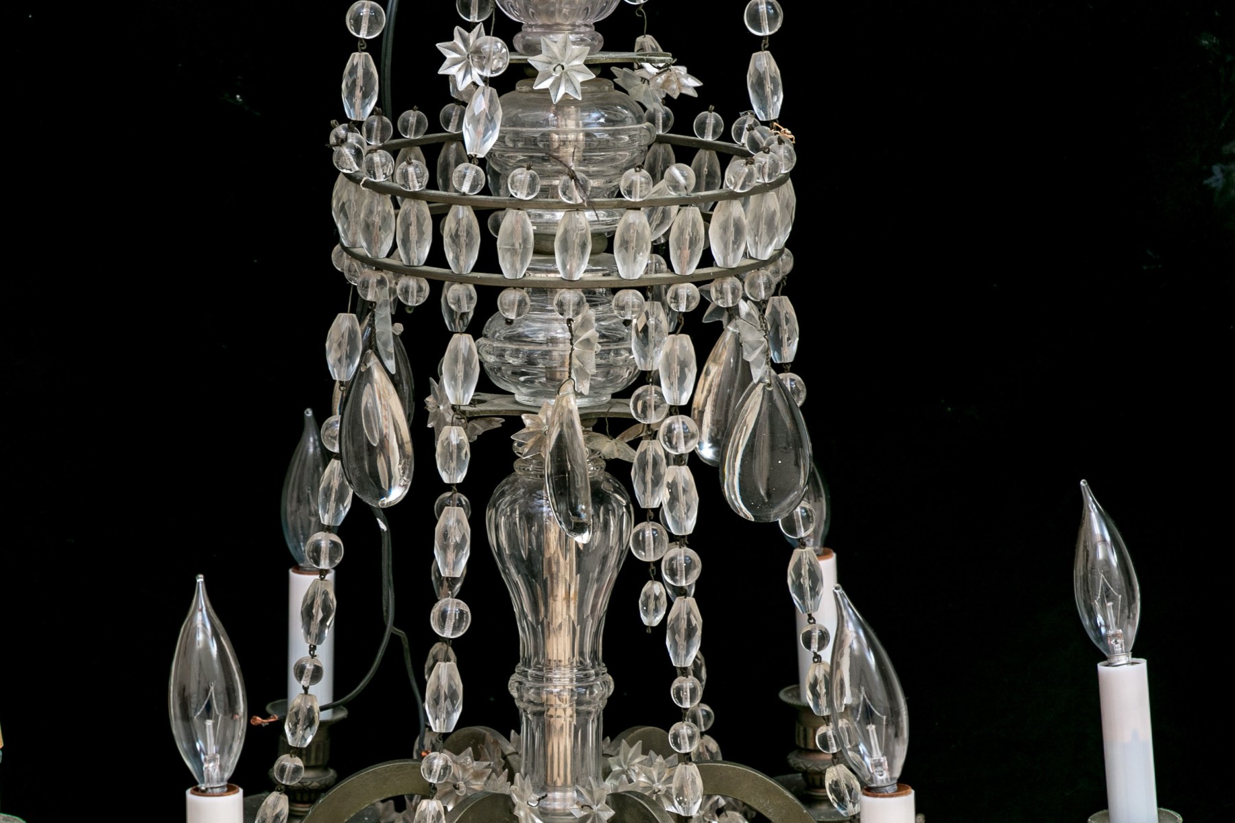 An antique French 6-light chandelier crafted from cut clear crystal, beads, and pendent swags, with a sturdy wrought iron frame.