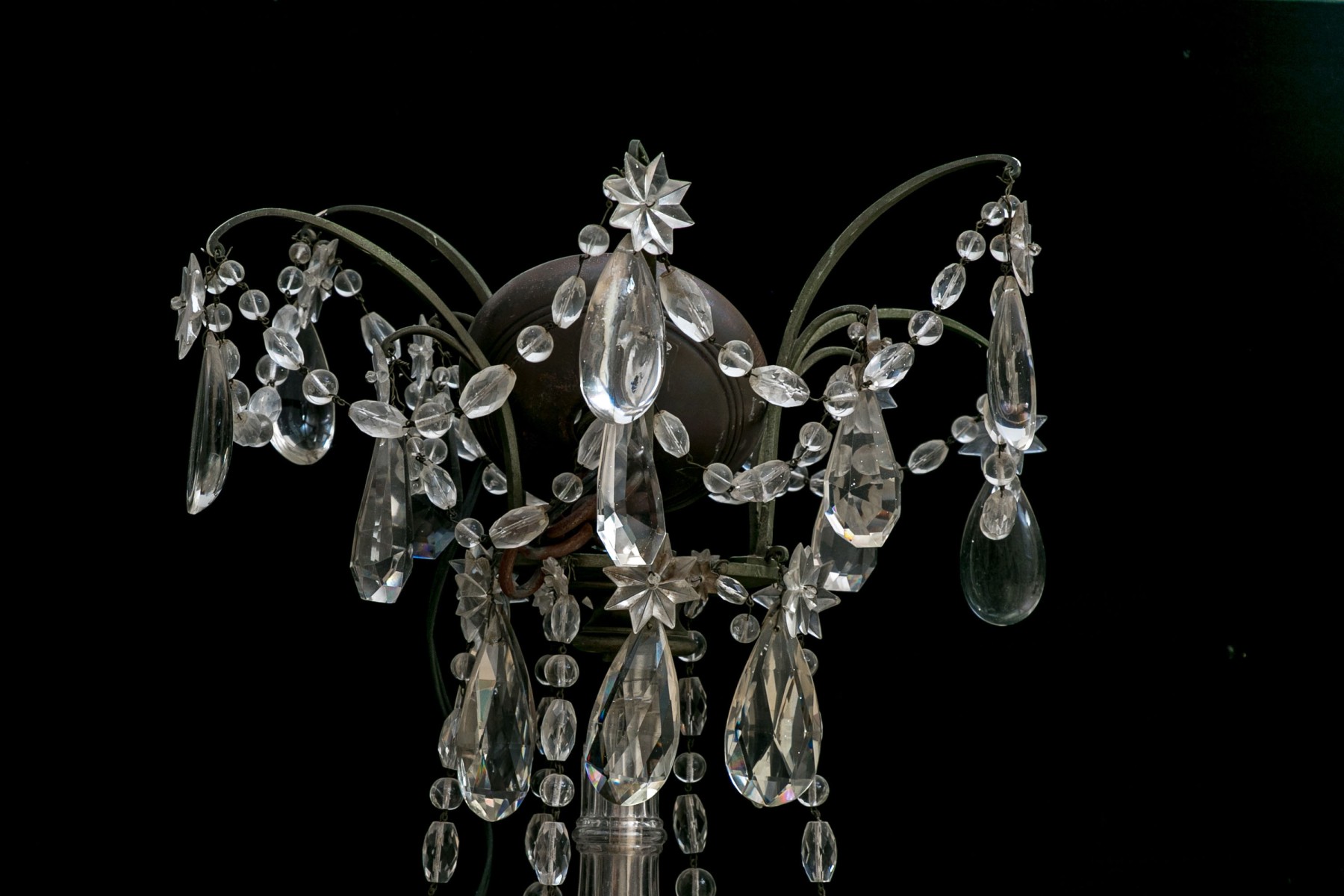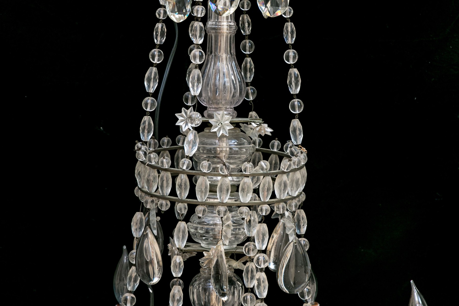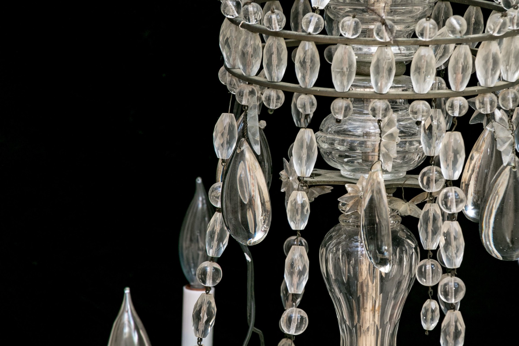 An antique French 6-light chandelier crafted from cut clear crystal, beads, and pendent swags, with a sturdy wrought iron frame.
