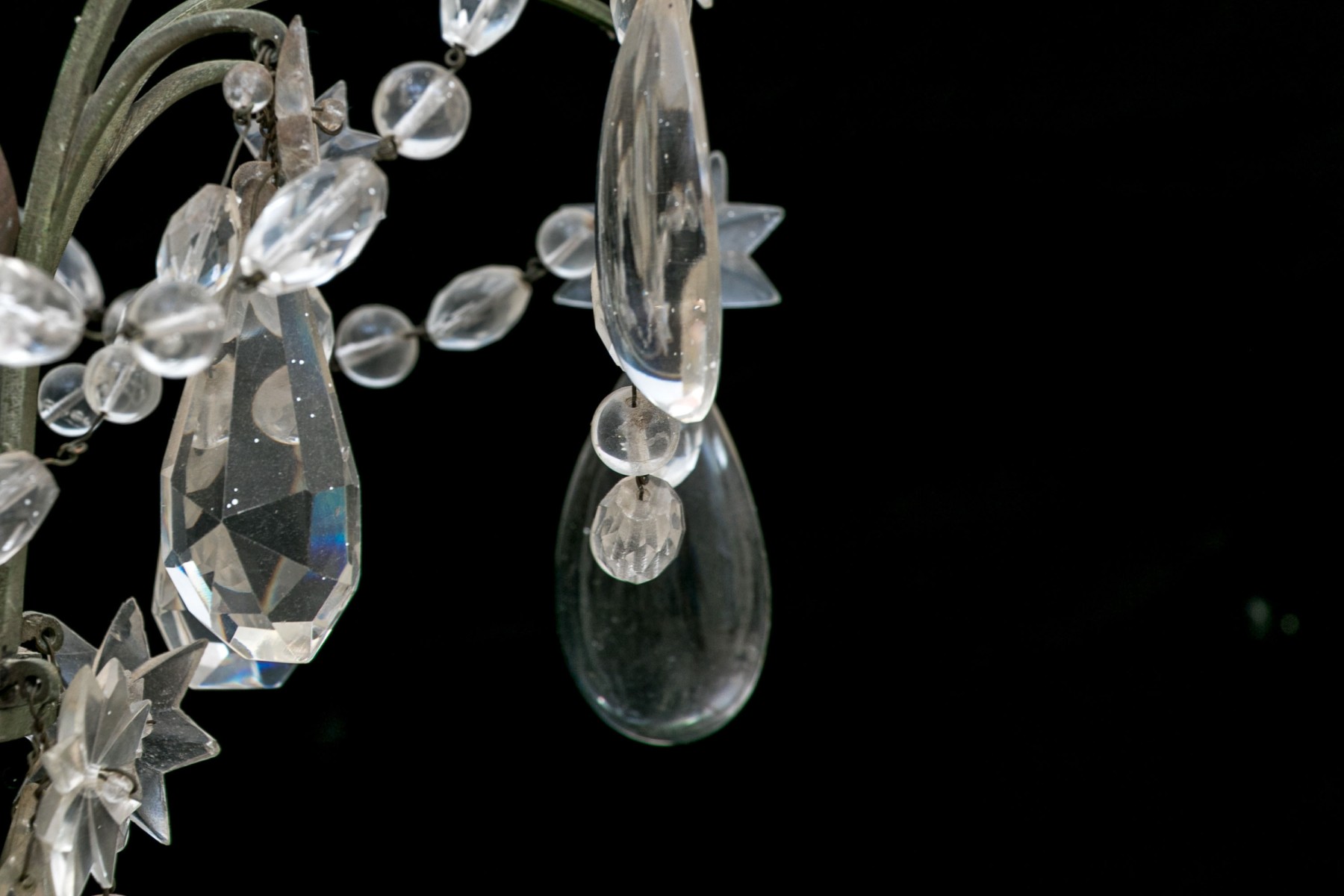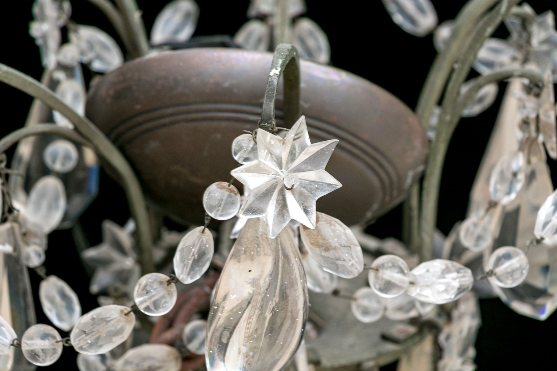 Condition: Exhibits heavy patina, and some crystal pendants may be missing, with potential chips present. These aspects contribute to the chandelier's vintage character, reflecting its age.