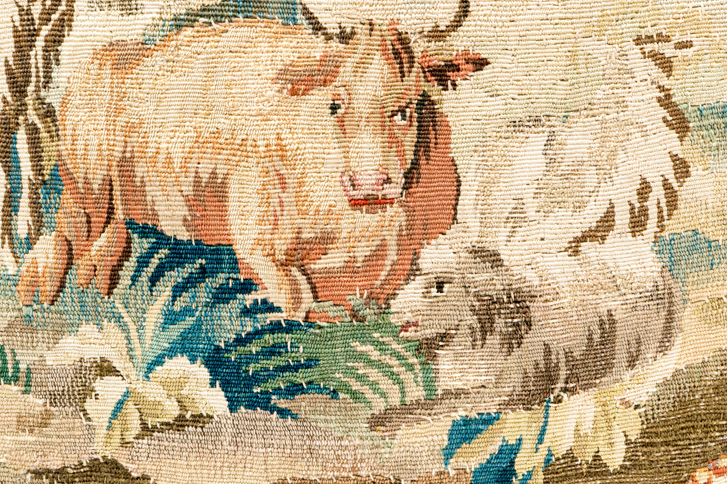 With red fringe around all sides and a central medallion with cattle and a goat in landscape.