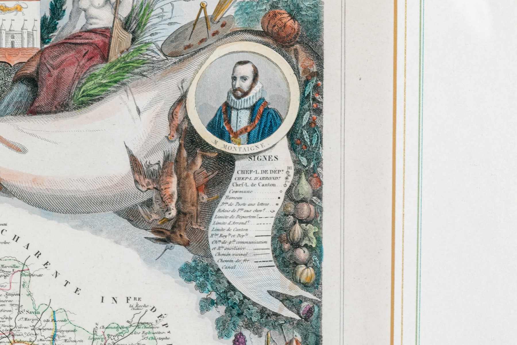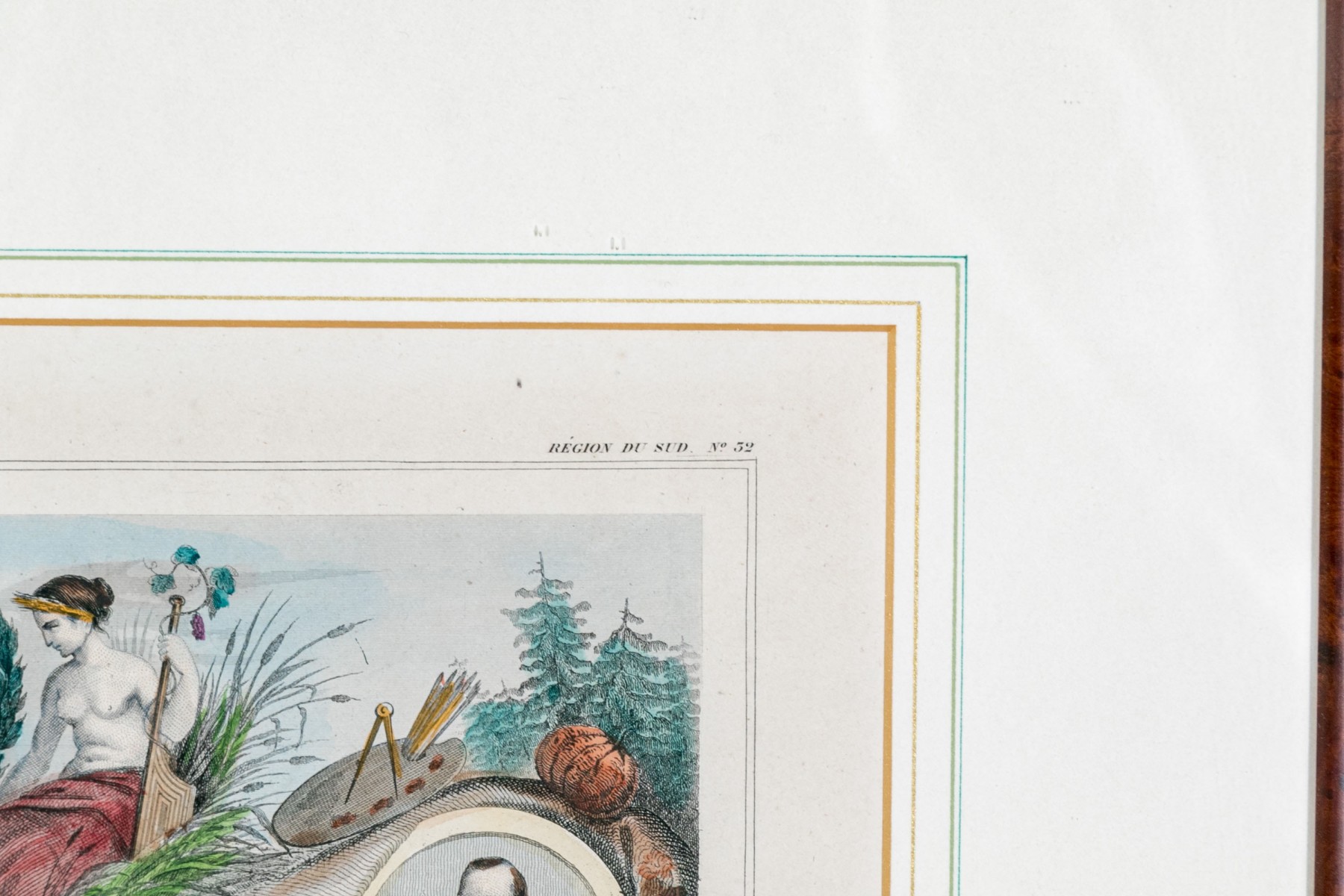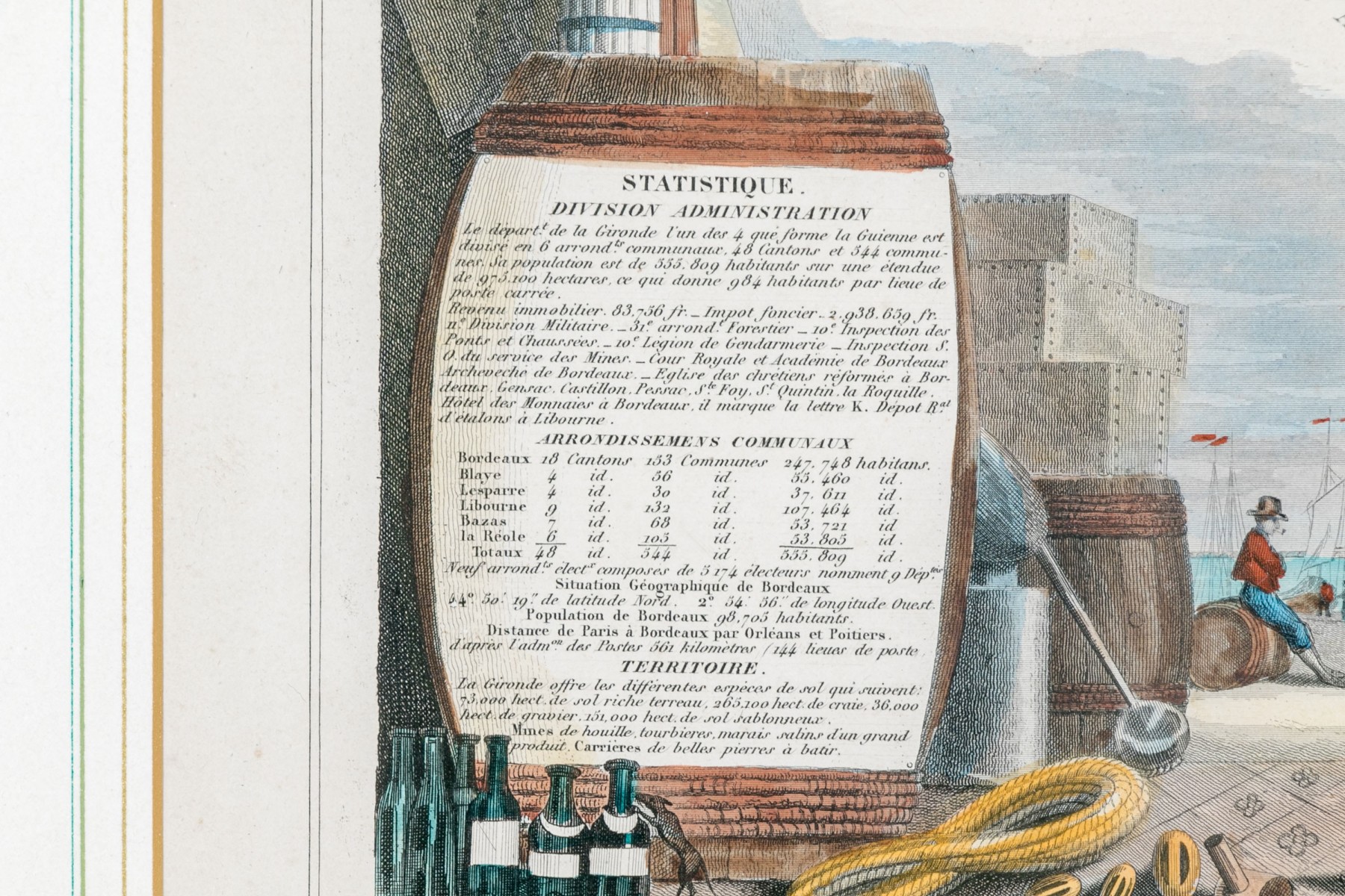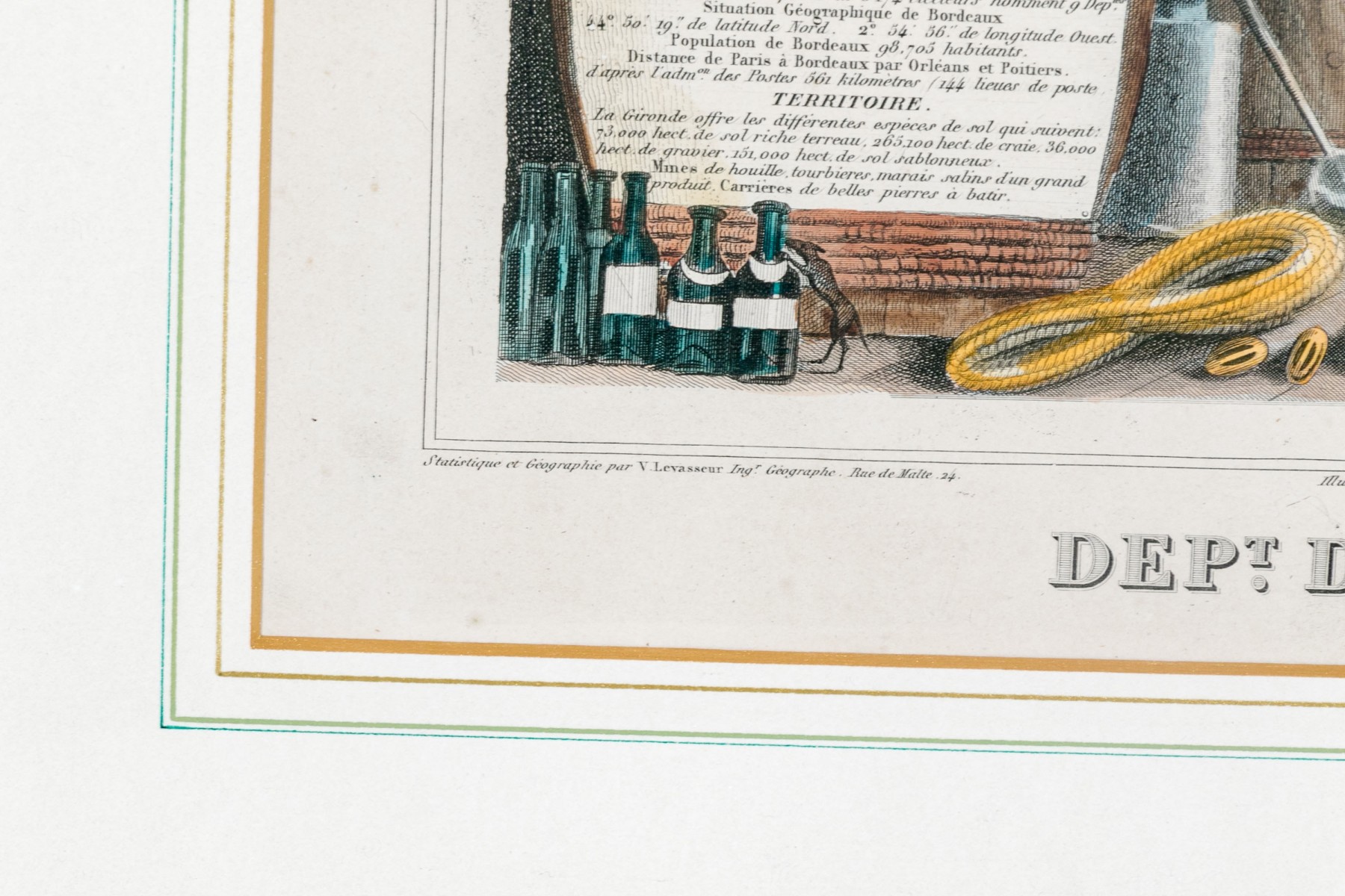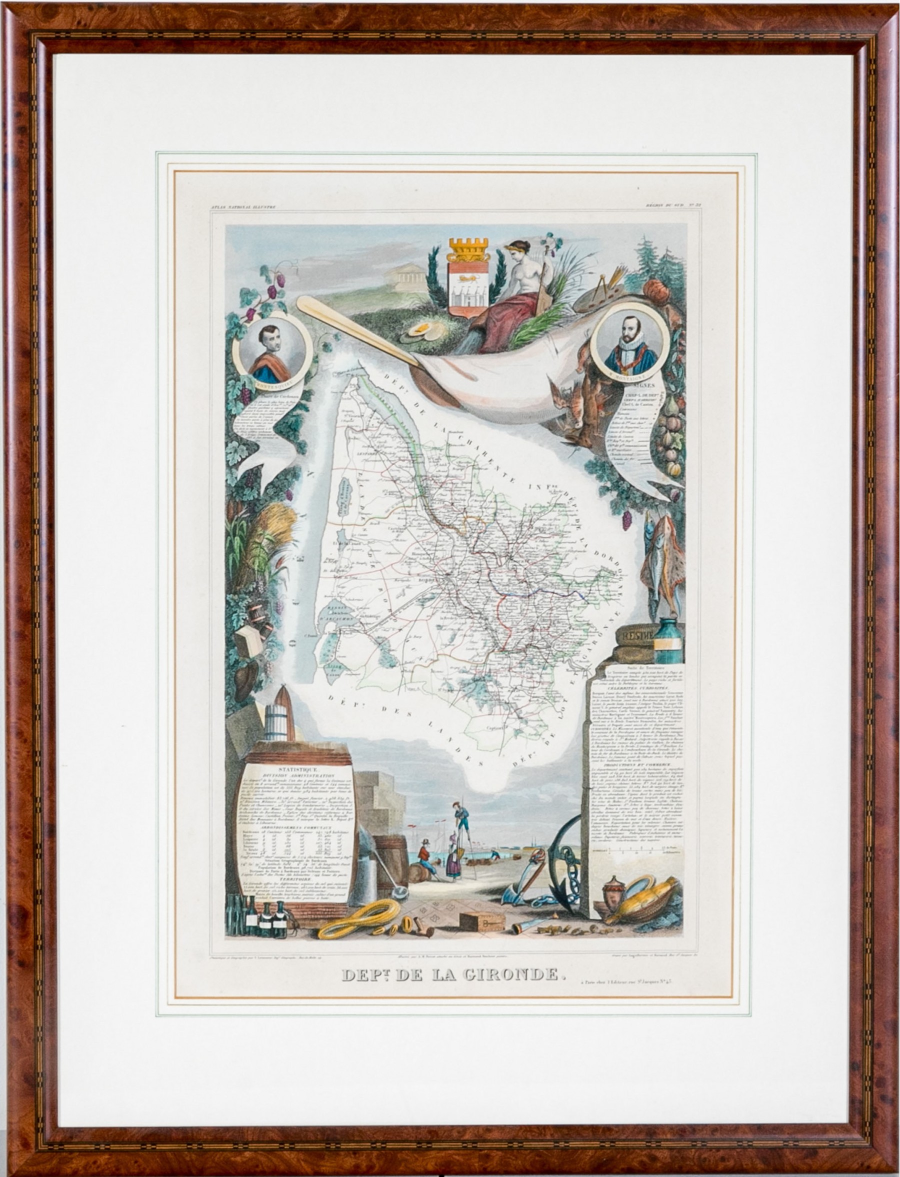 An antique colored map titled "Dept. De La Gironde" featuring the wine regions of France, is elegantly presented within a marquetry burled wood frame