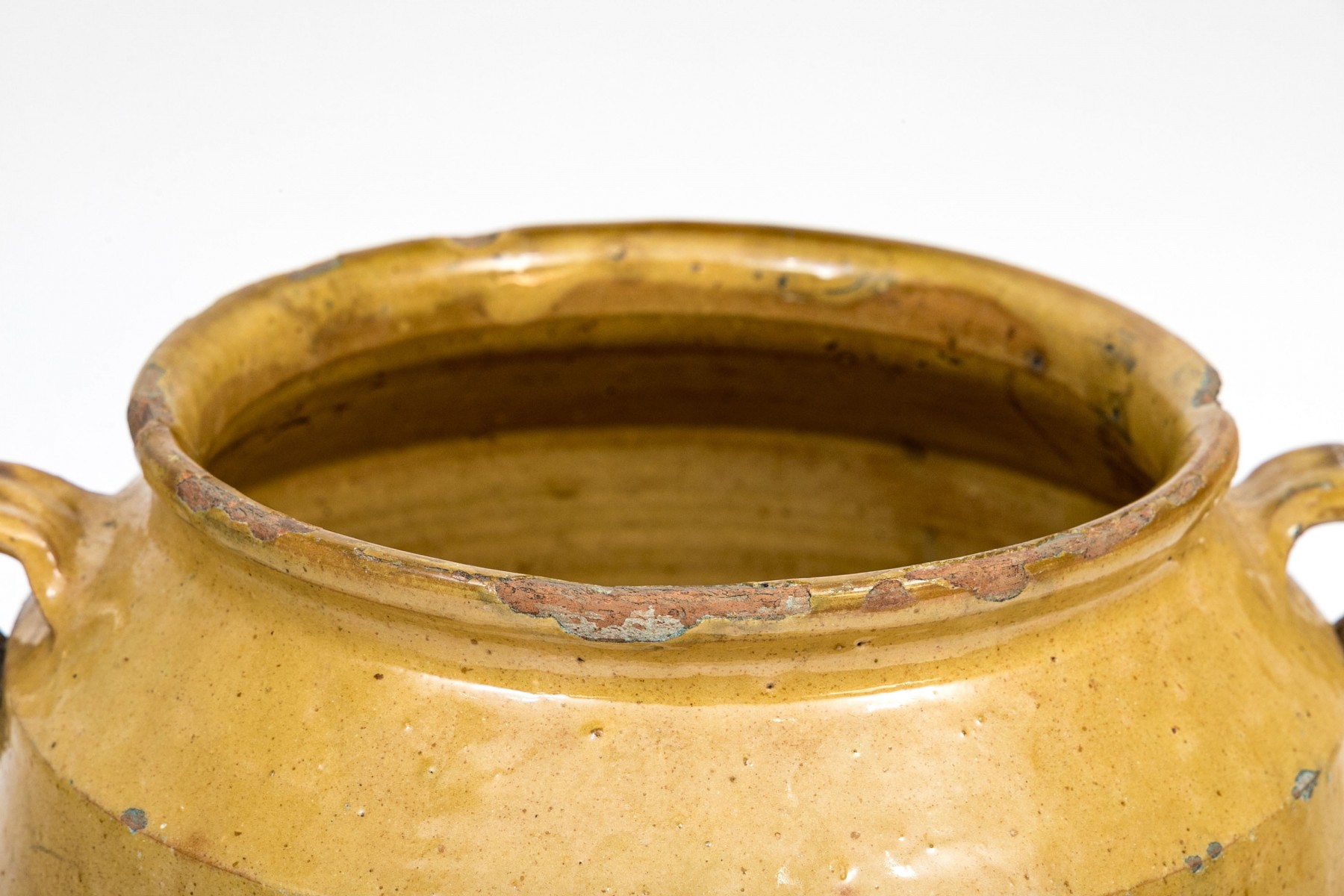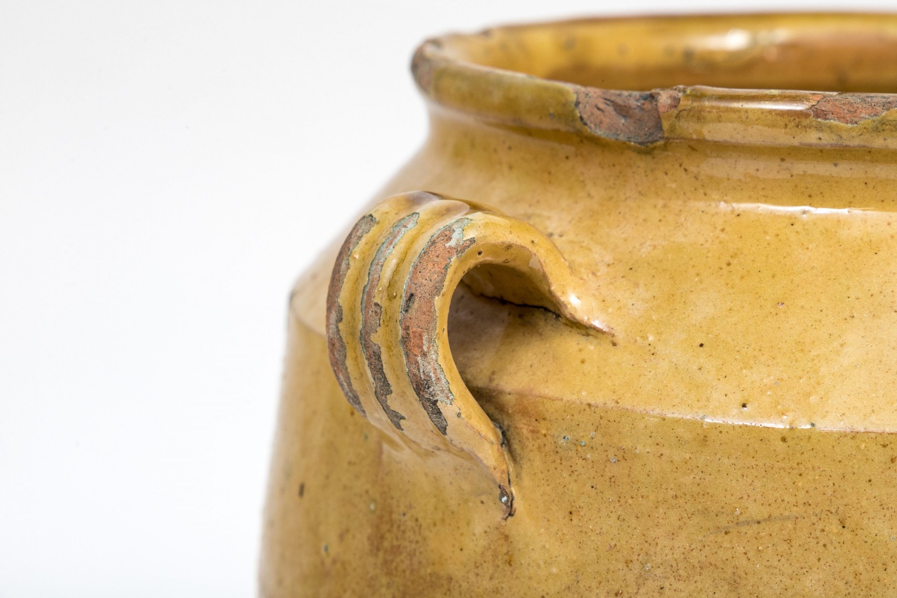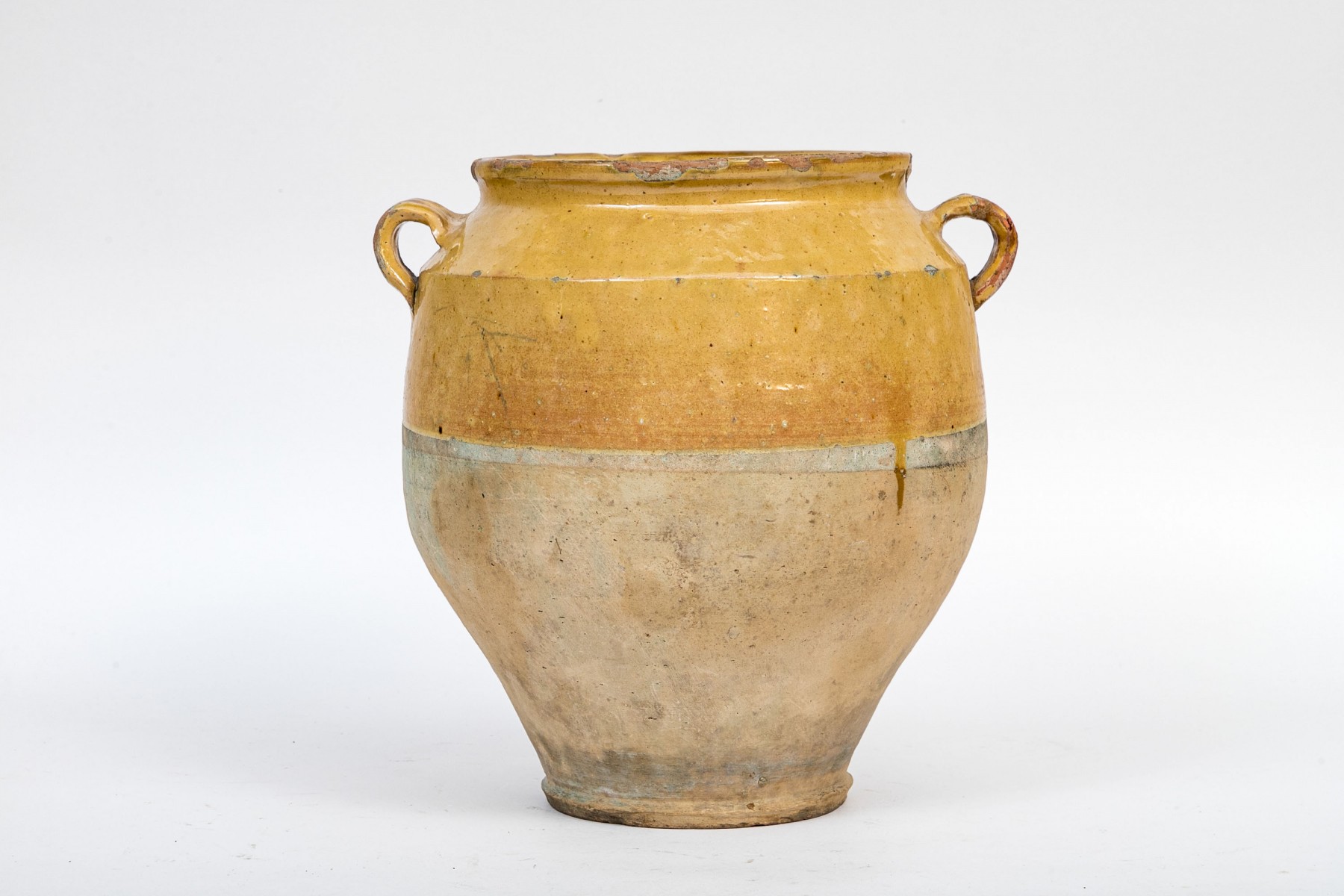A classic confit pot in yellow glaze on the upper part and unglazed pale terracotta tapering bottom part. With twin ridged handles.