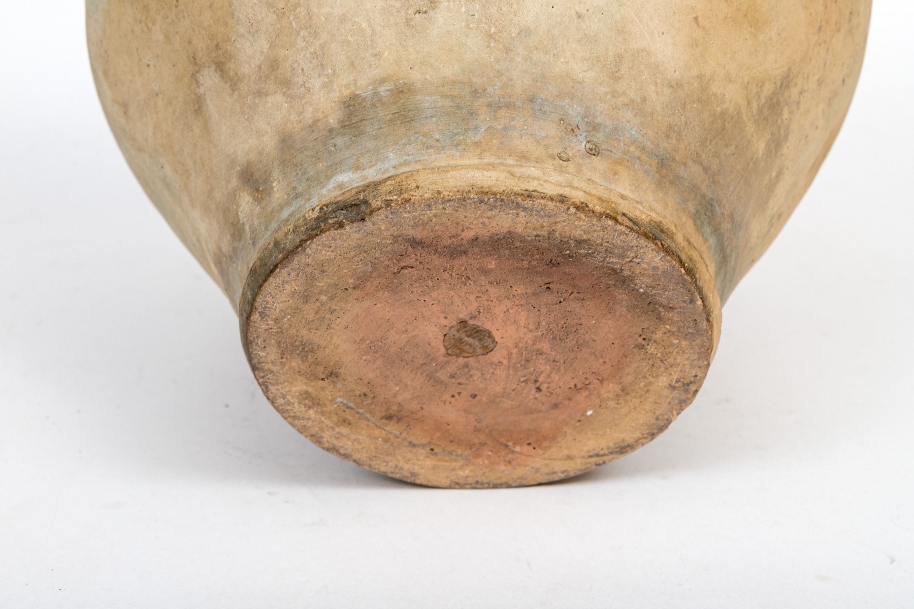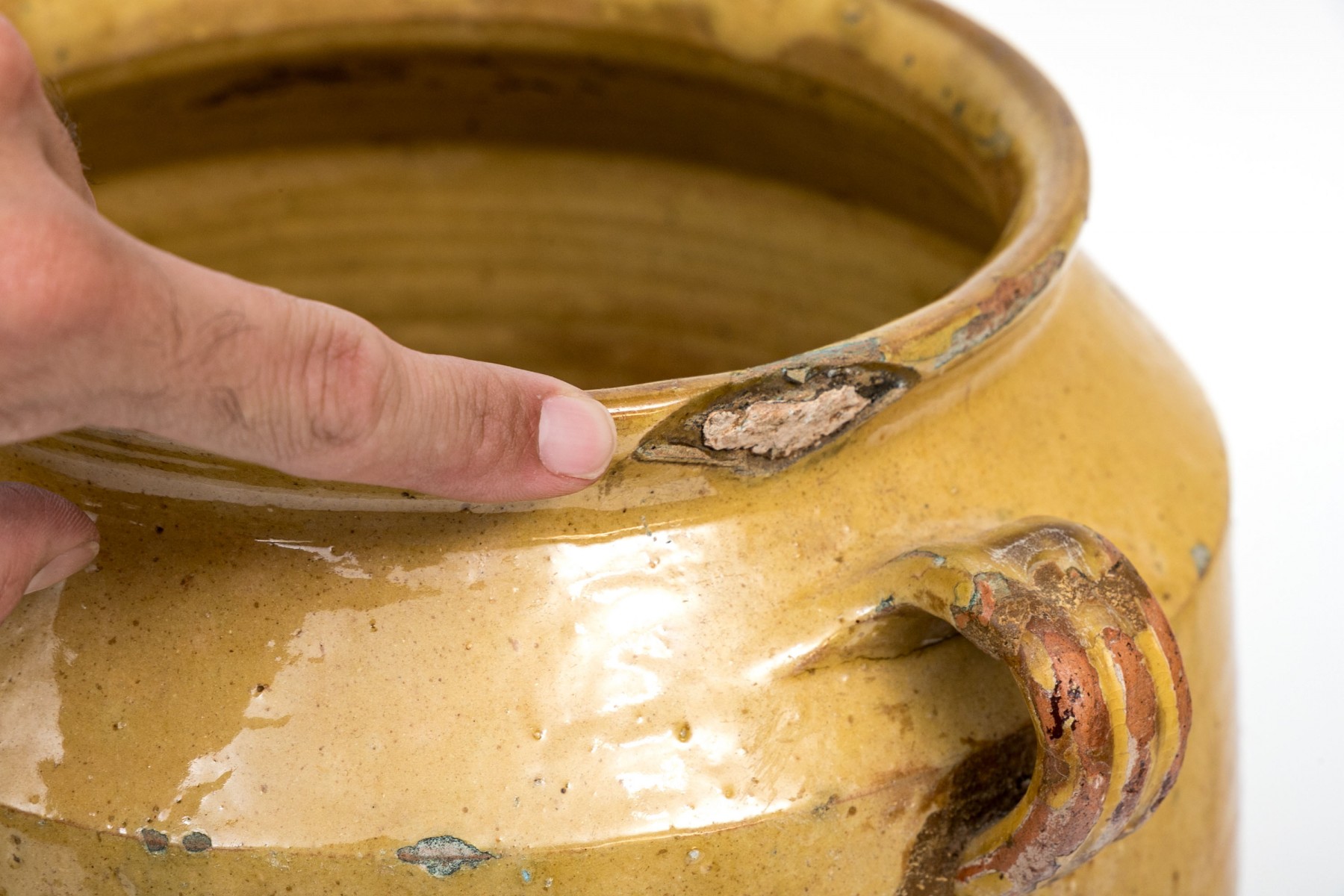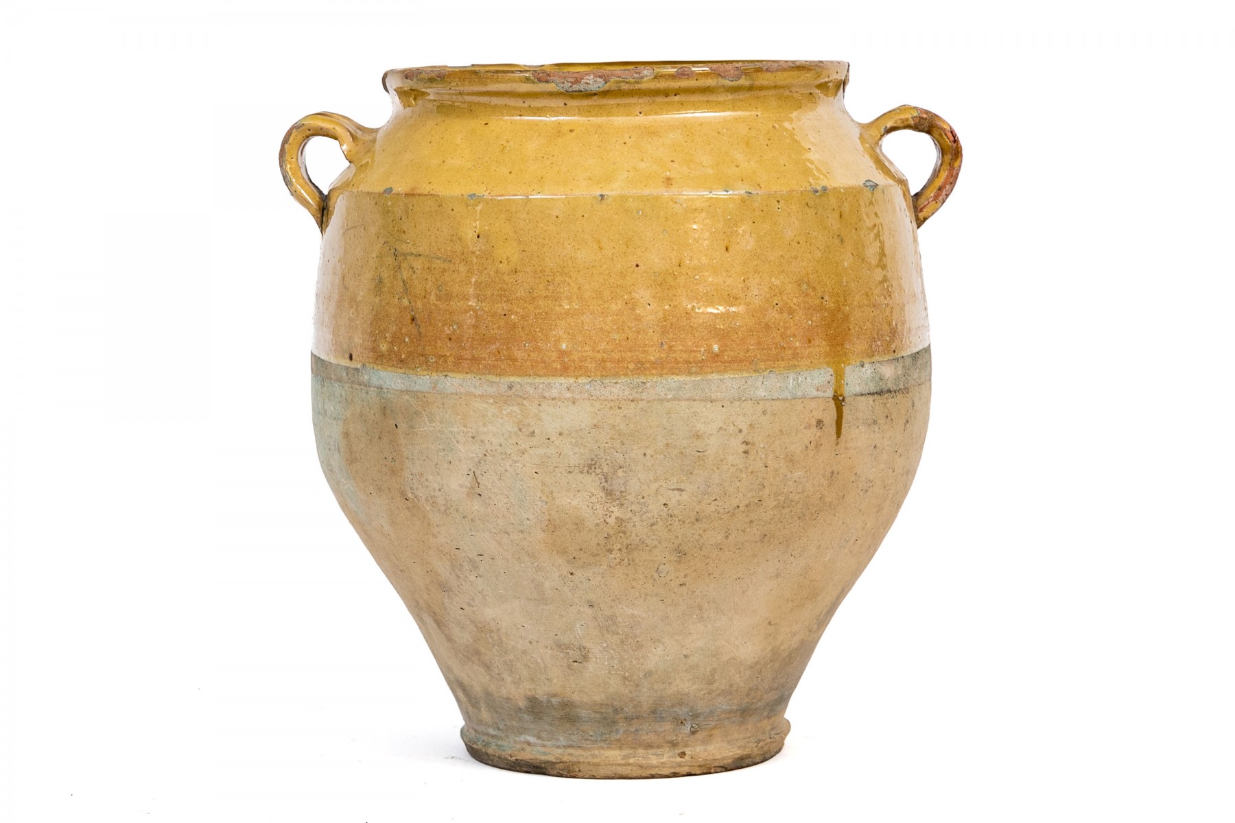 A classic confit pot in yellow glaze on the upper part and unglazed pale terracotta tapering bottom part. With twin ridged handles.