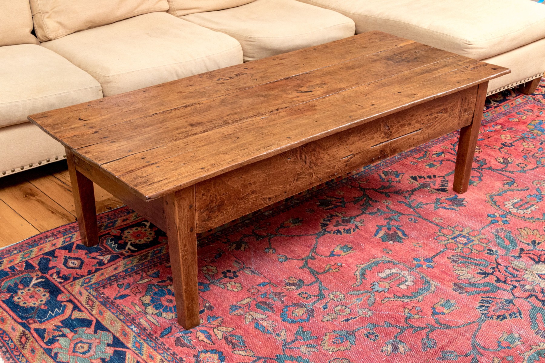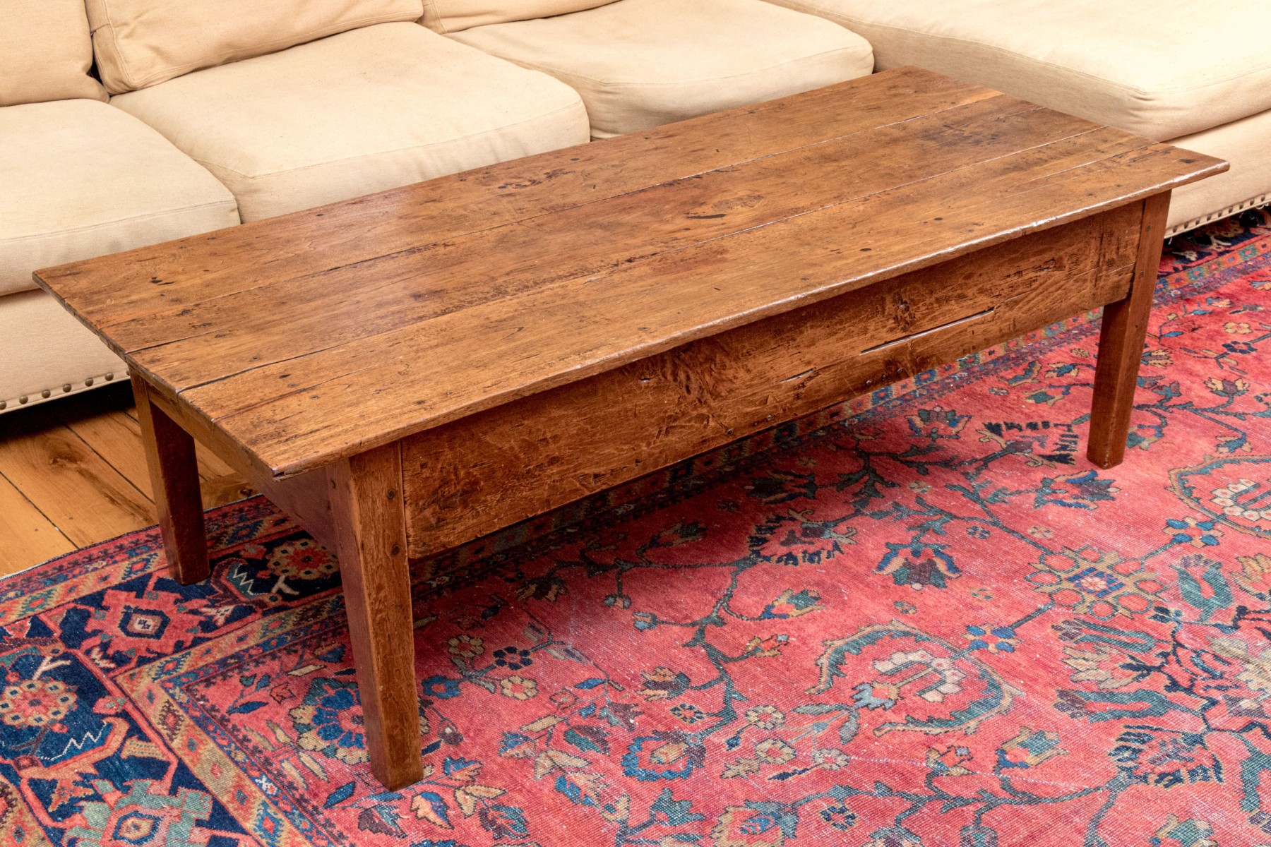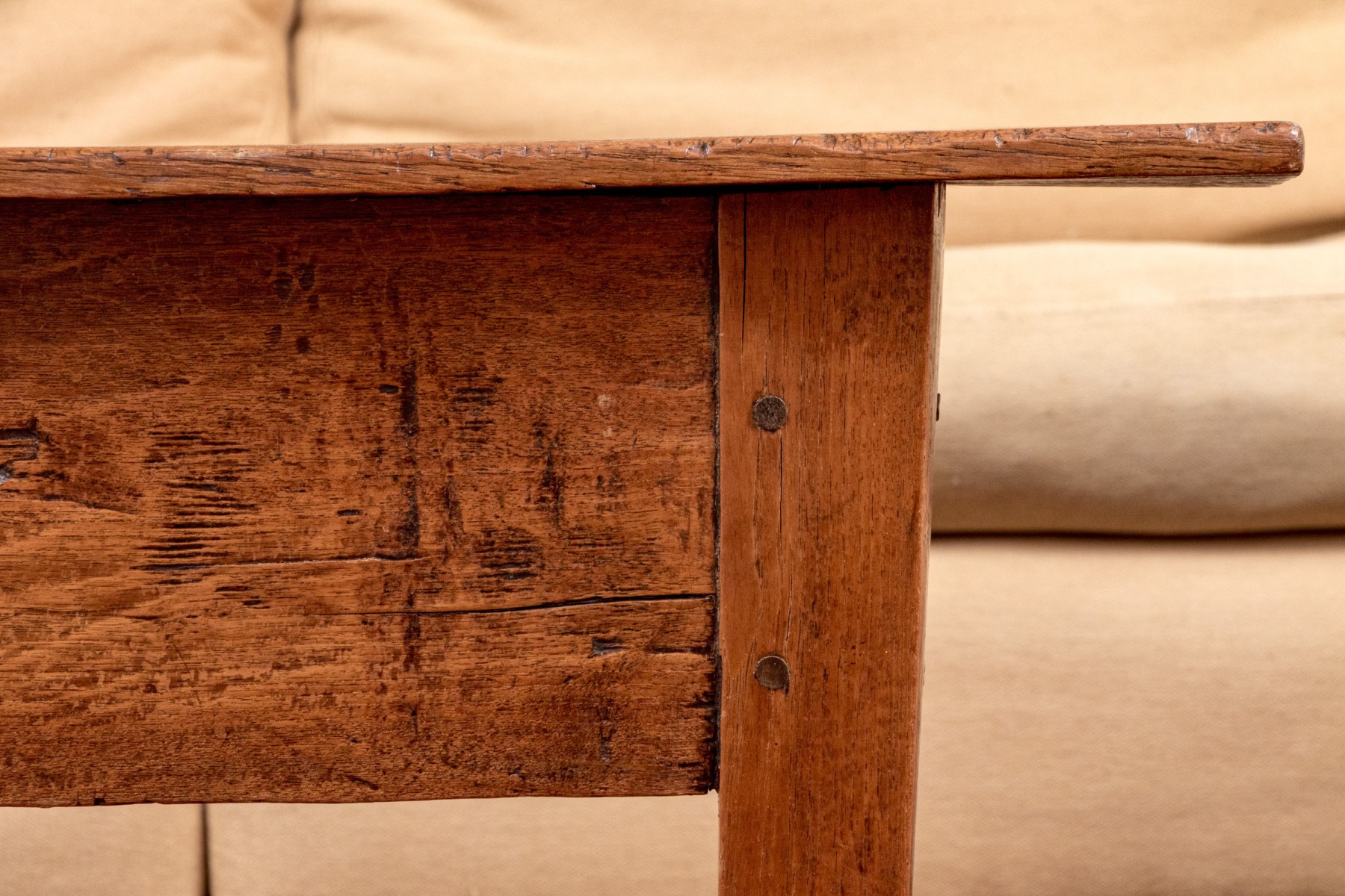 Raised in four squared legs? The table had wonderful rustic aesthetic with the handsomely finished fruitwood. The table is fitted with a single drawer with brass knob bull.