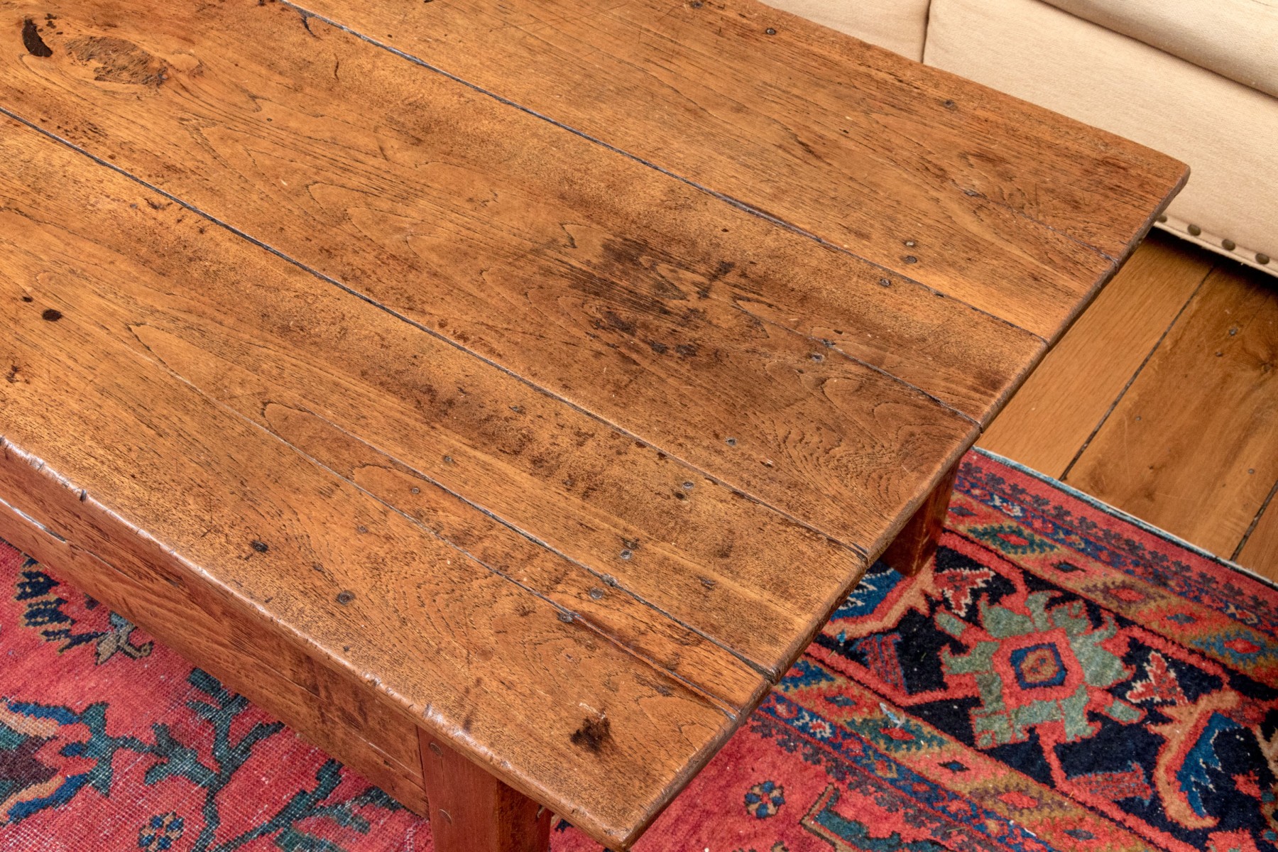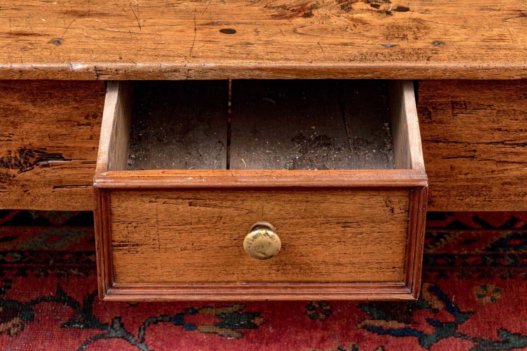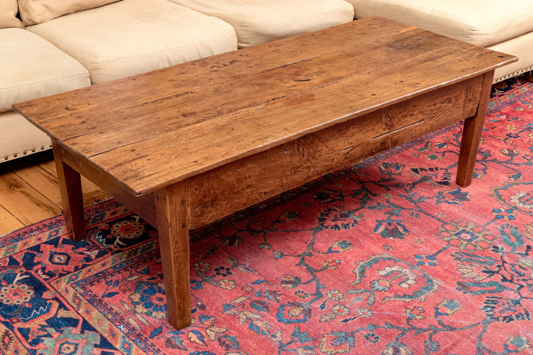 Raised in four squared legs? The table had wonderful rustic aesthetic with the handsomely finished fruitwood. The table is fitted with a single drawer with brass knob bull.