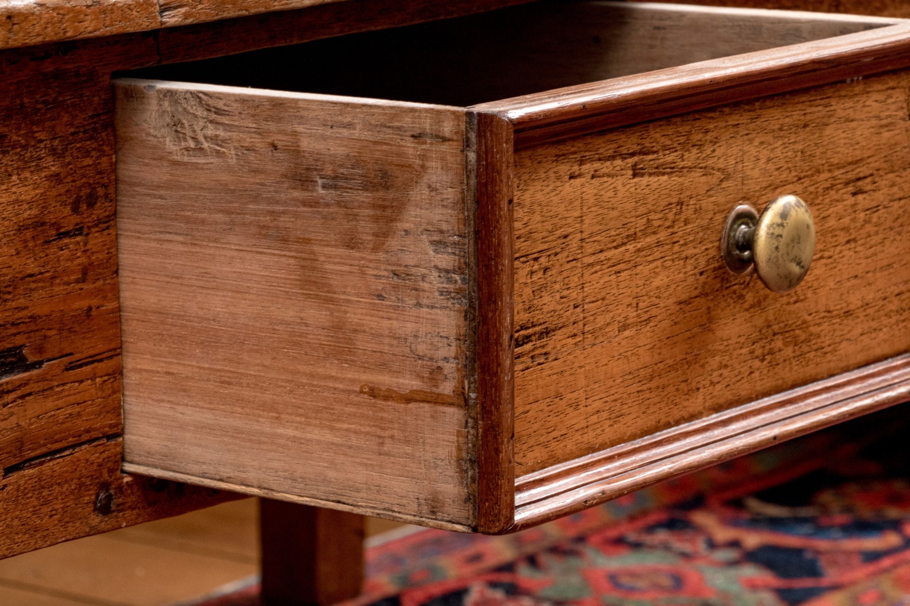 Slight splits and wear to the finish but presents handsomely overall. Drawer has some splits and losses to the interior.