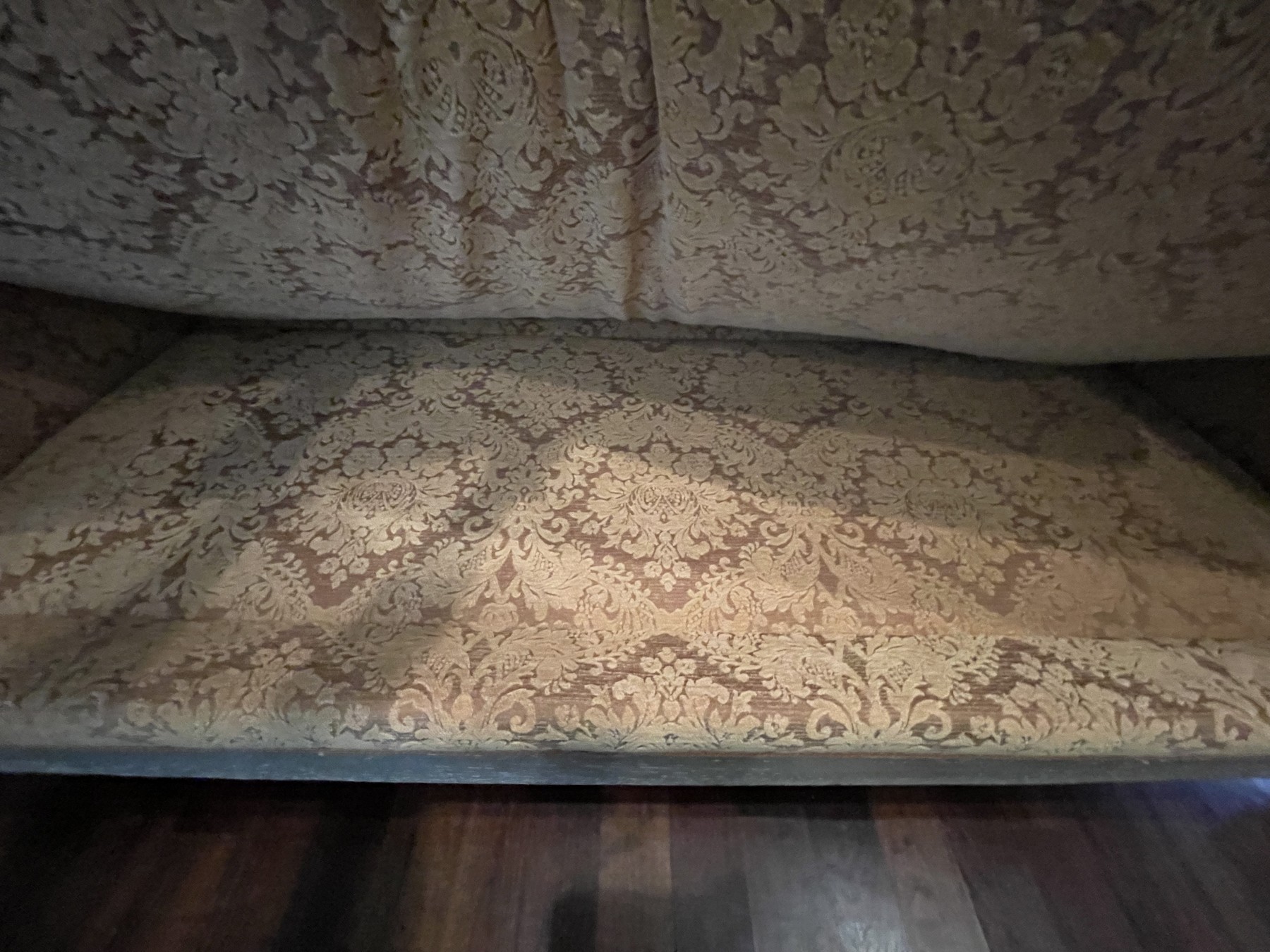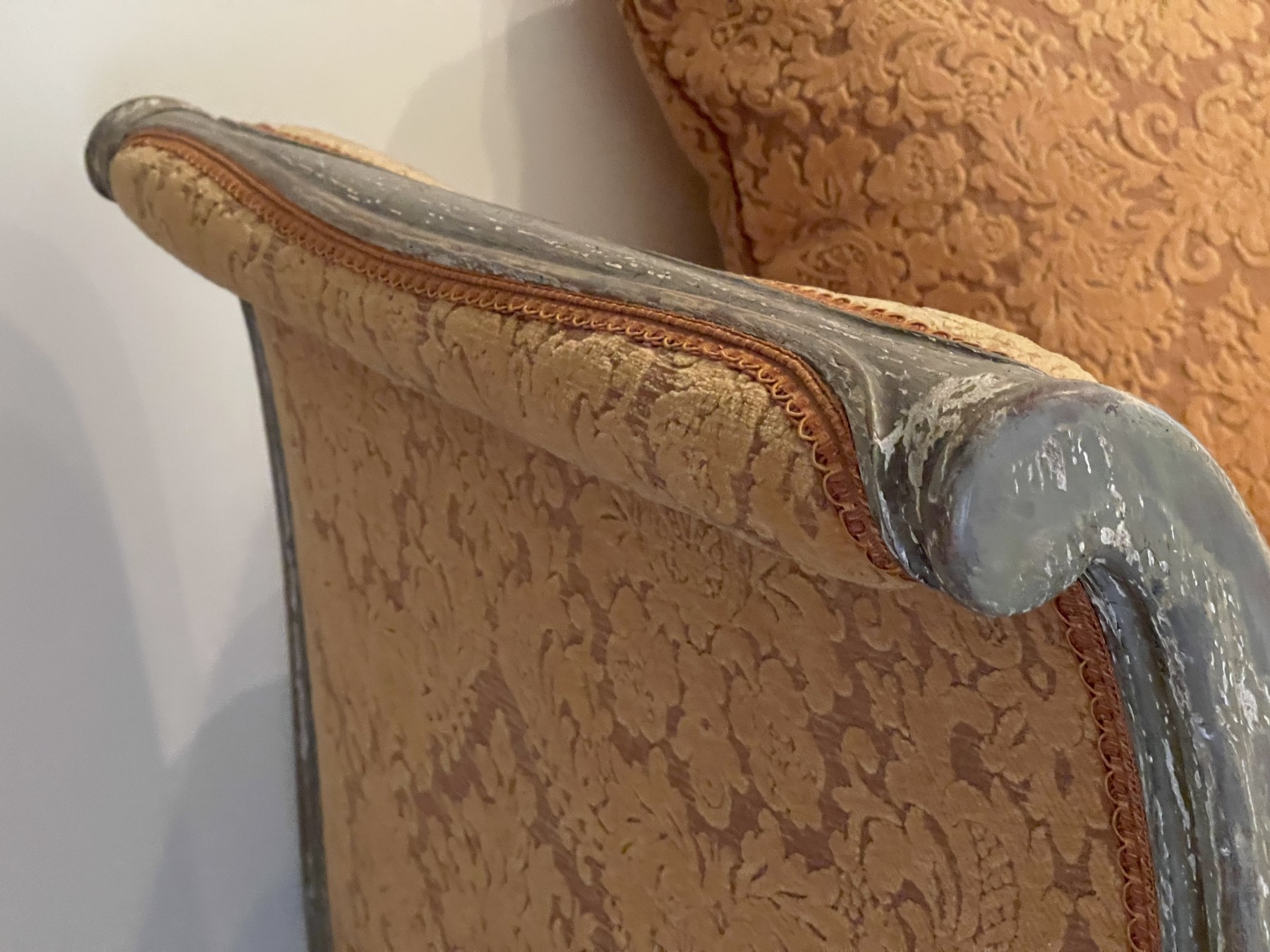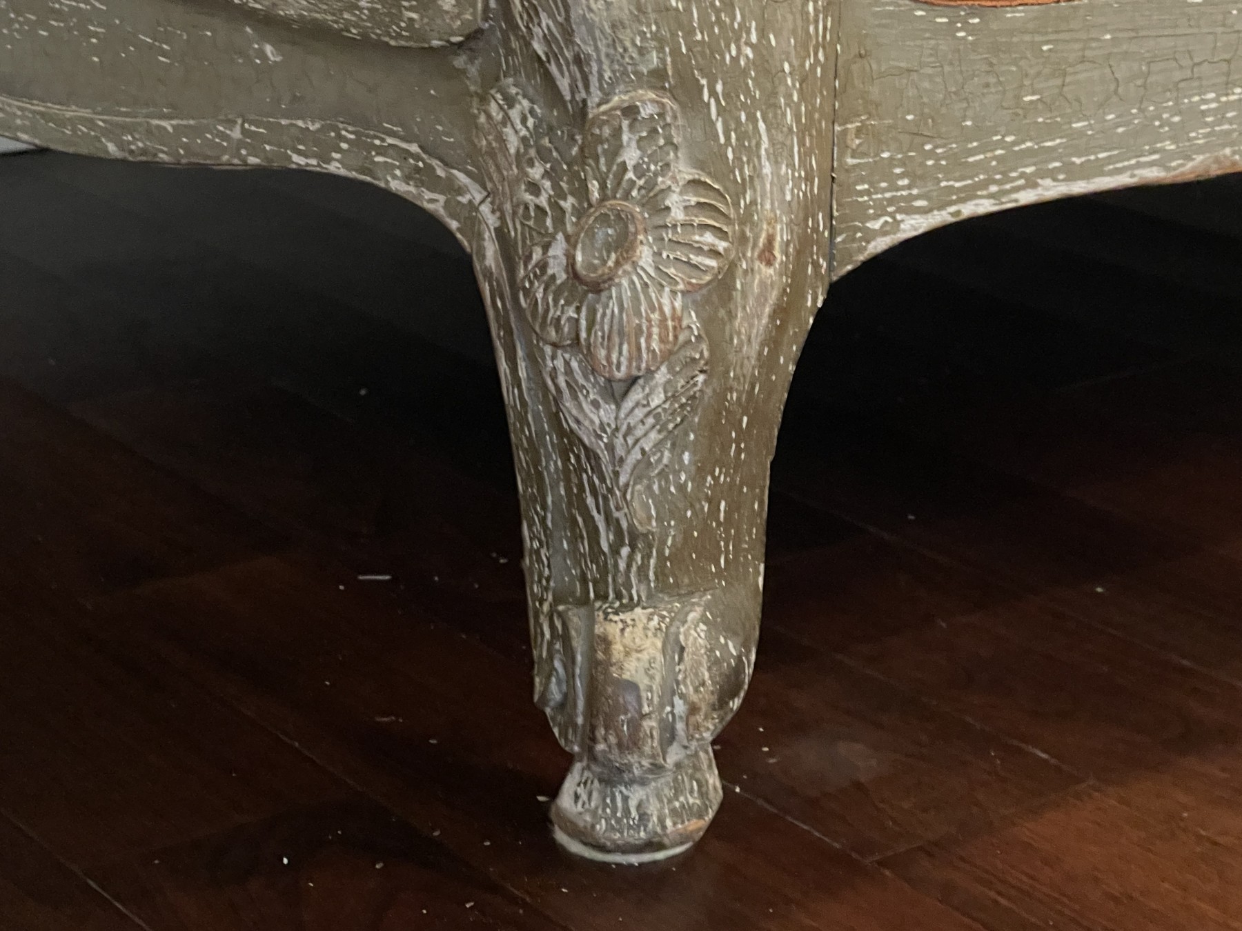 The settee has two back pillows and two corner round pillows with curved grey painted sides. The knees have beautiful floral medallions and the whole is raised on hoof feet.