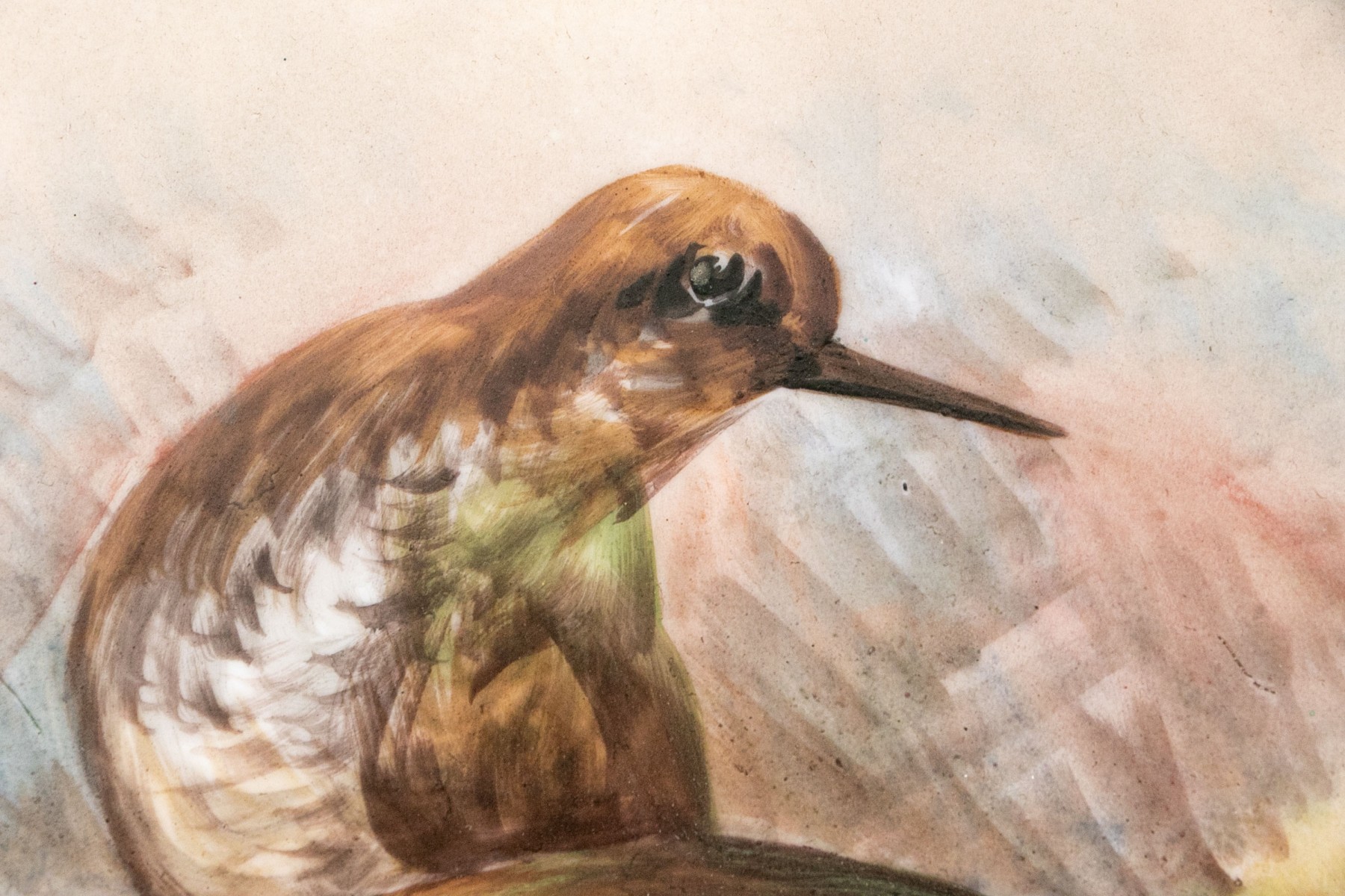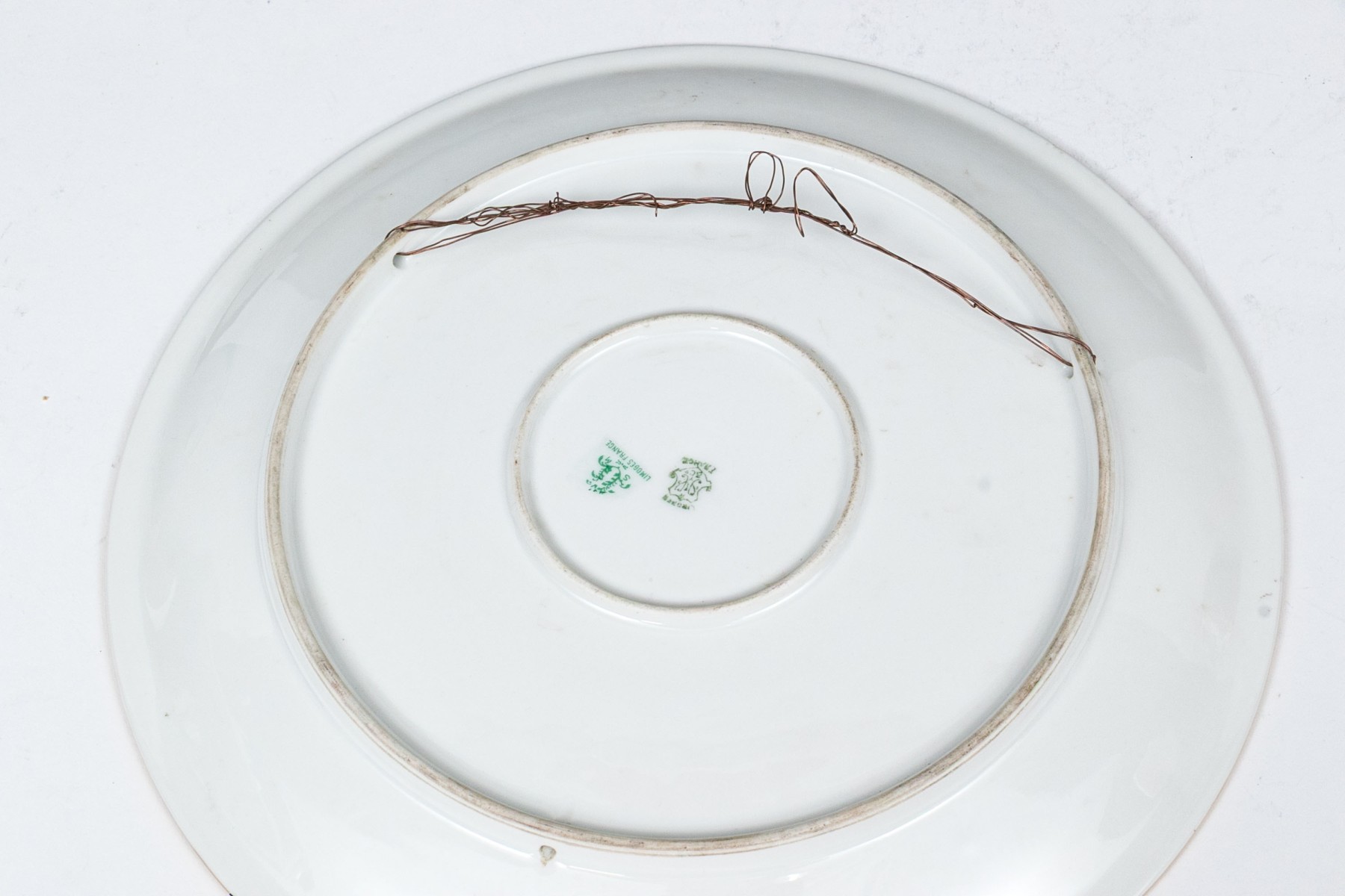 Depicting two brown birds perched on the ground in a landscape with pastel hues. The charger has a gilt finished trim edge. The charger stands on a circular foot ring with interior smaller foot ring. The charger is marked Limoge France underfoot and has pierced foot ring strung with wire to hang on the wall as display.