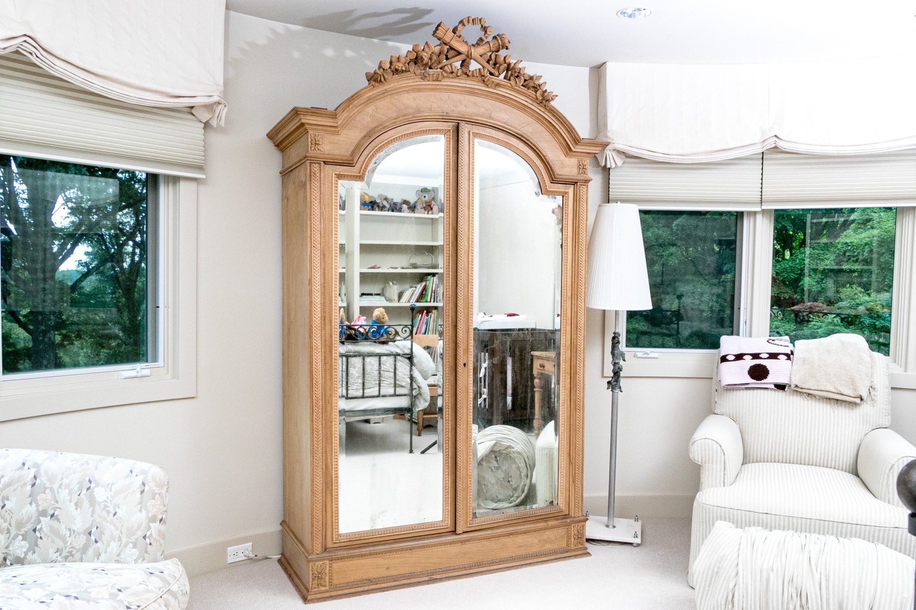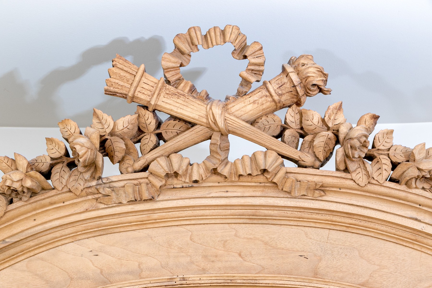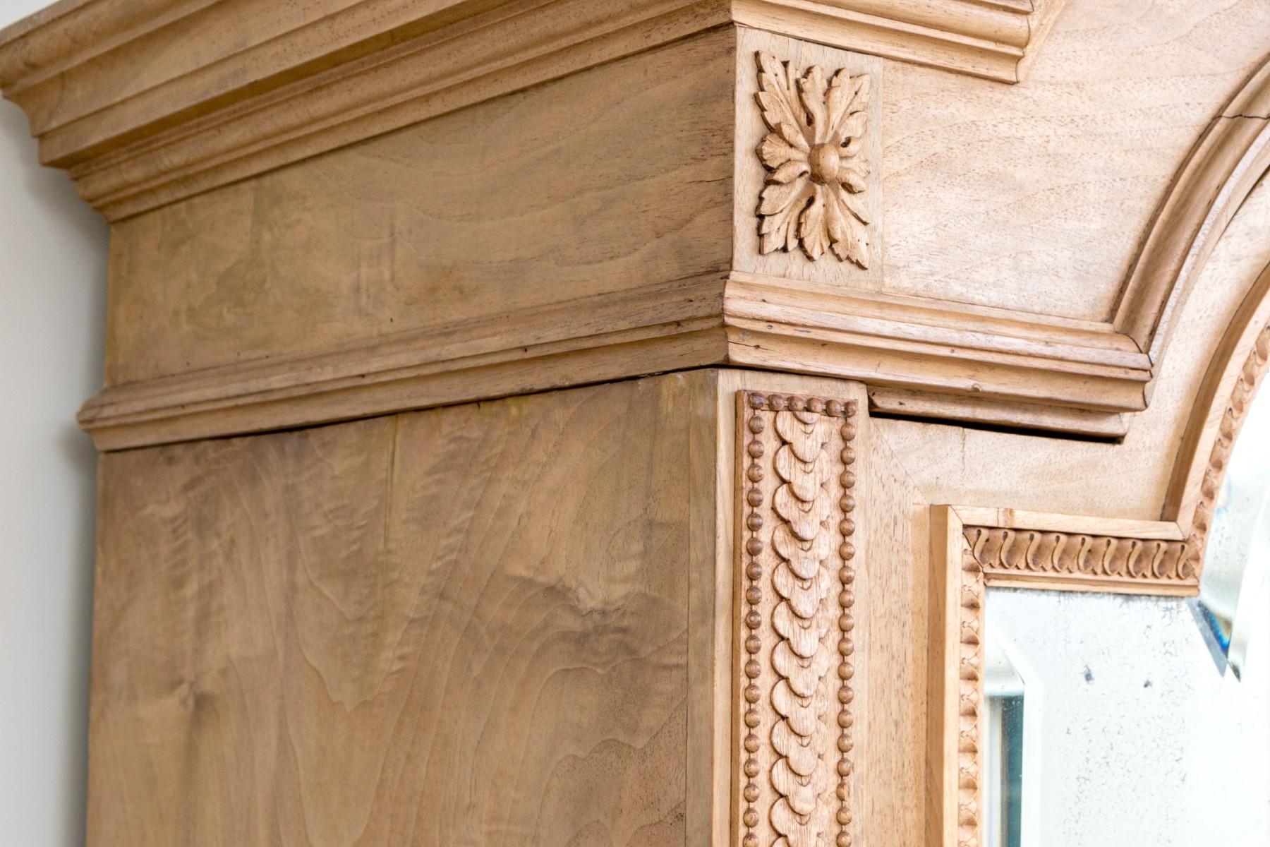 An exceptional French Louis XV Armoire, circa 1890-1910 in natural blonde walnut. Features a high-arched bonnet top with a gorgeous crest carved with torches, ribbons, and foliate garlands. two tall doors follow the form of the bonnet, detailed with mirror panels and carved foliate borders. The doors are lined in birdseye maple veneers, heralding a shelved interior. The exterior posts are topped with rectangular carved floral medallions, complemented by columns of petaled tessellations. An elegantly designed and beautifully crafted piece with fine attention to detail.