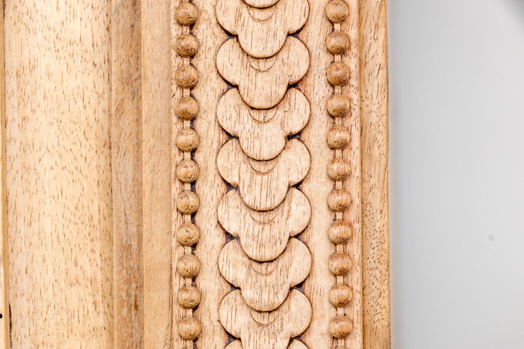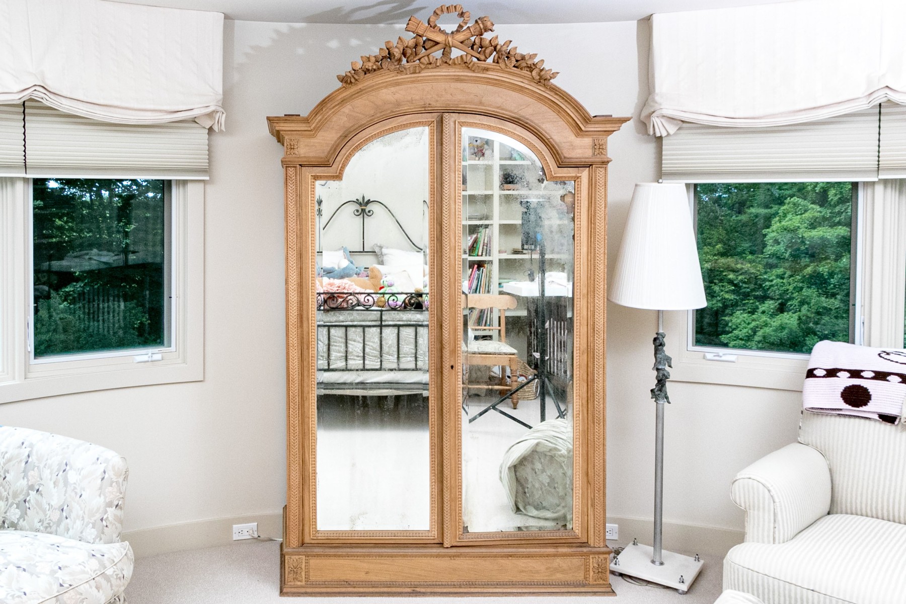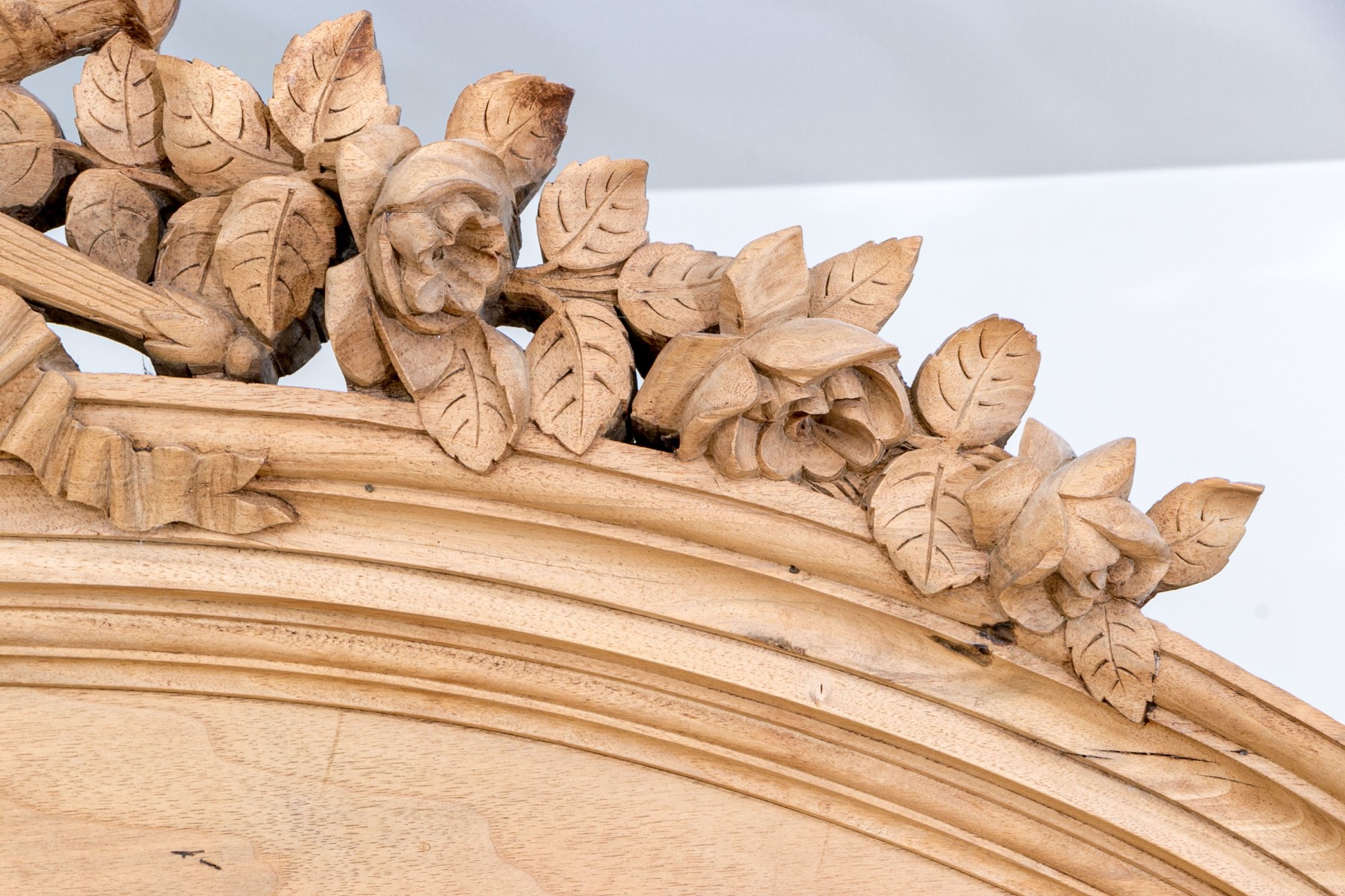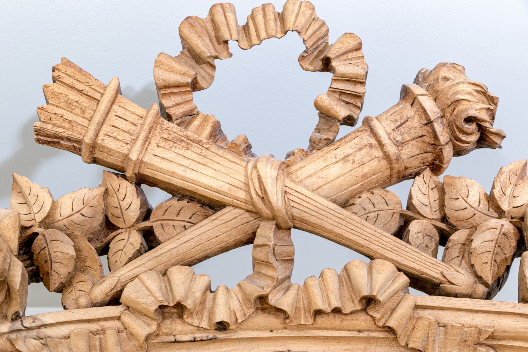 An exceptional French Louis XV Armoire, circa 1890-1910 in natural blonde walnut. Features a high-arched bonnet top with a gorgeous crest carved with torches, ribbons, and foliate garlands. two tall doors follow the form of the bonnet, detailed with mirror panels and carved foliate borders. The doors are lined in birdseye maple veneers, heralding a shelved interior. The exterior posts are topped with rectangular carved floral medallions, complemented by columns of petaled tessellations. An elegantly designed and beautifully crafted piece with fine attention to detail.