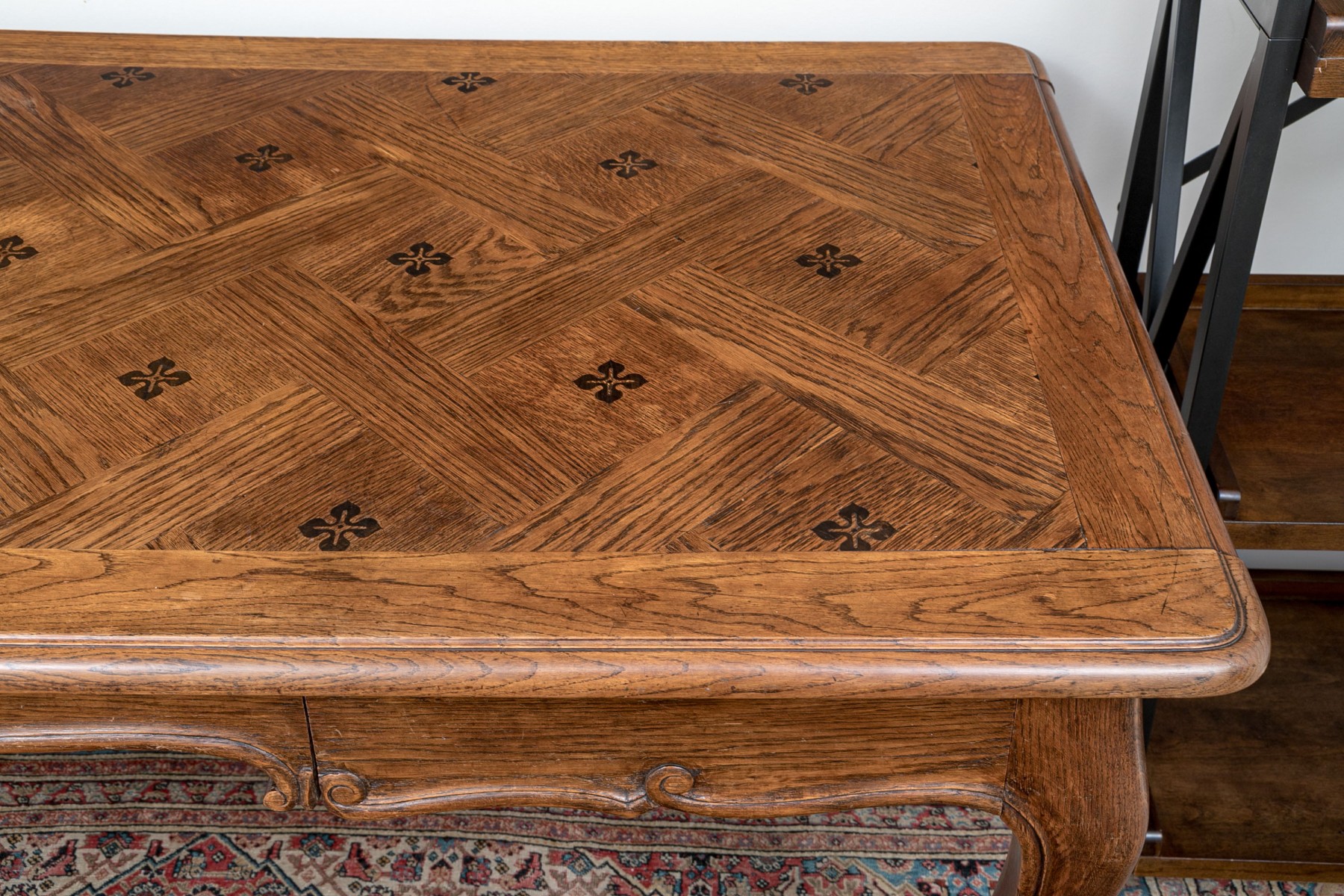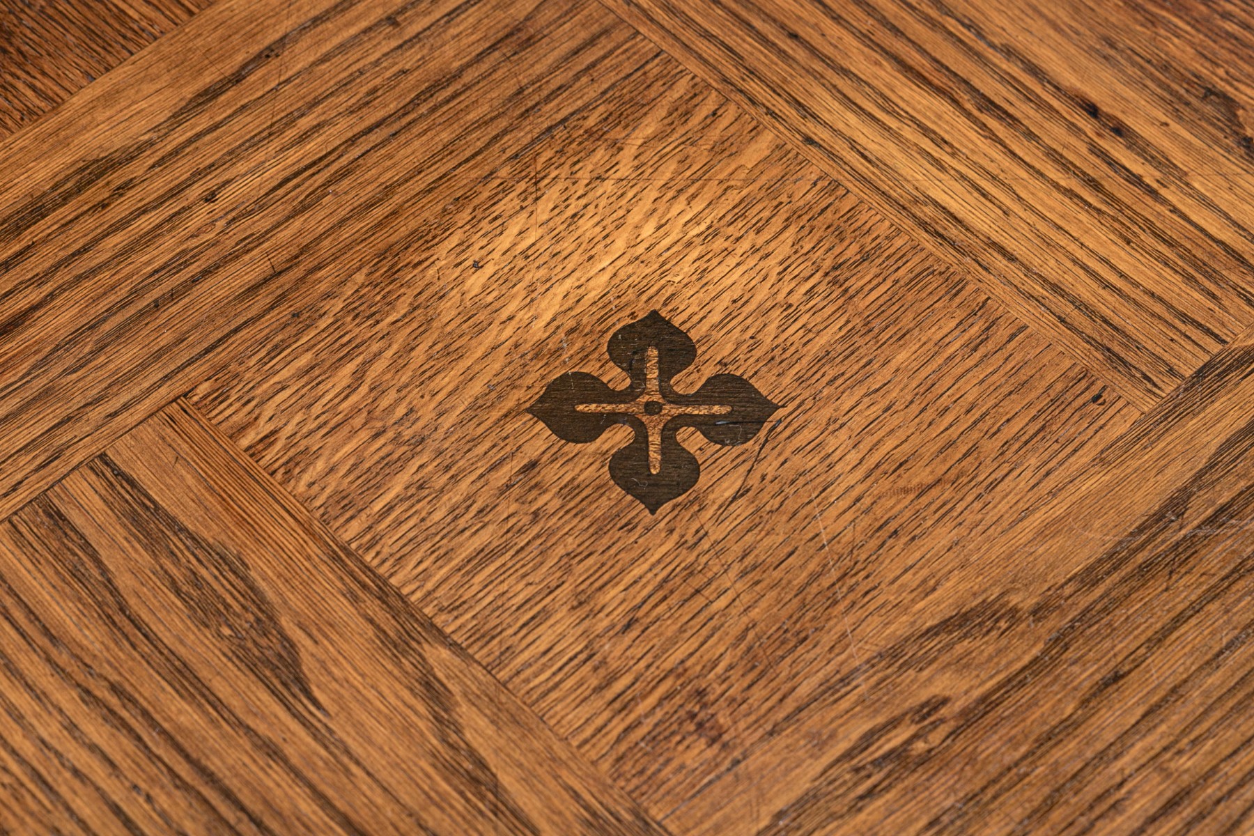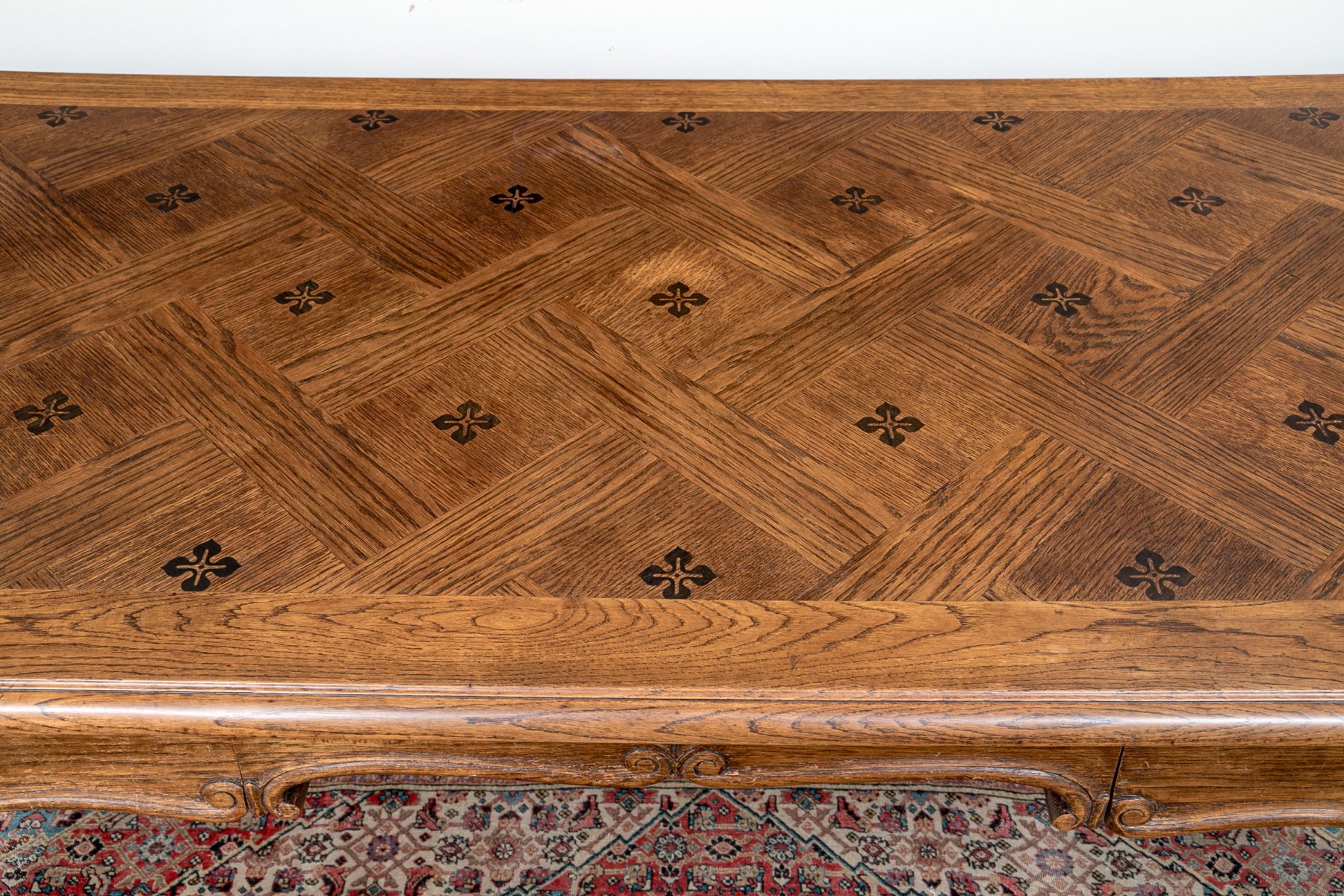 The table top with inlaid ebonized quatrefoil motifs on parquet style inlaid field.